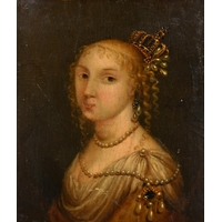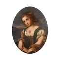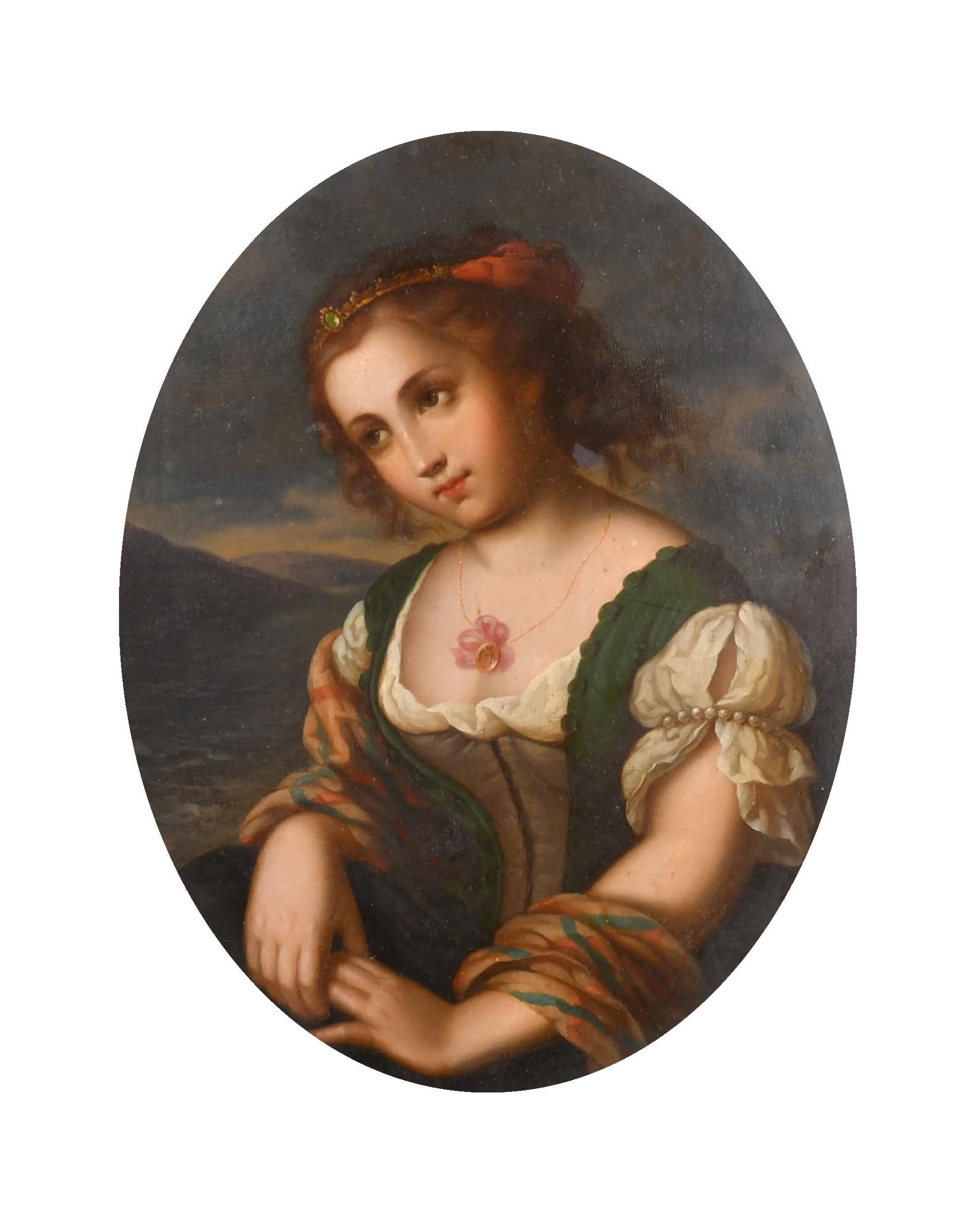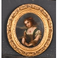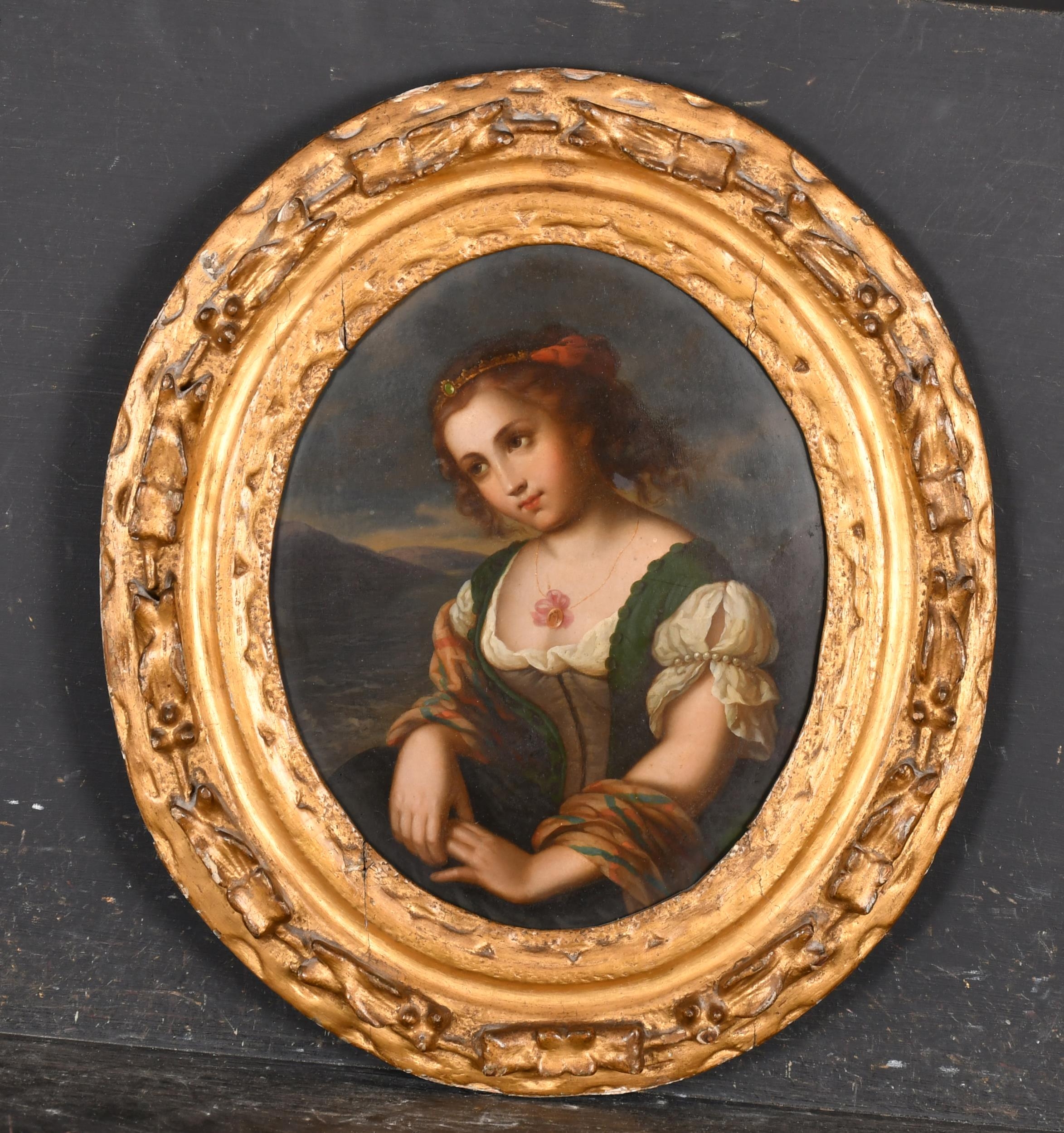 19th Century European School. Half Length Portrait of a Seated Girl, Oil on metal, In a carved giltwood frame, Oval 12.25" x 10.75" (31.1 x 27.3cm)