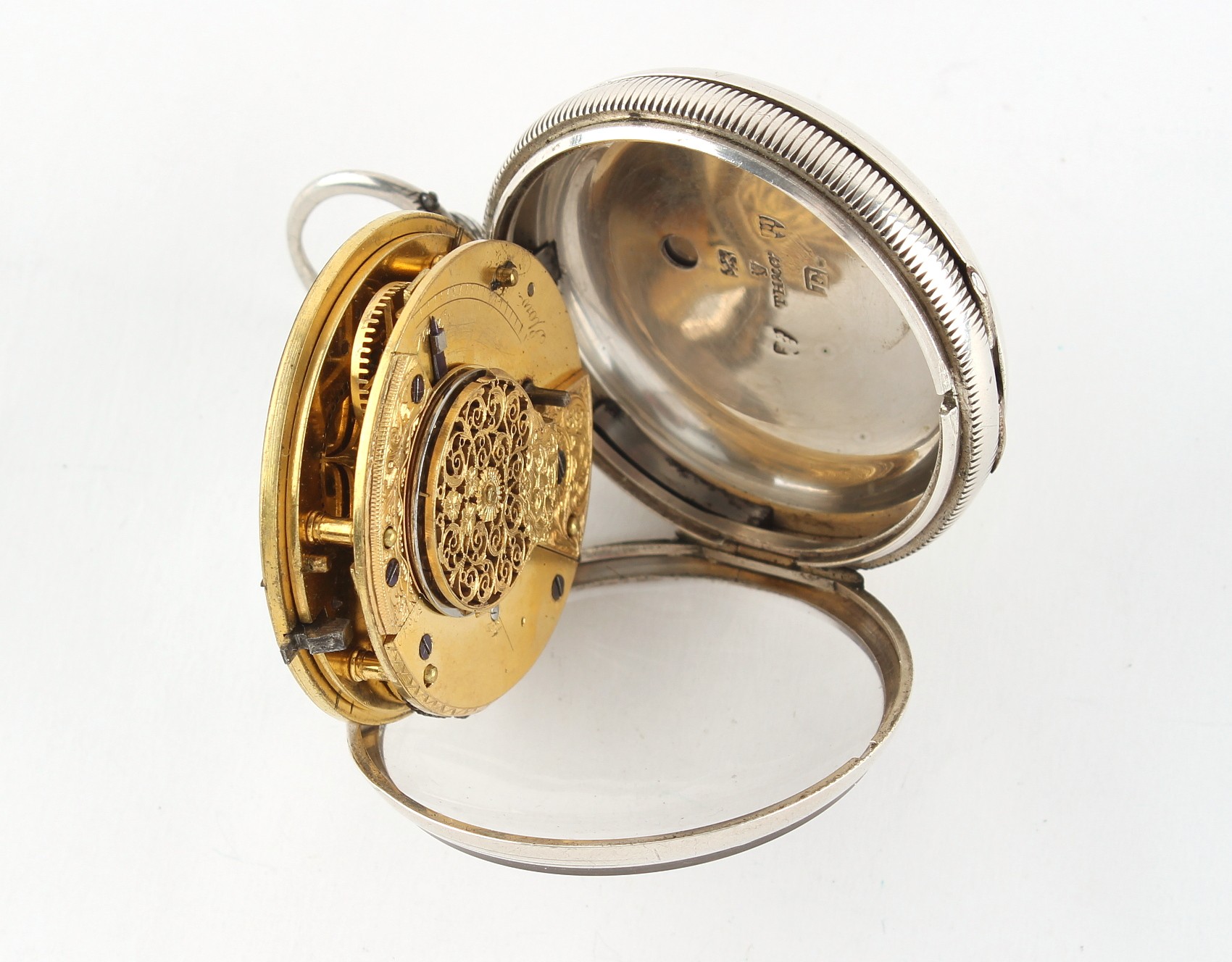 Property of a gentleman - a George III silver open faced pocket watch, with unsigned verge fusee movement, case hallmarked Chester 1801, appears to be working but no guarantees are given, 51mm diameter.