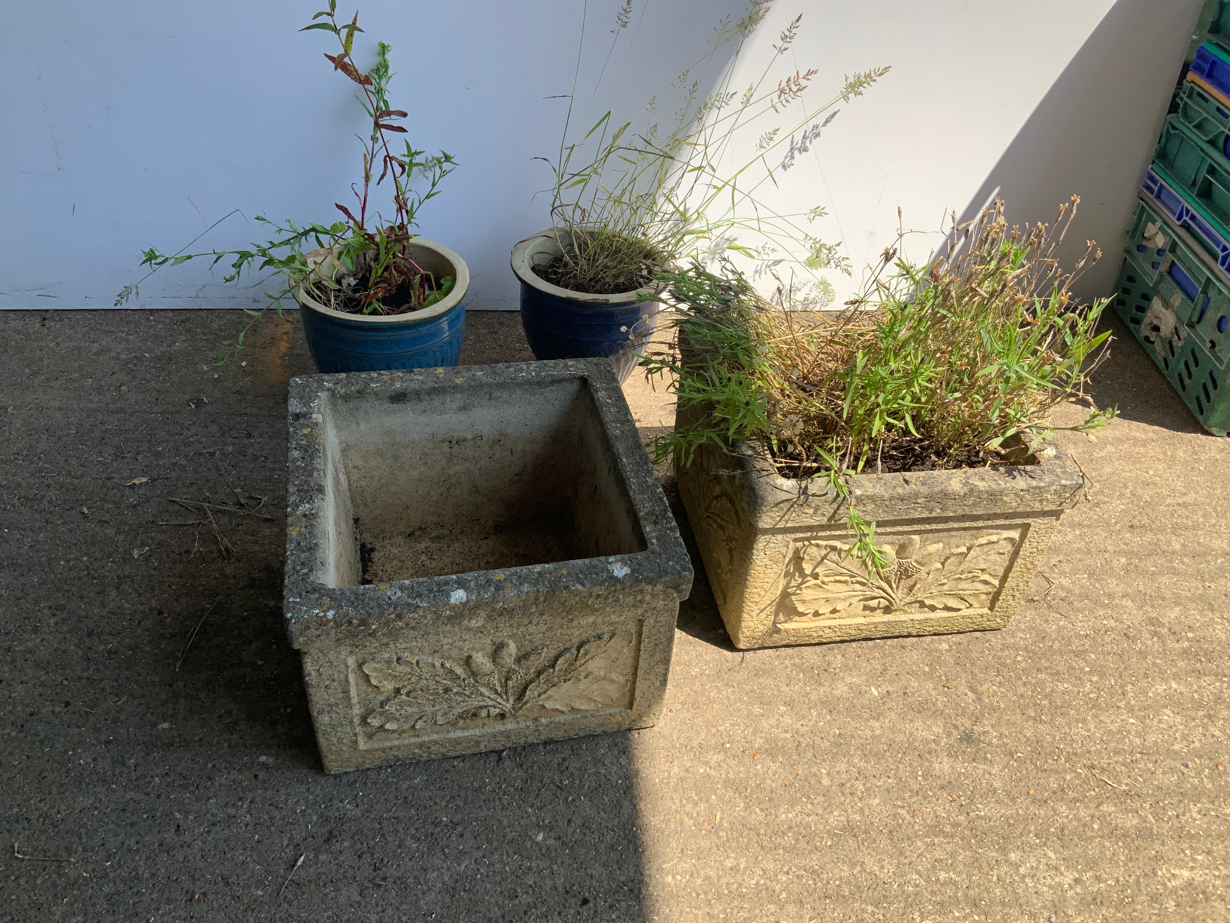 Pair of Concrete Planters and Pair of Glazed Planters