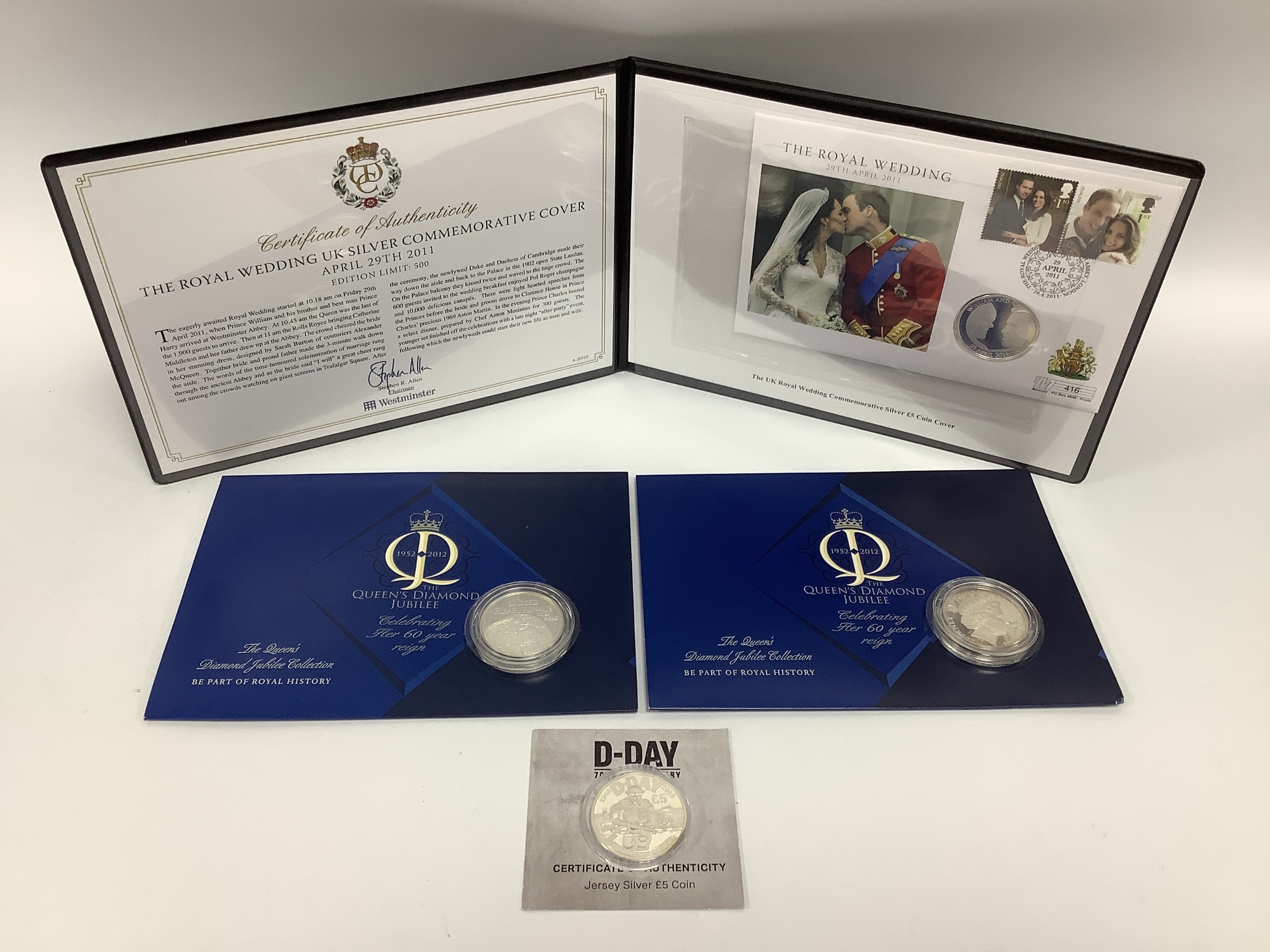 Collection Of Four Silver Coins, including two The Queen's Diamond Jubilee £5 coins, 2014 D-Day Jersey £5 and a 2011 The Royal Wedding £5 coin cover, all with certificates of authenticity.