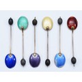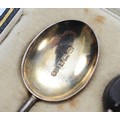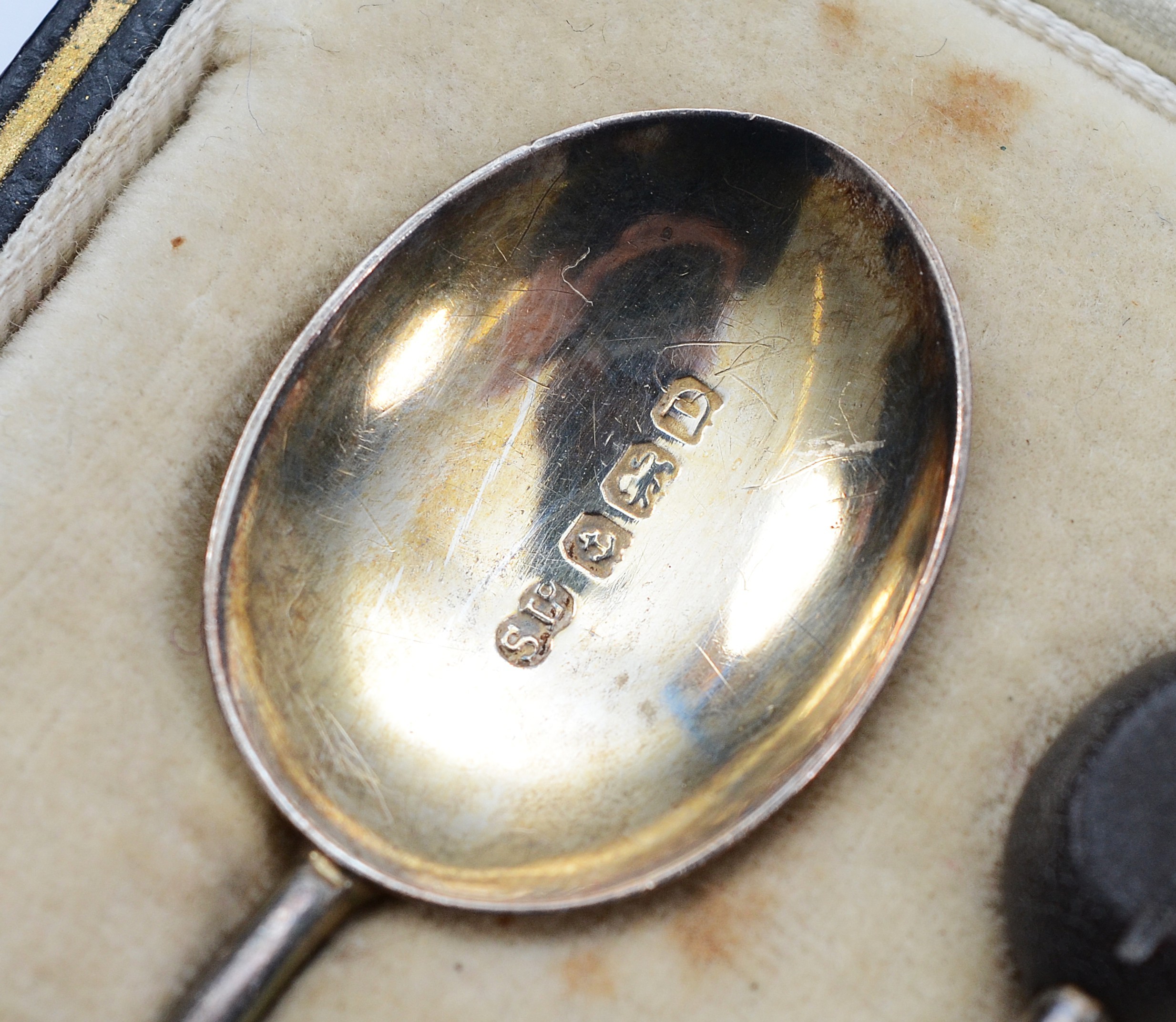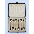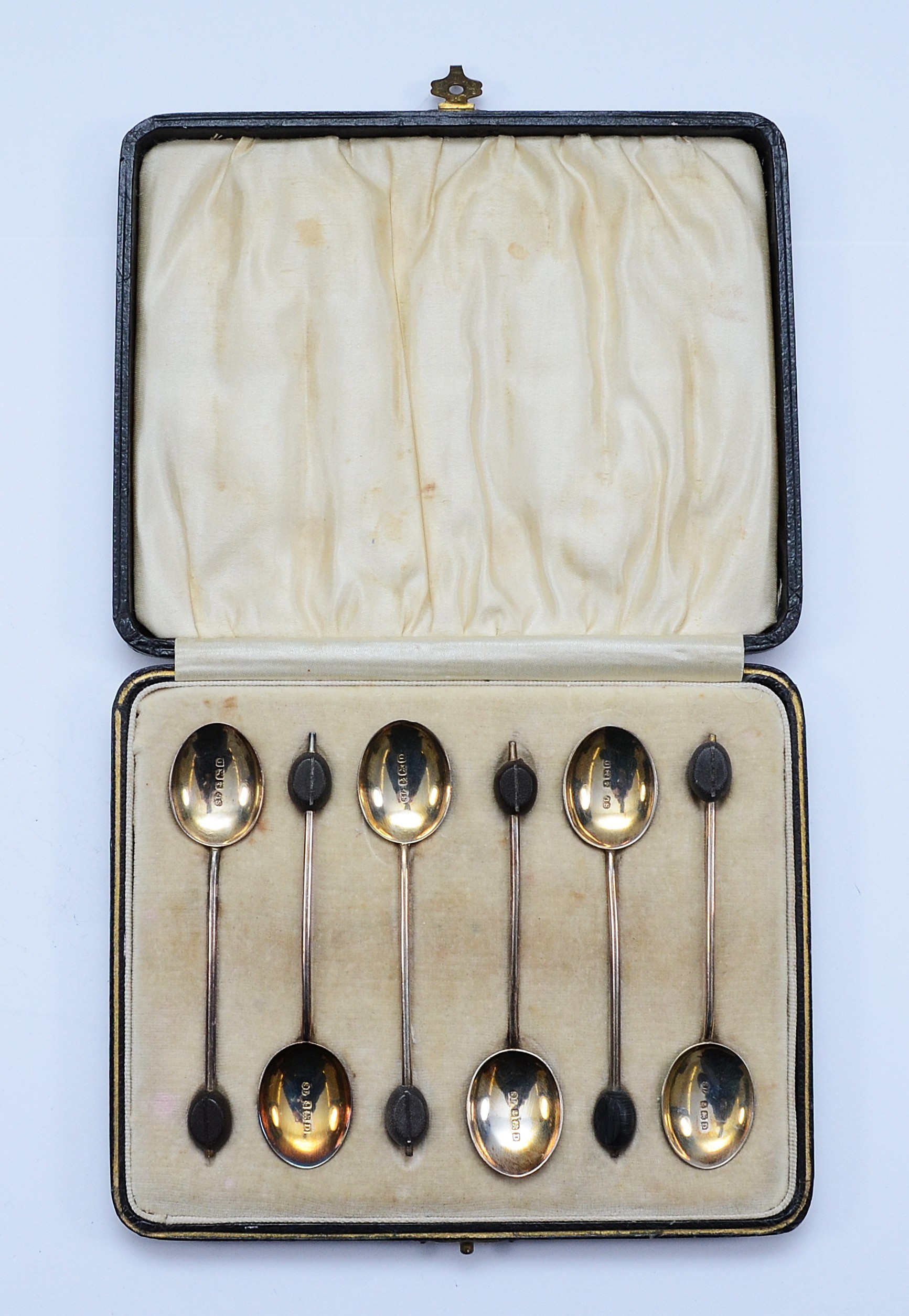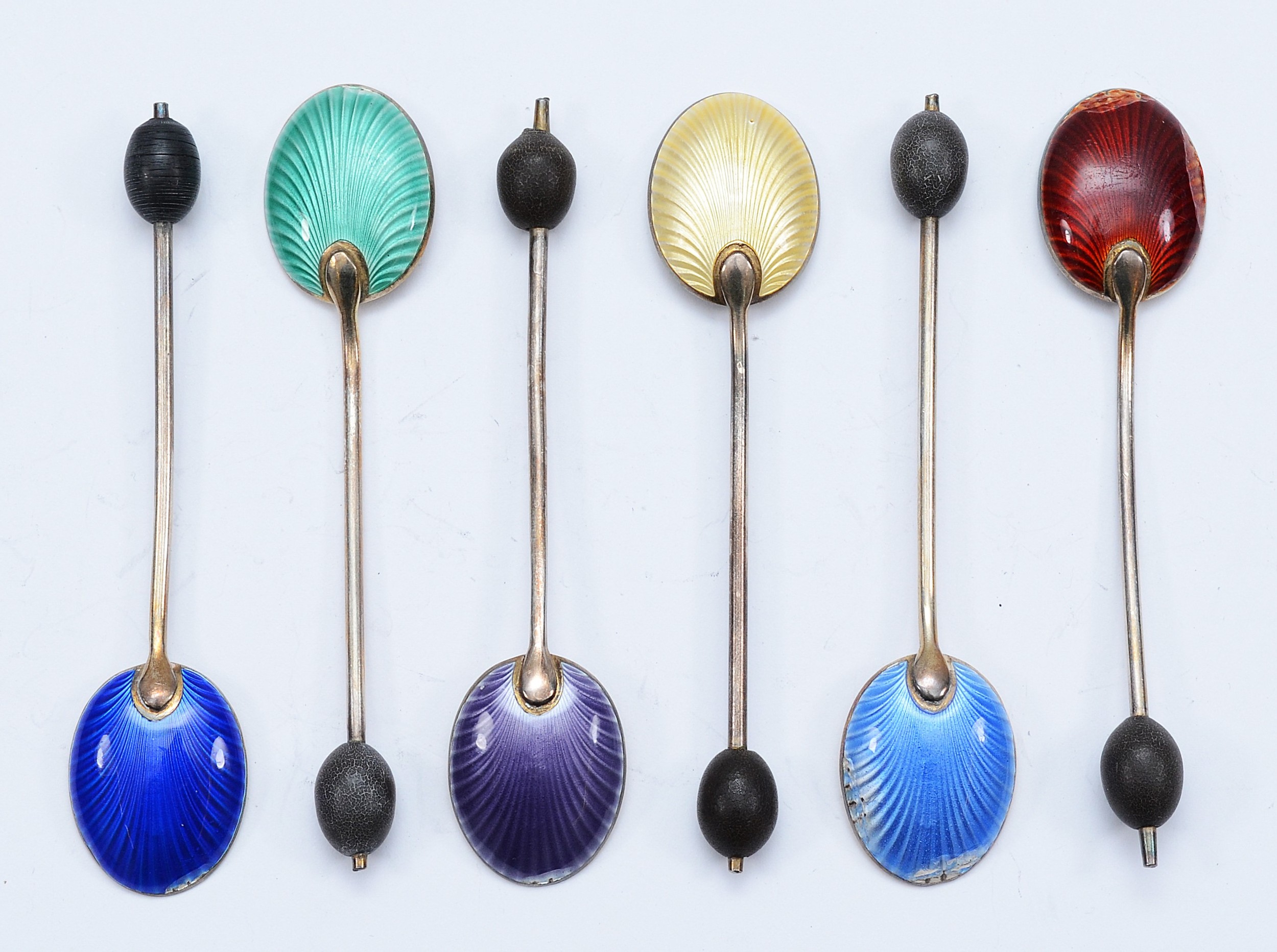 A set of six silver gilt and enamel coffee spoons, Birmingham 1928, by William Suckling Ltd, 45gm, cased.
