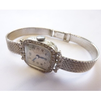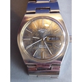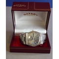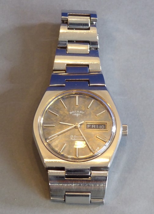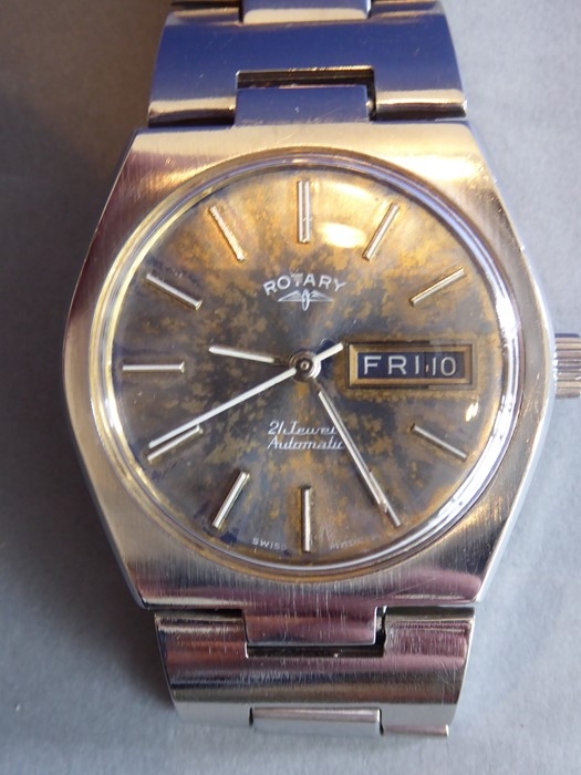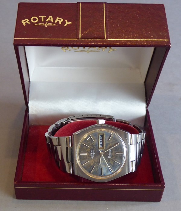 A boxed gentleman's Rotary automatic wristwatch set in a six-sided white-metal case with original bracelet strap, the dial in a brown marble effect with white baton markers, day and date at 3 o'clock and separate second hand; signed to dial 'Rotary' with logo, 21 jewels, automatic and in good working order
