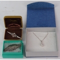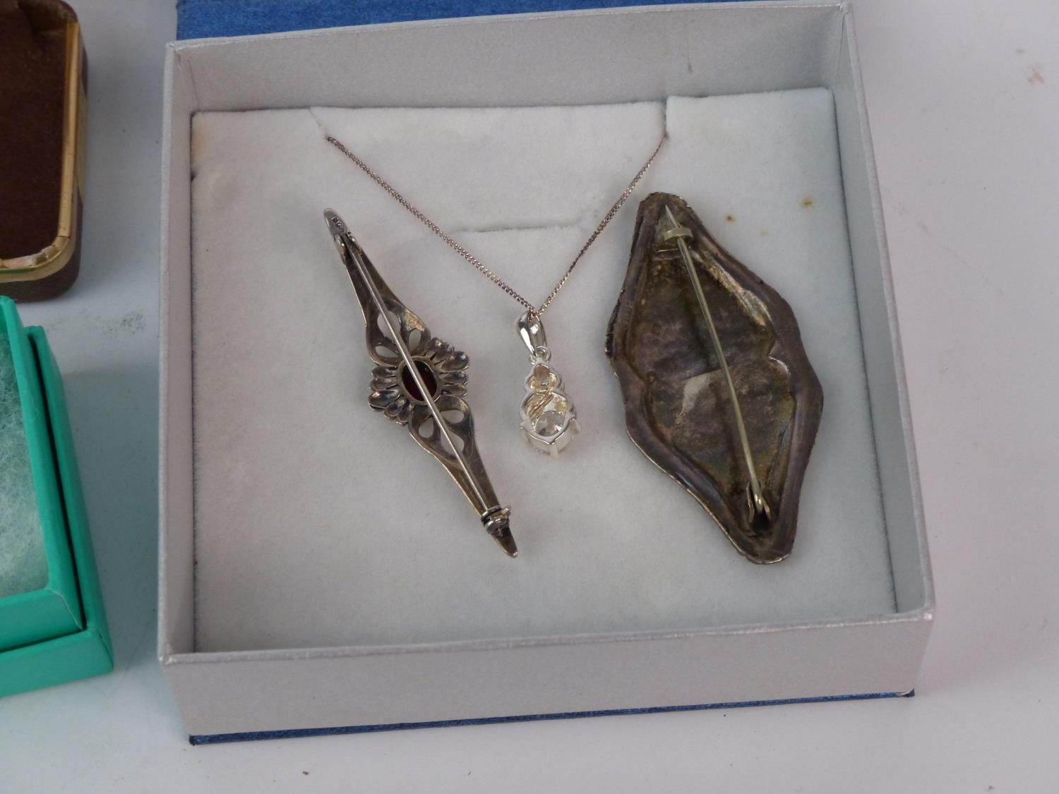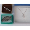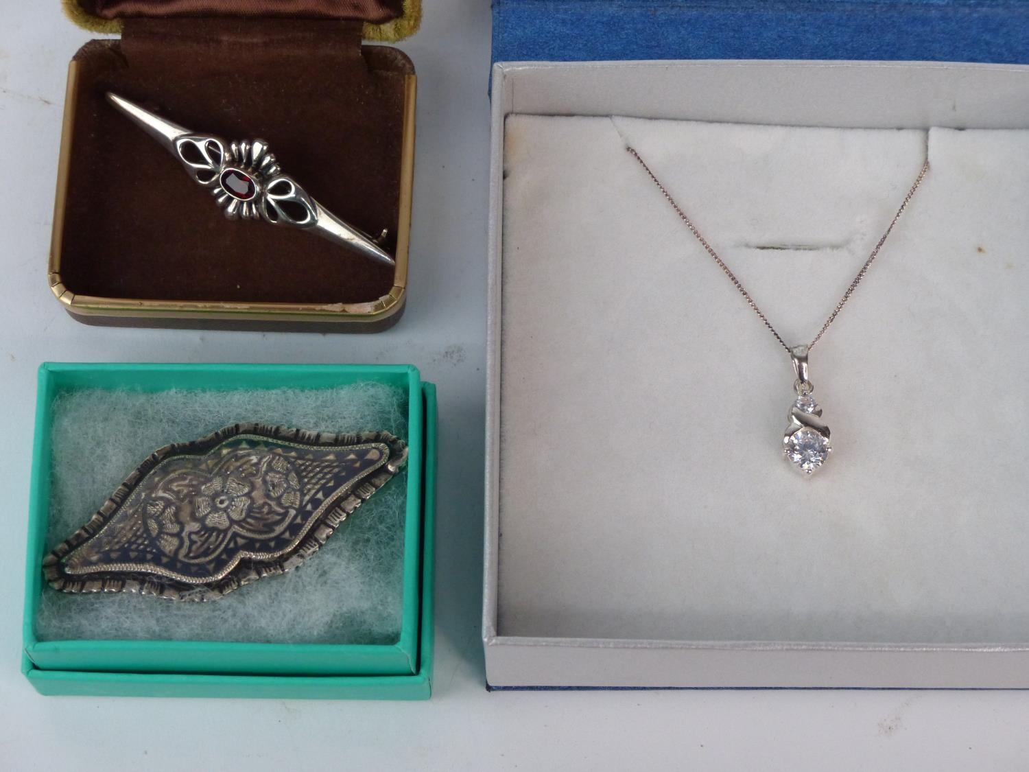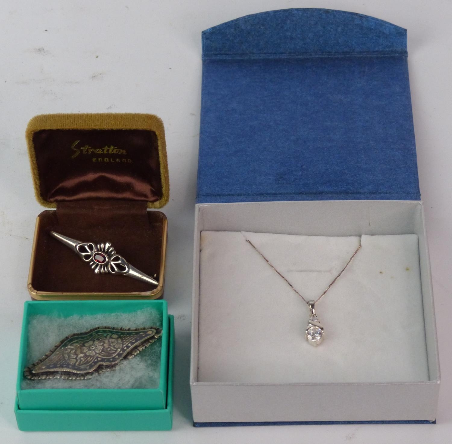 A Sterling silver necklace and pendant and two brooches.