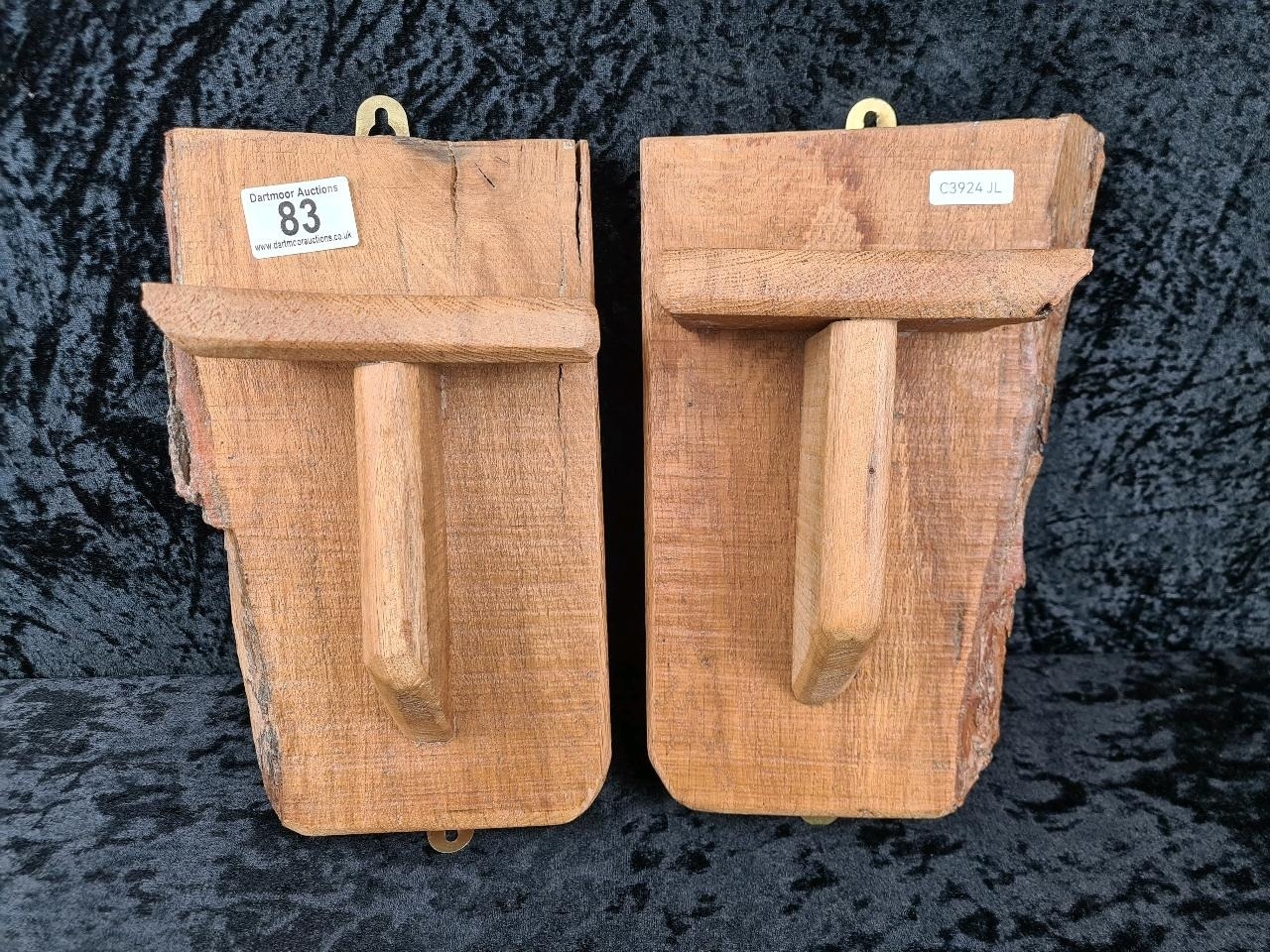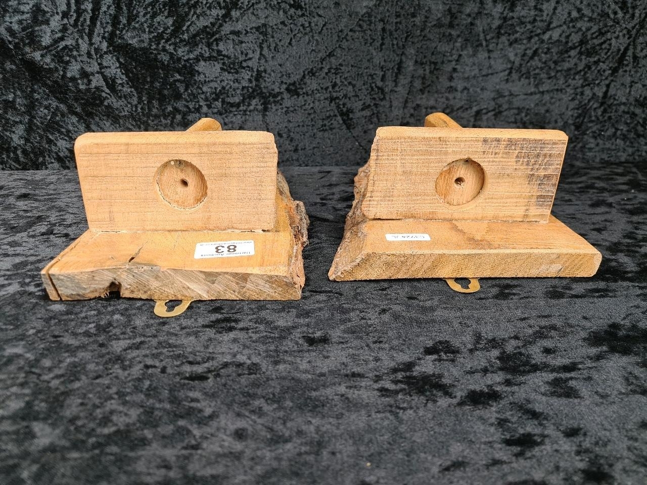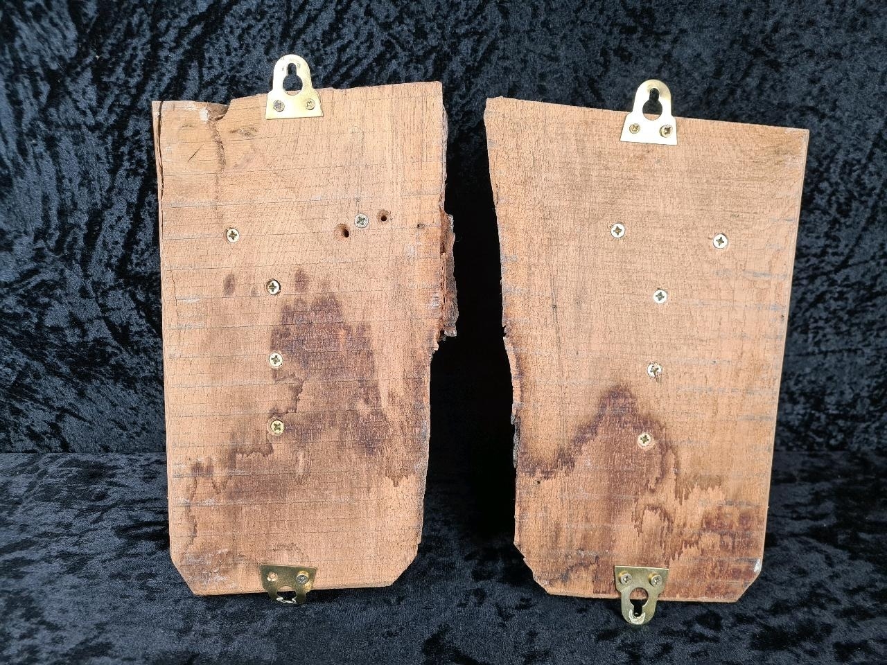 Pair of rustic hand-carved wooden candle sconces. Approx H28cm.
