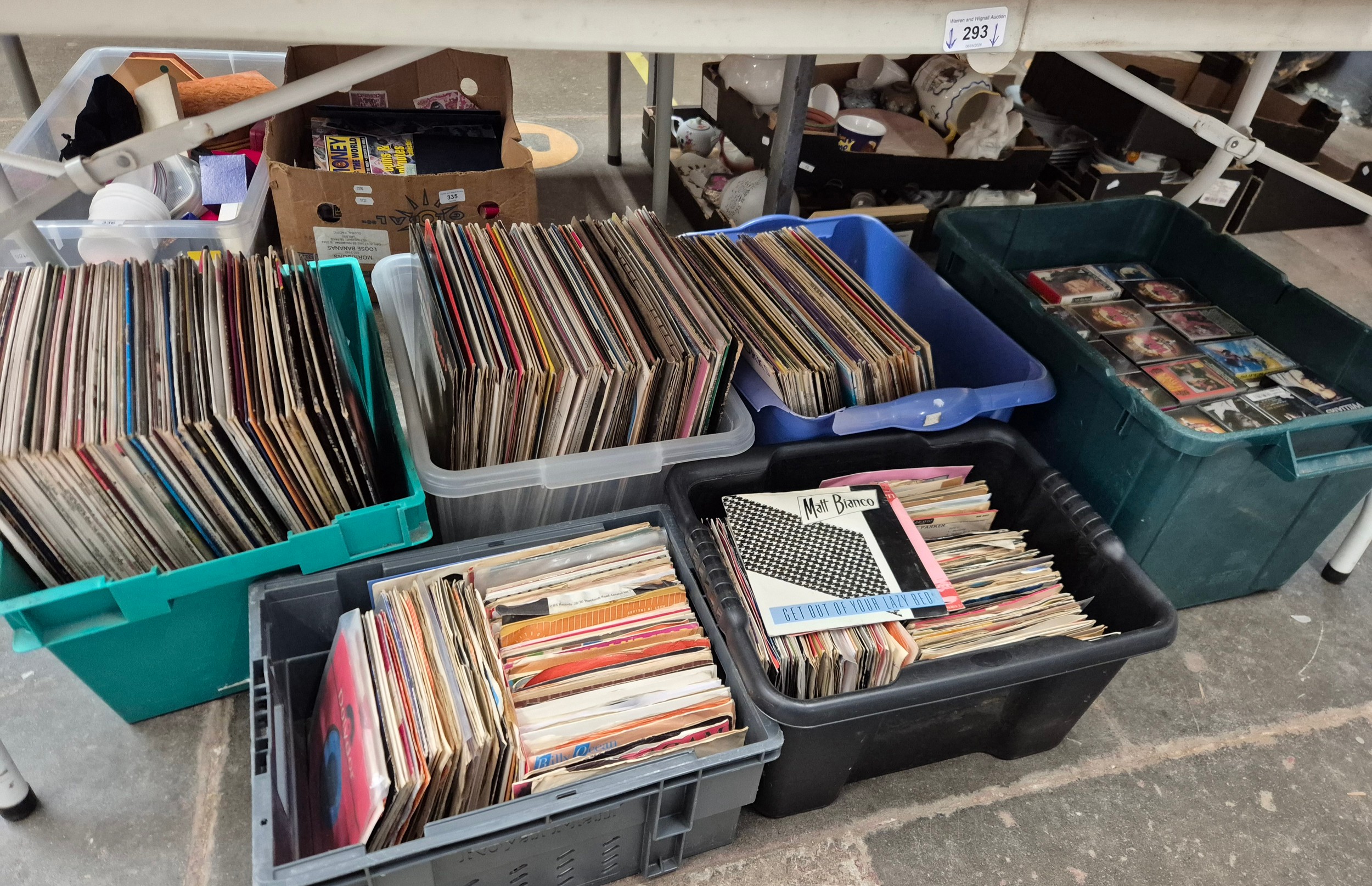 3 boxes of LPs, 2 boxes of singles, and a large box of music cassettes, unchecked. Sold as seen.