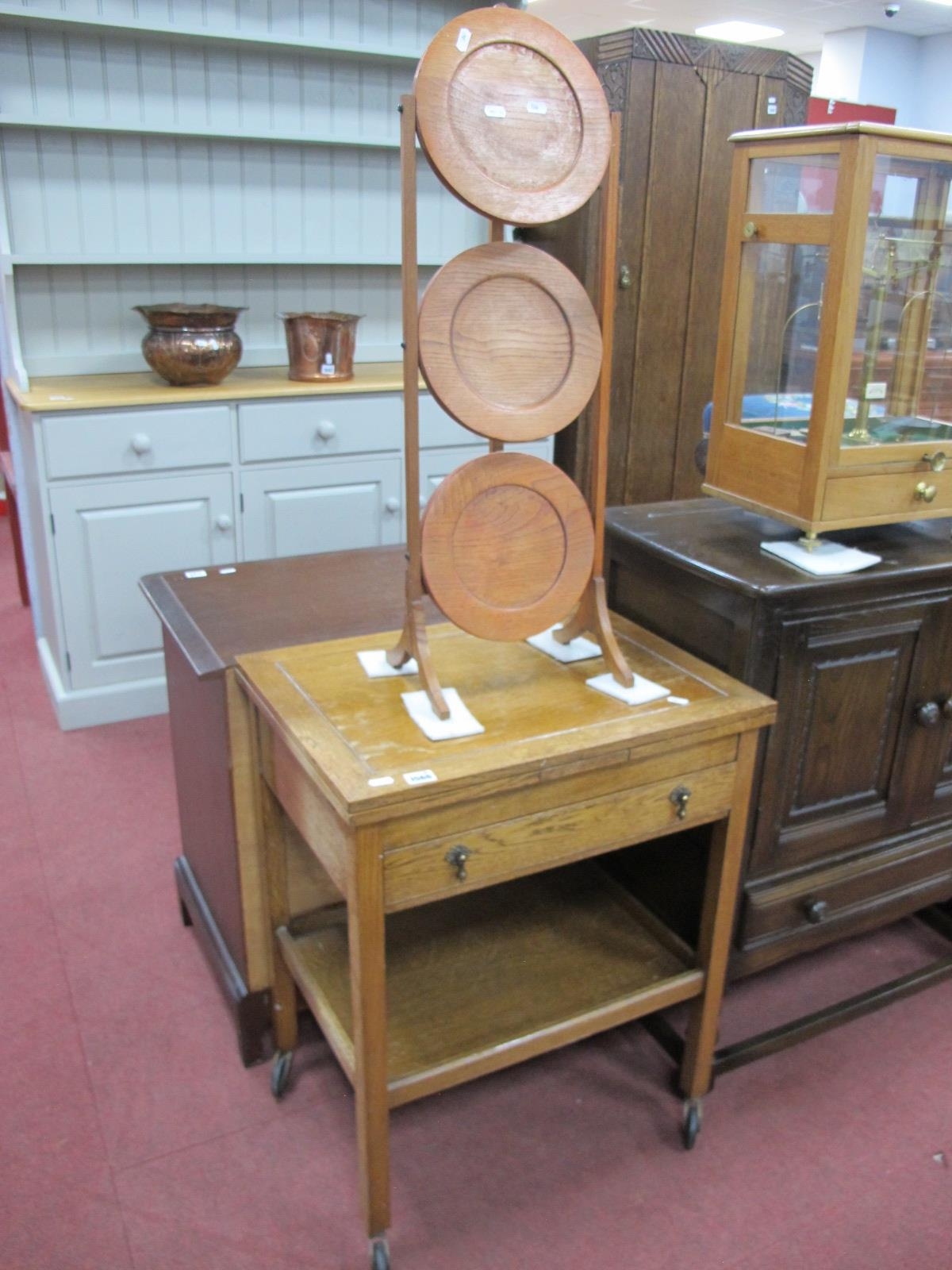 A XX Century Oak Draw Leaf Trolley, with a single drawer, with under shelf, together with a three tier cake stand. (2).
