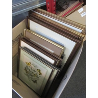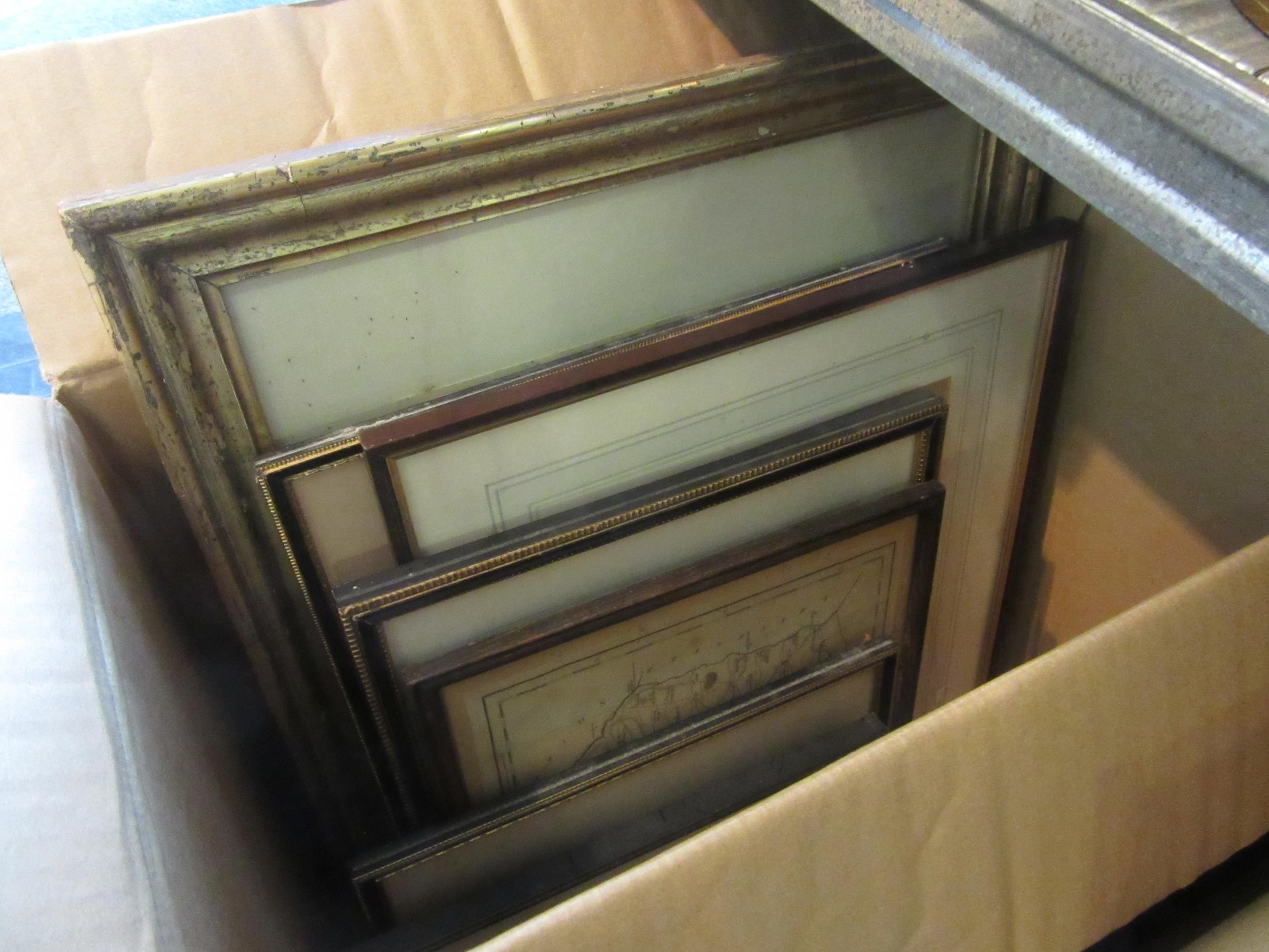 A box of maps and prints including Thomas Moule hand-coloured map of Norfolk circa 1836 plus Moule Rutland map, etc