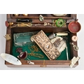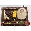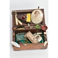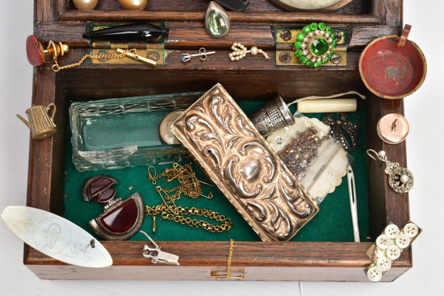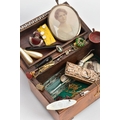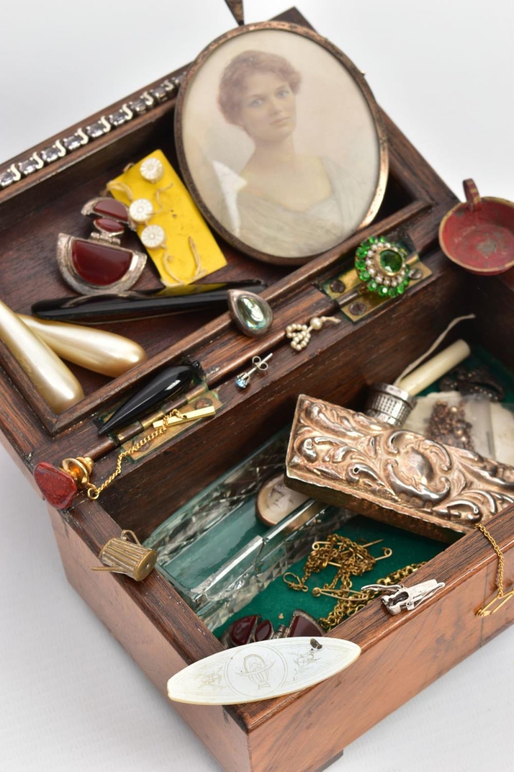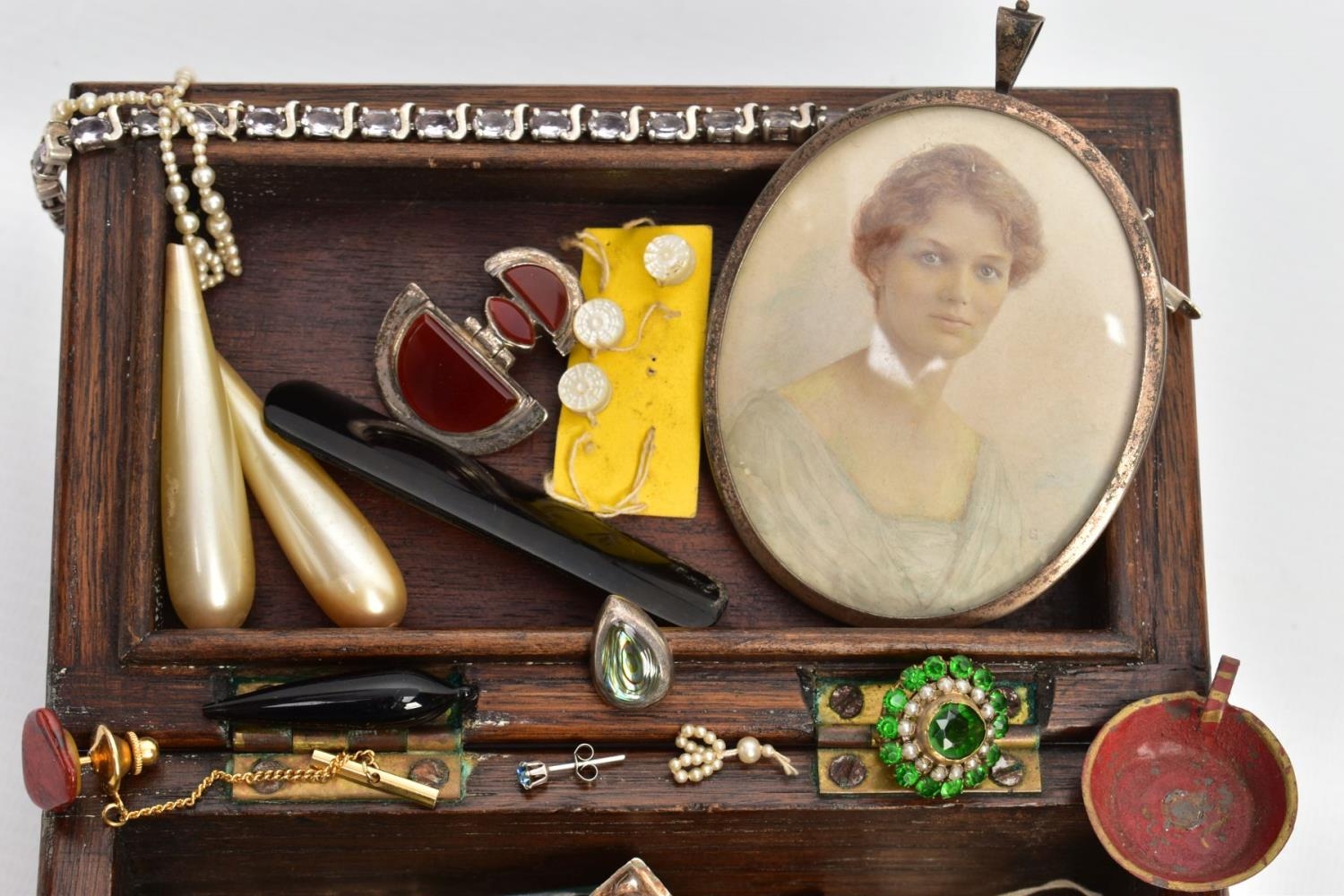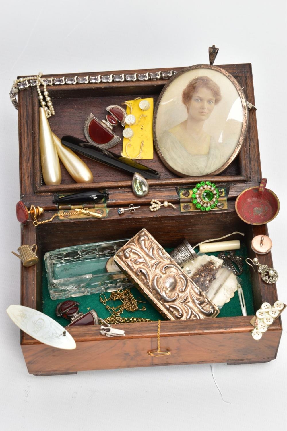 A SMALL HINGED WALNUT BOX CONTAINING MAINLY JEWELLERY, to include an oval 9ct gold double sided photograph pendant, approximate gross weight 2.5 grams, an Edwardian rectangular cut glass vanity jar with silver embossed lid, silver hallmark for Birmingham 1901, an oval portrait miniature of a lady, a silver thimble, a pair of carnelian drop earrings, a single Mexican abalone shell stud earring etc.