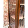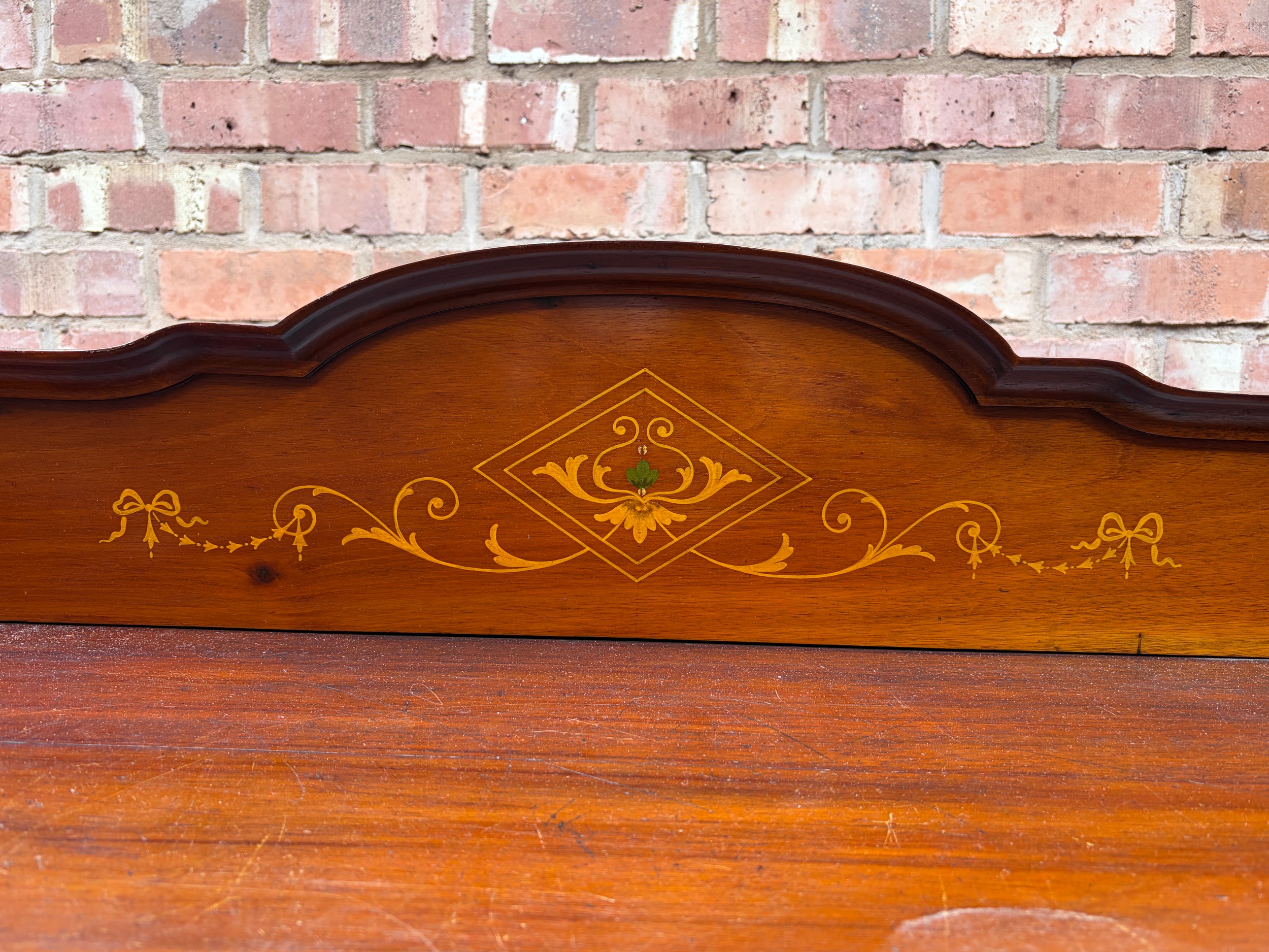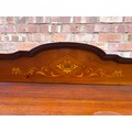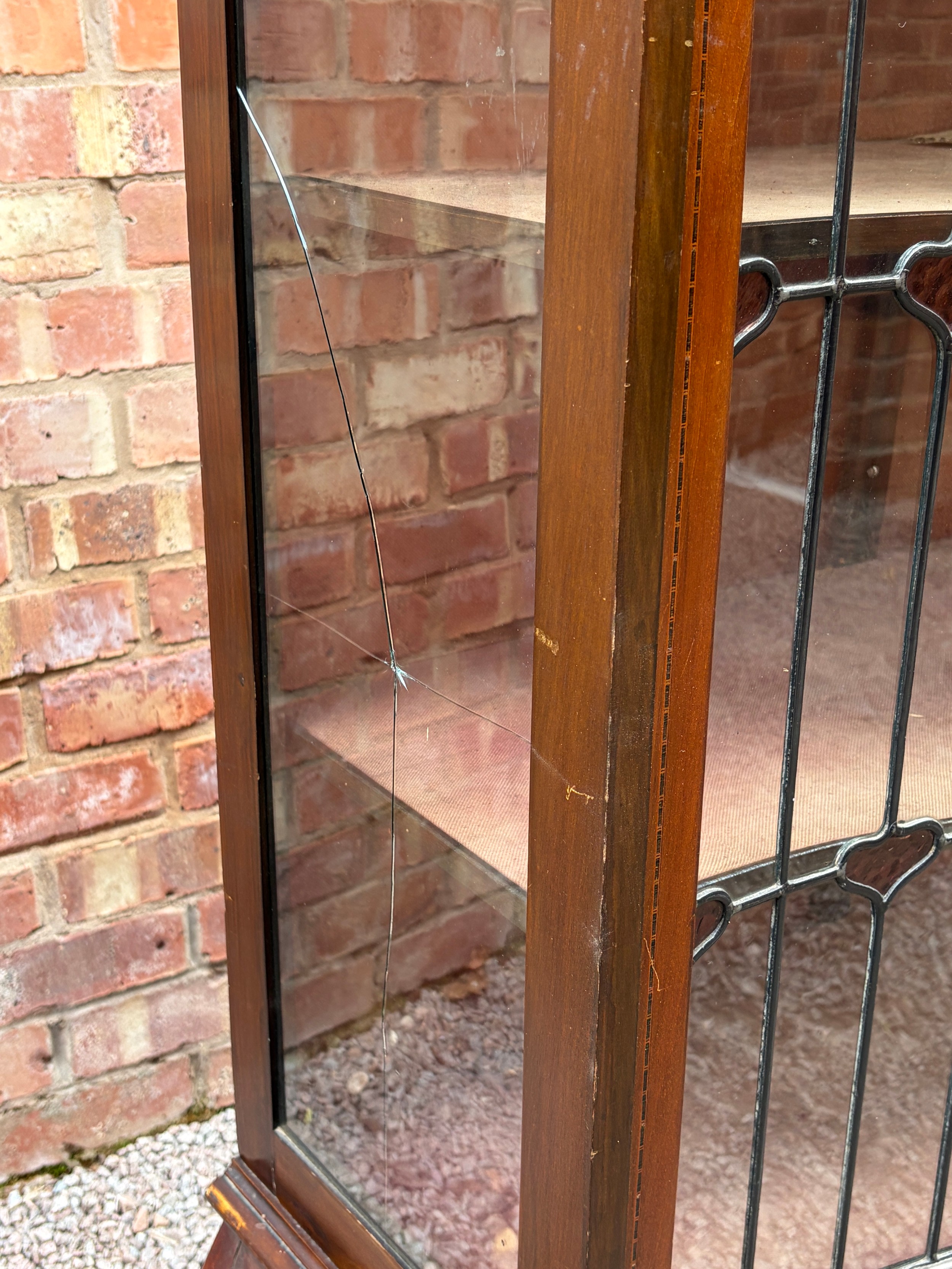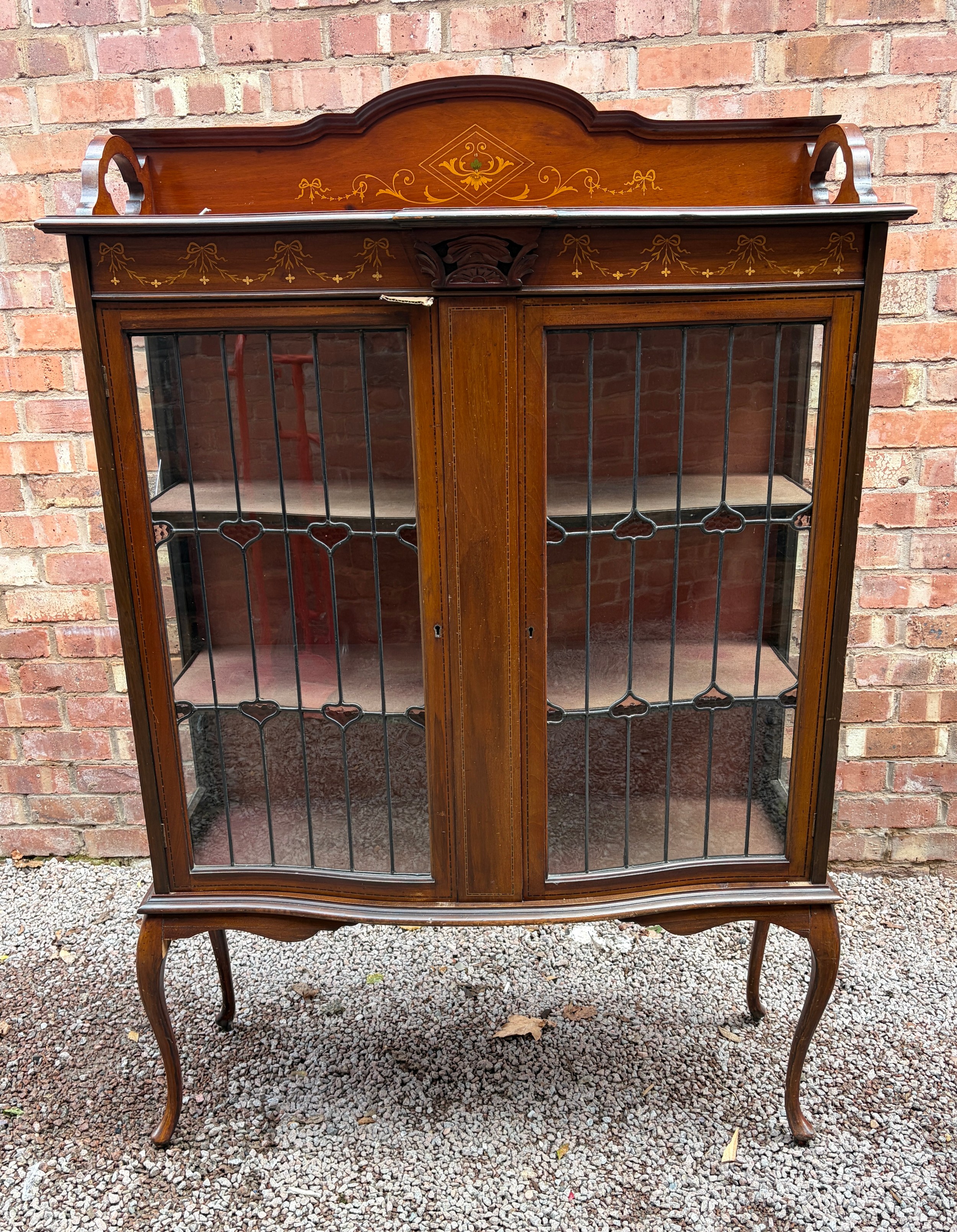 EDWARDIAN MAHOGANY CHEQUER STRUNG AND PAINTED SERPENTINE LEADED GLAZED GALLERY BACK CABINET (A/F TO GLASS)