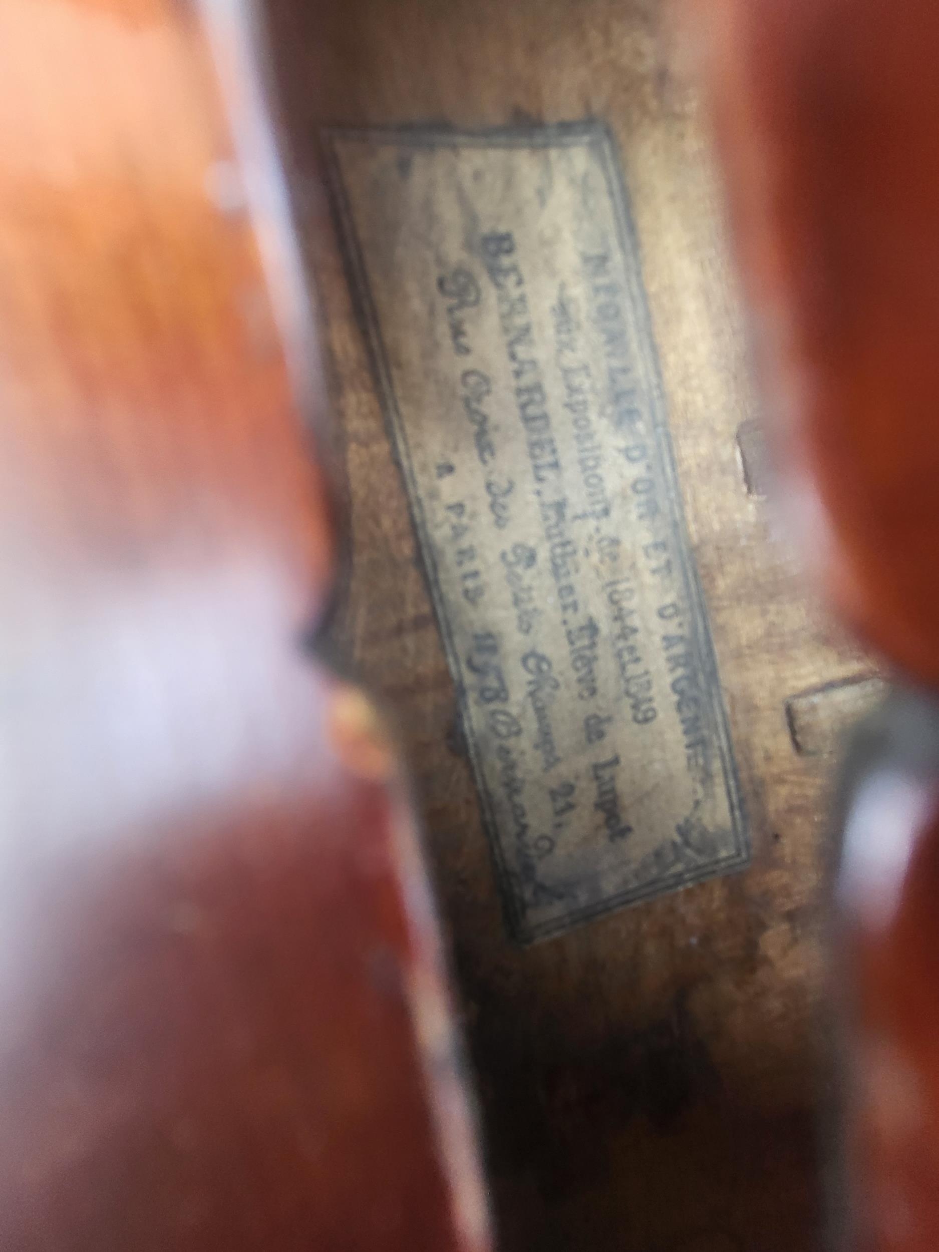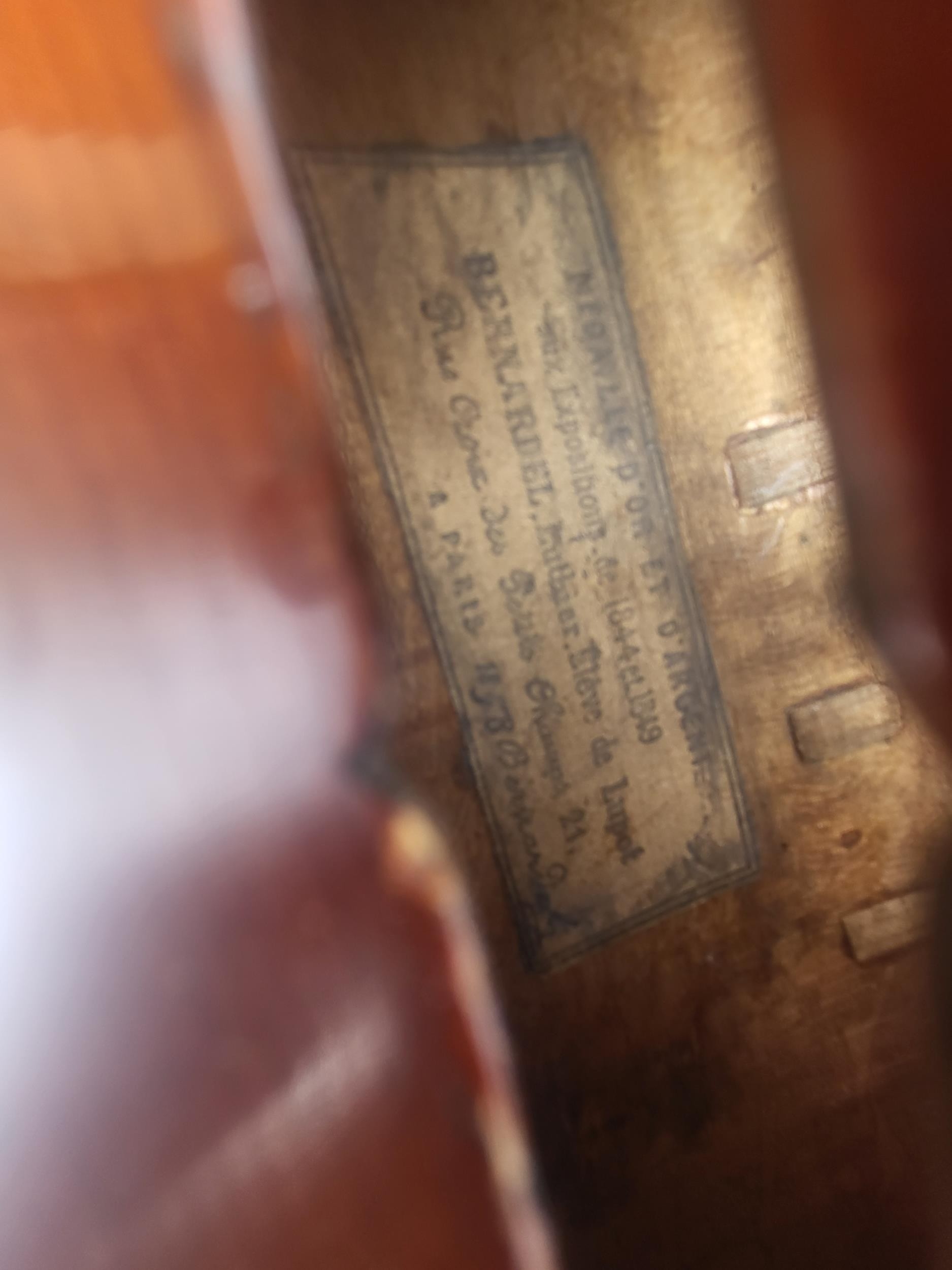 Bearing internal label, Médailles d’Or et d’argent aux Espositions de 1844 et 1849, Bernardo, Luthier, eleve de Lupot Rue Croix des Petits Champs a Paris 1858 Bernardel, colour red/brown f/b no3732, LOB 355mm.