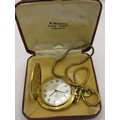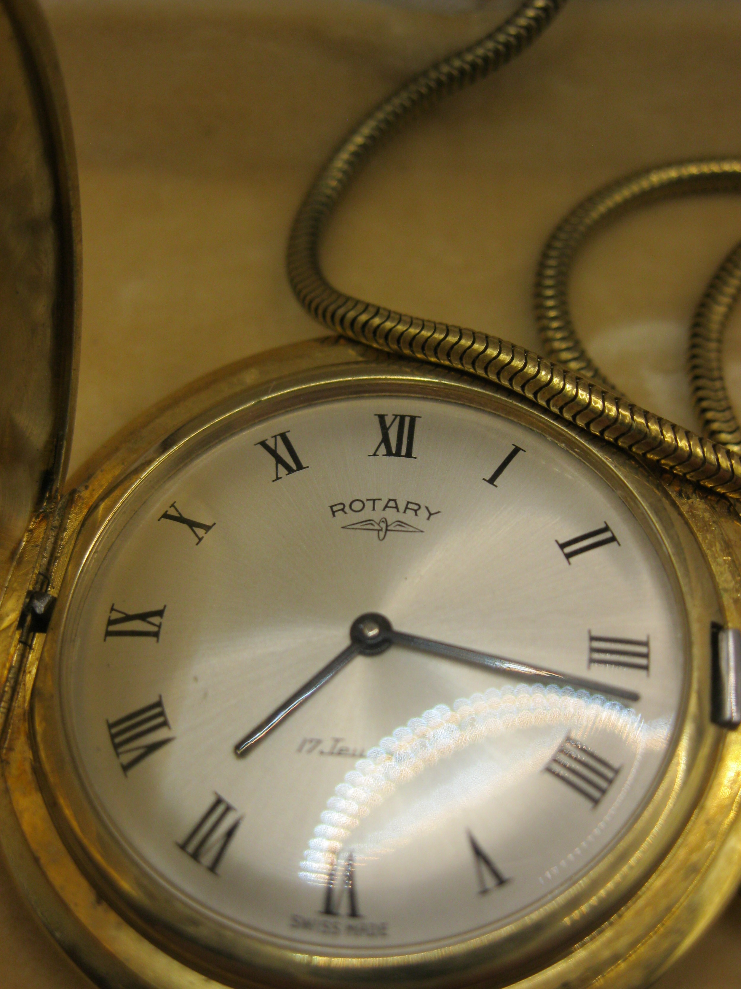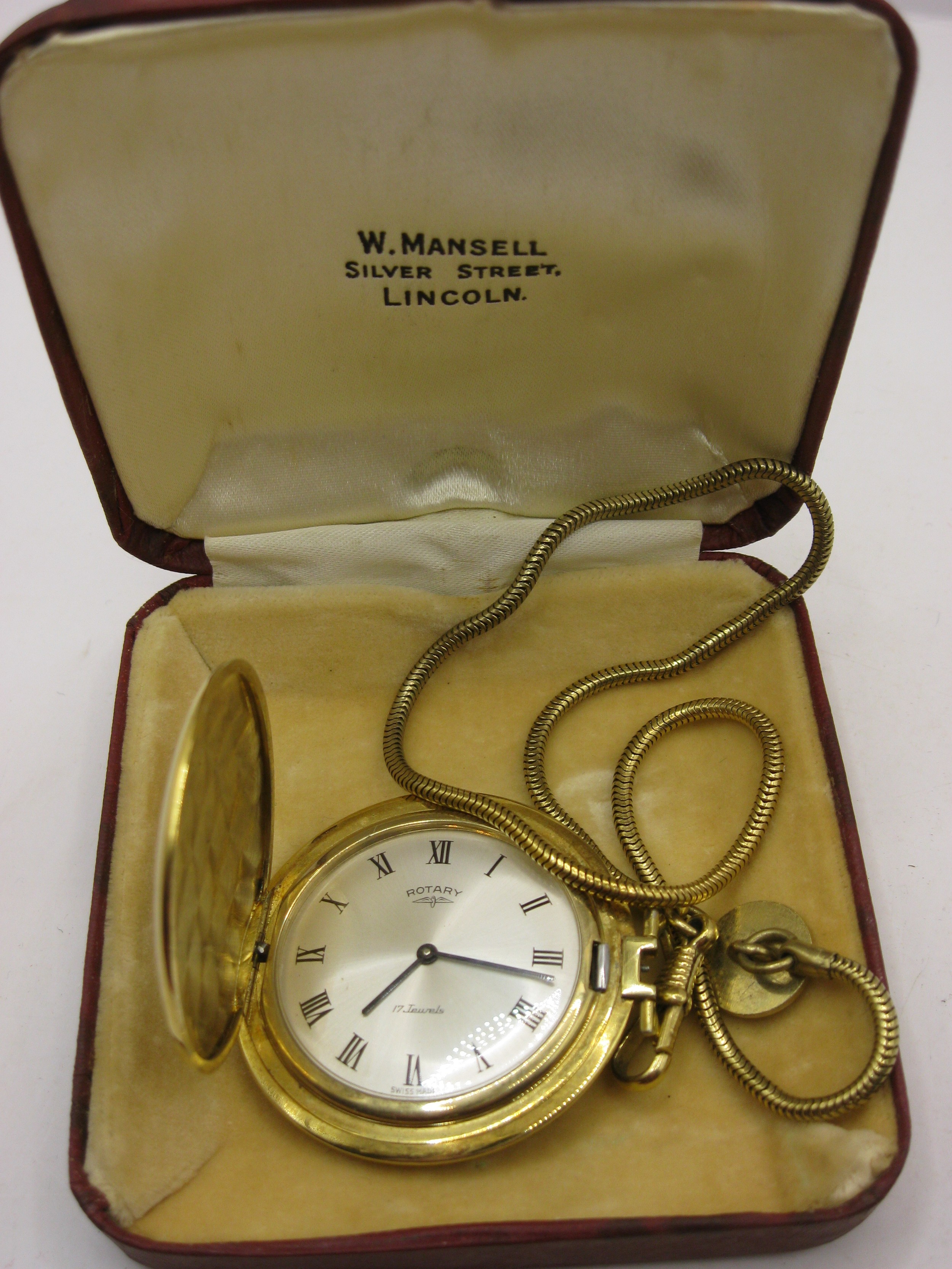 A gold plated pocket watch by Rotary on a gold plated watch chain, the watch a/f