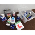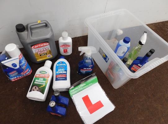 Box of car essentials, brake fluid, de-icer, rad sealer etc...