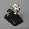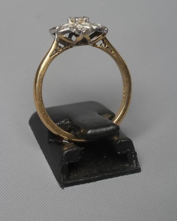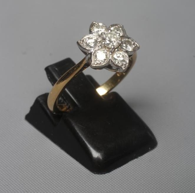 A SEVEN STONE DIAMOND CLUSTER RING, the old brilliant cut stones point set to a plain shank stamped 18ct, size M (Est. plus 24% premium inc. VAT)