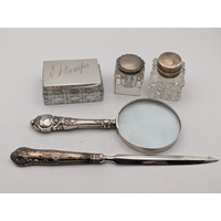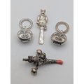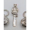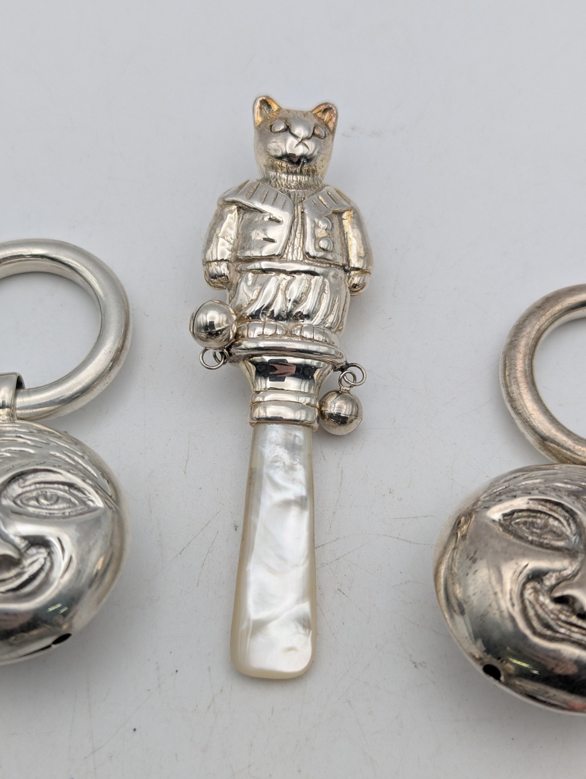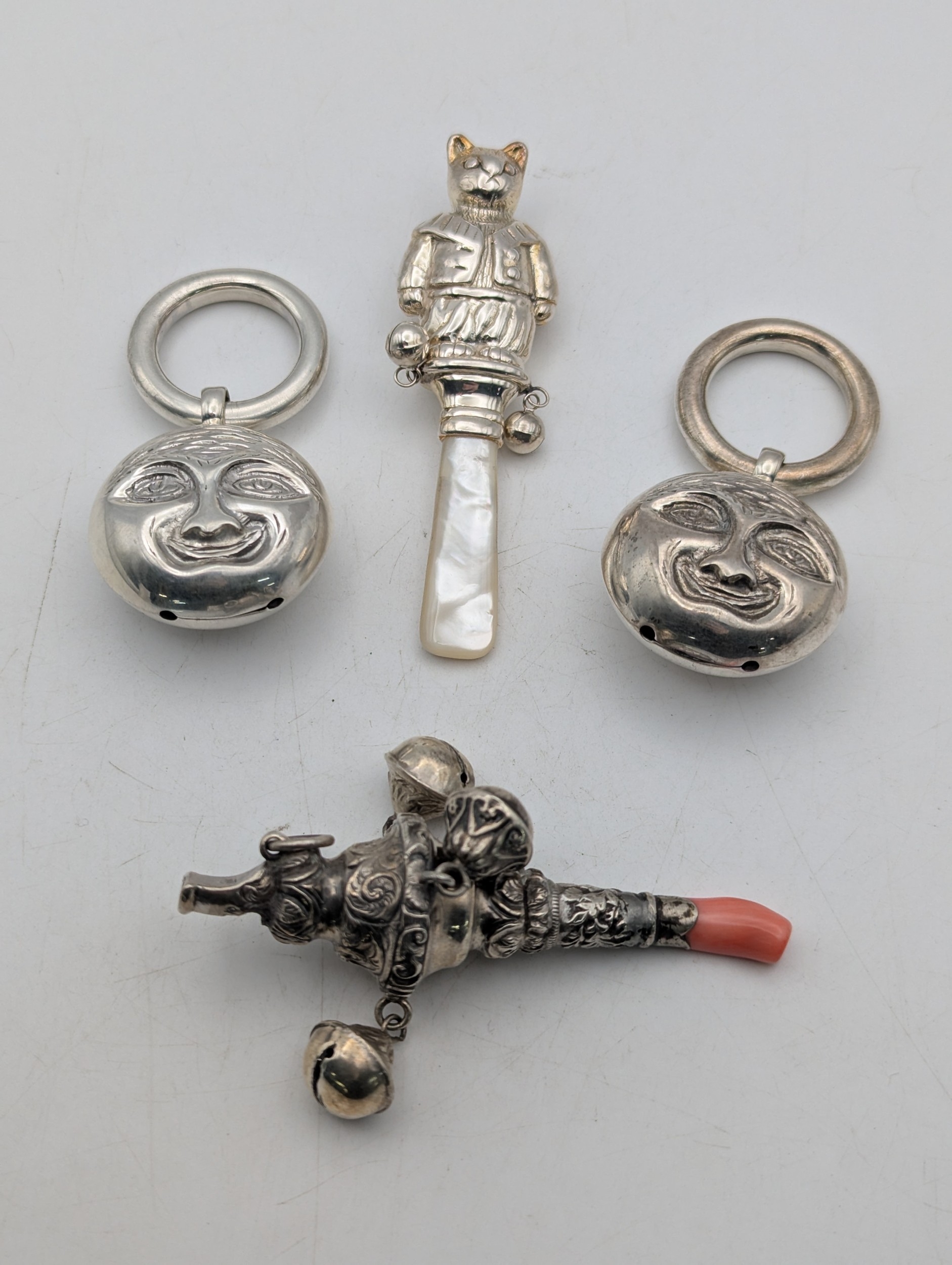 A group of baby rattles to include a silver mother of pearl example, fashioned as a cat, a coral and silver babies whistle and rattle and two white metal examples