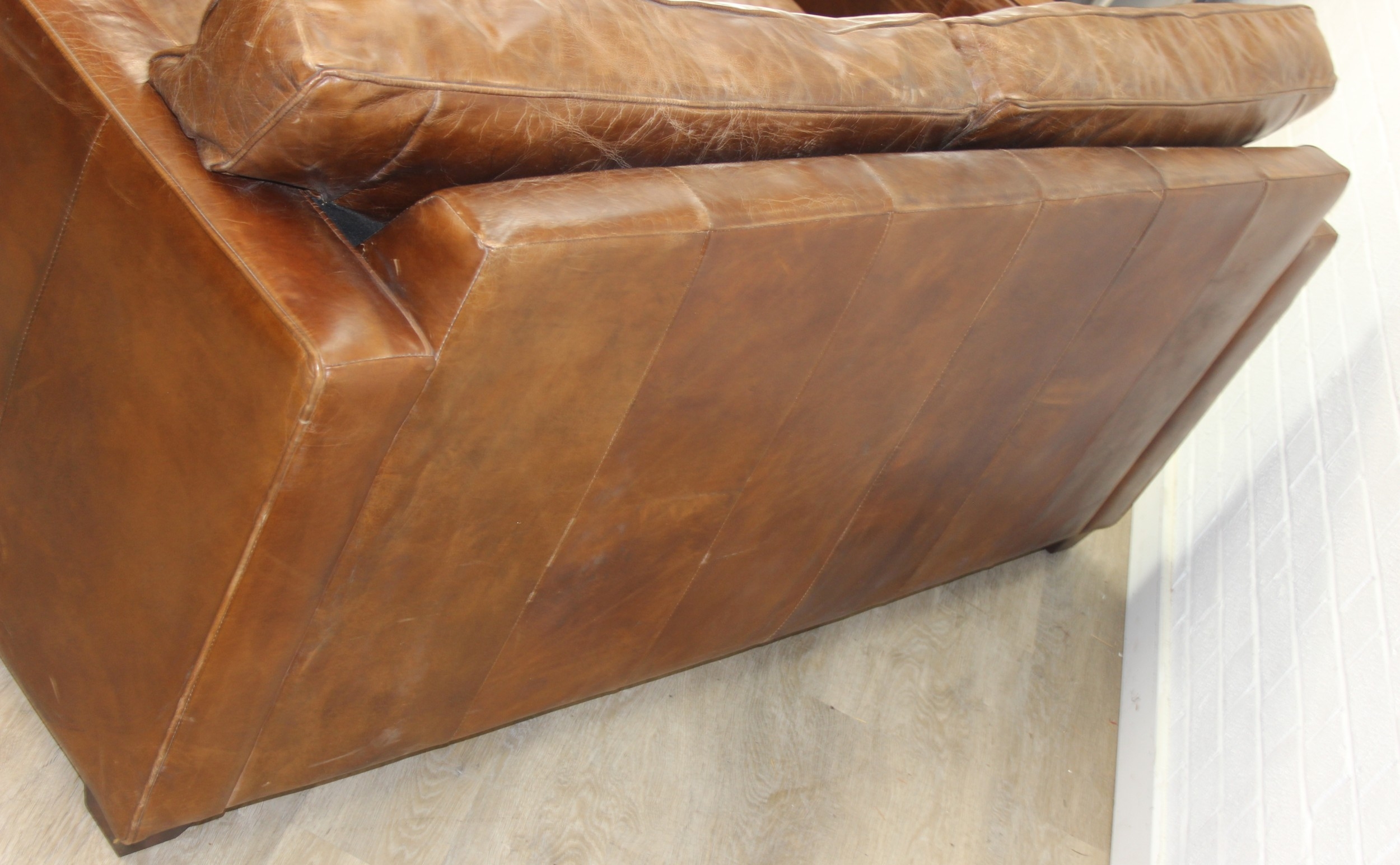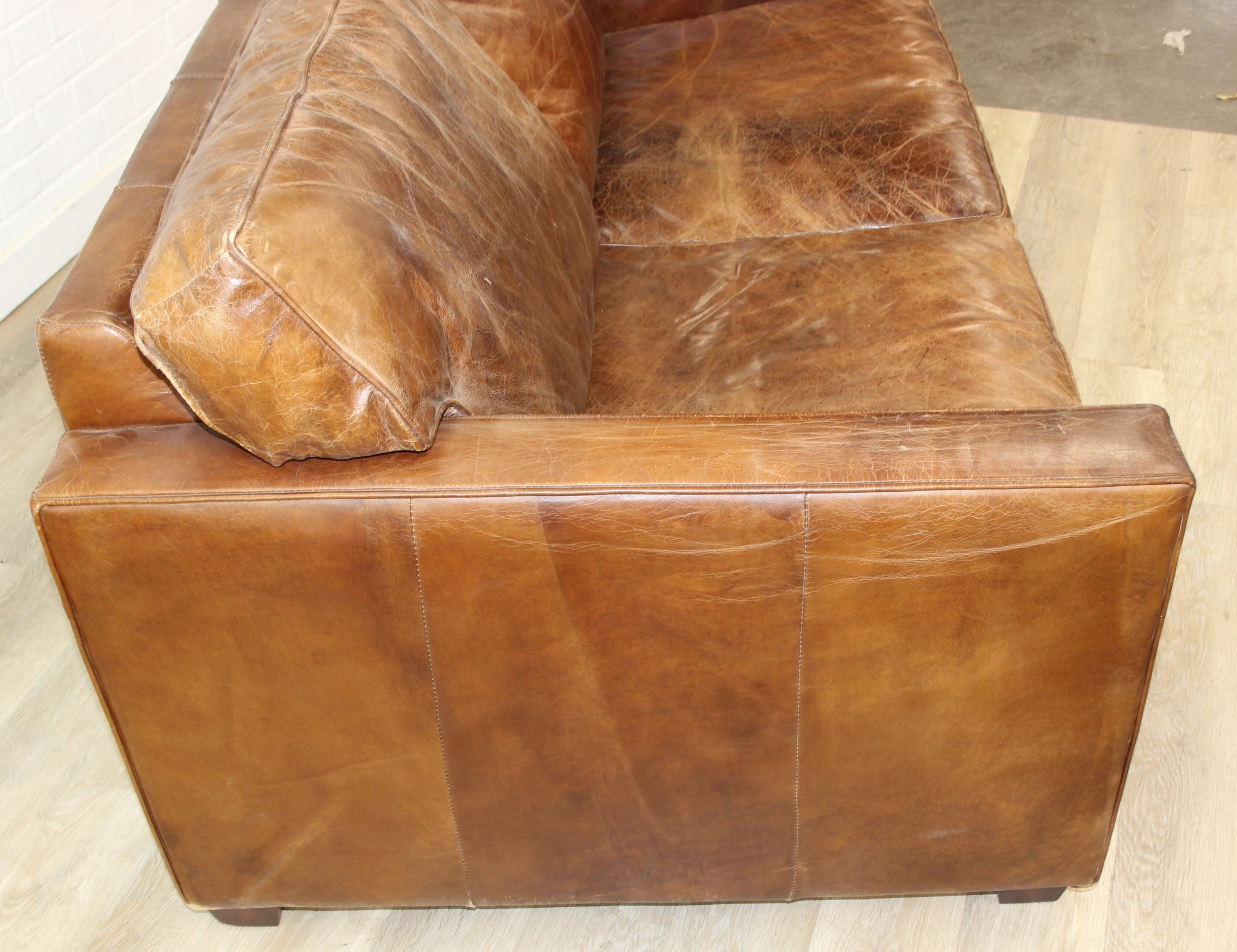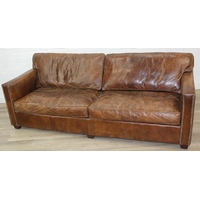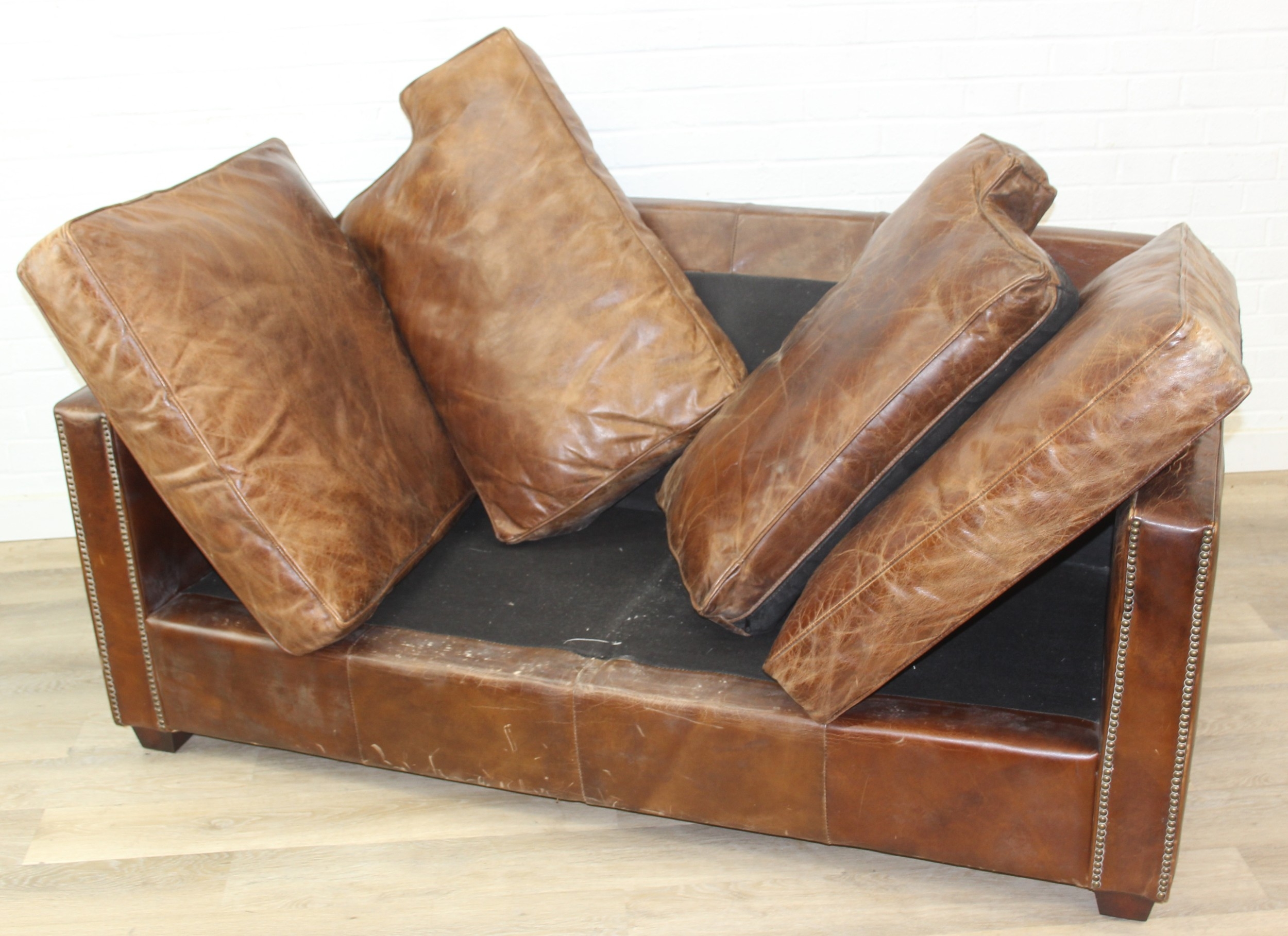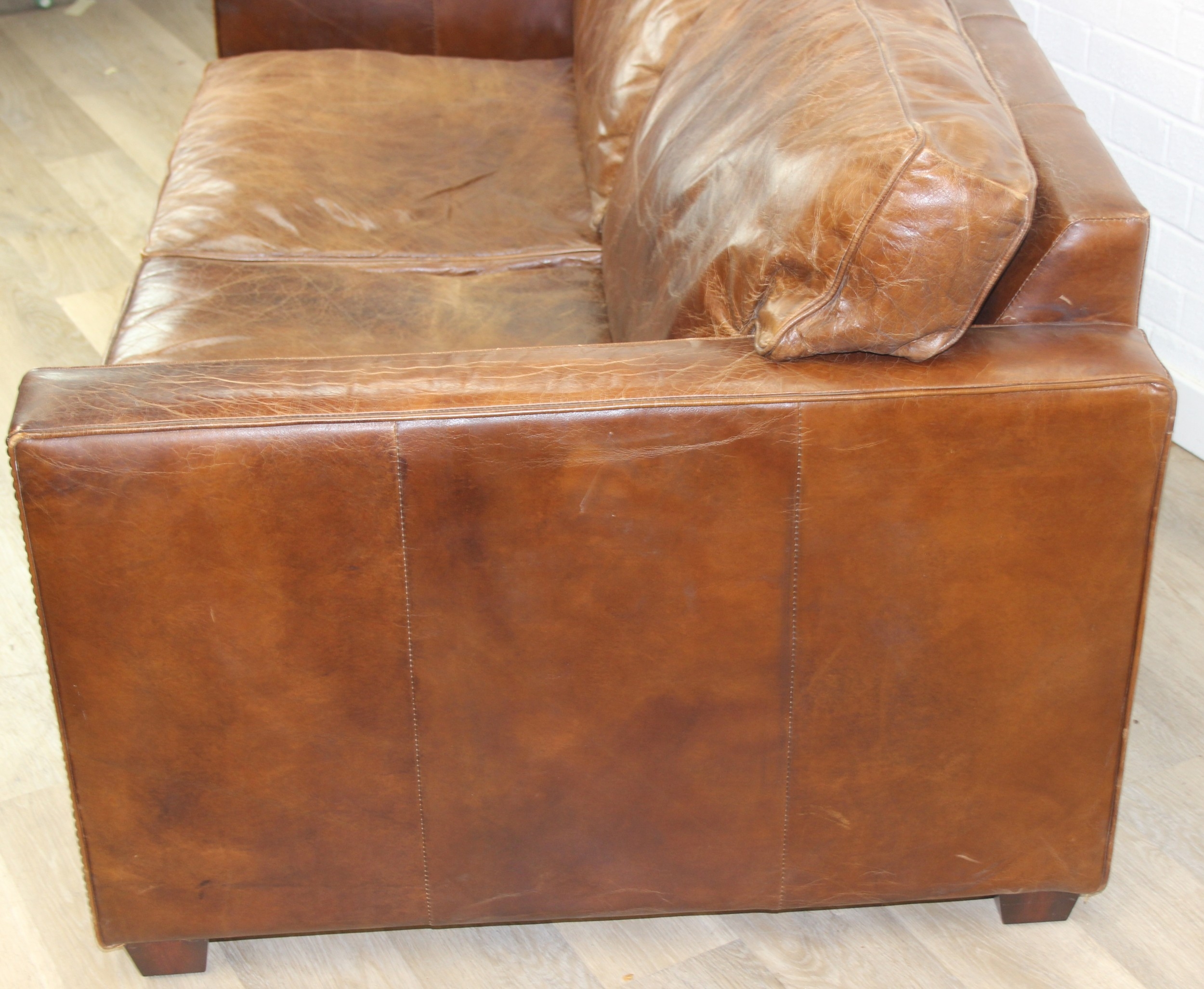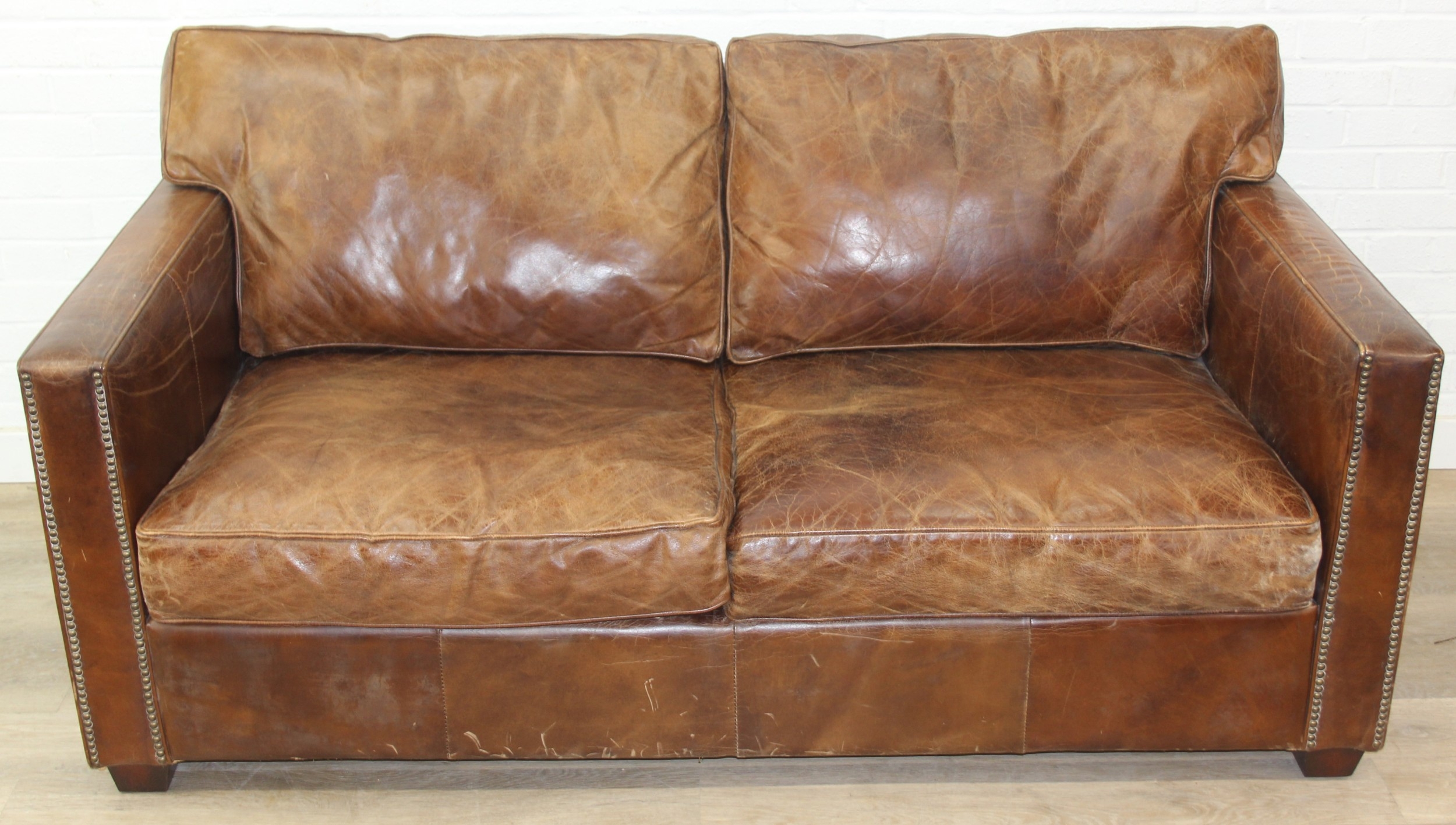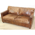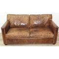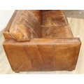 Brown leather sofa with stud work detail to squared arms, 172cm x 98cm x 78cm