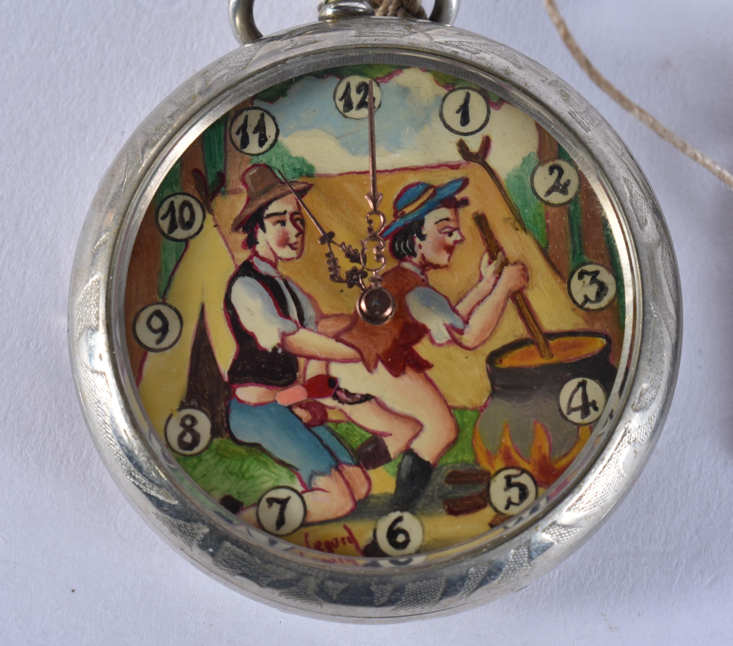 AN EROTIC 'RANDOLPH AND DONNY GO CAMPING' POCKET WATCH modelled as Randy Randolph helping Donny prepare his famous stewed meat. Running. 4.5 cm wide.