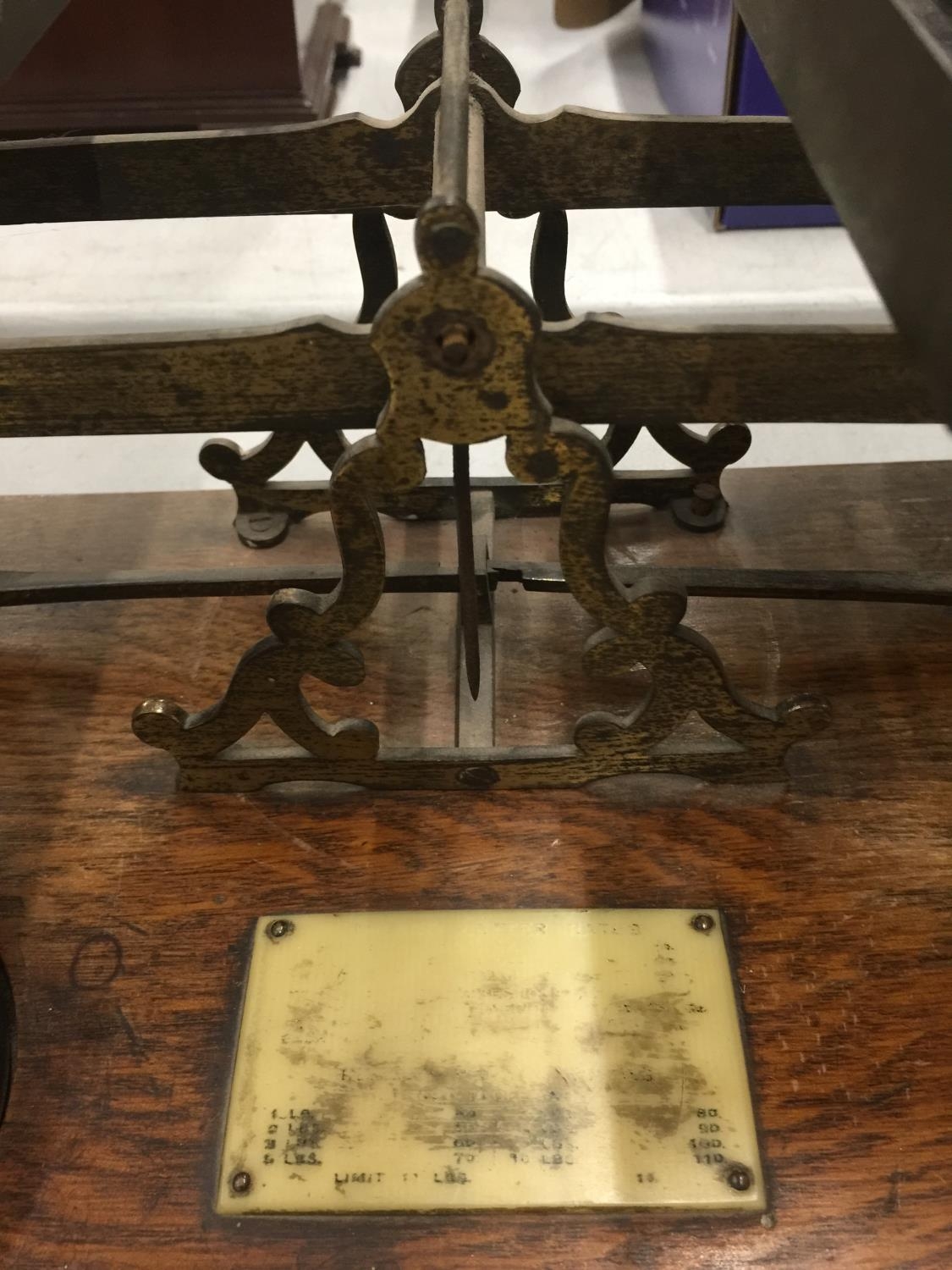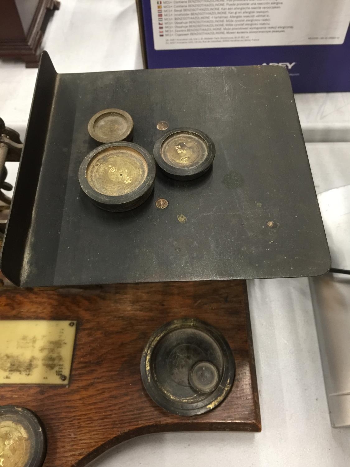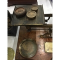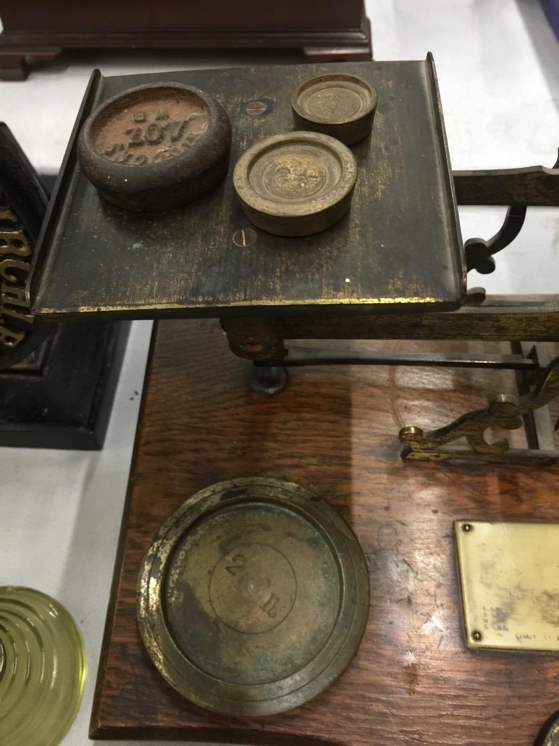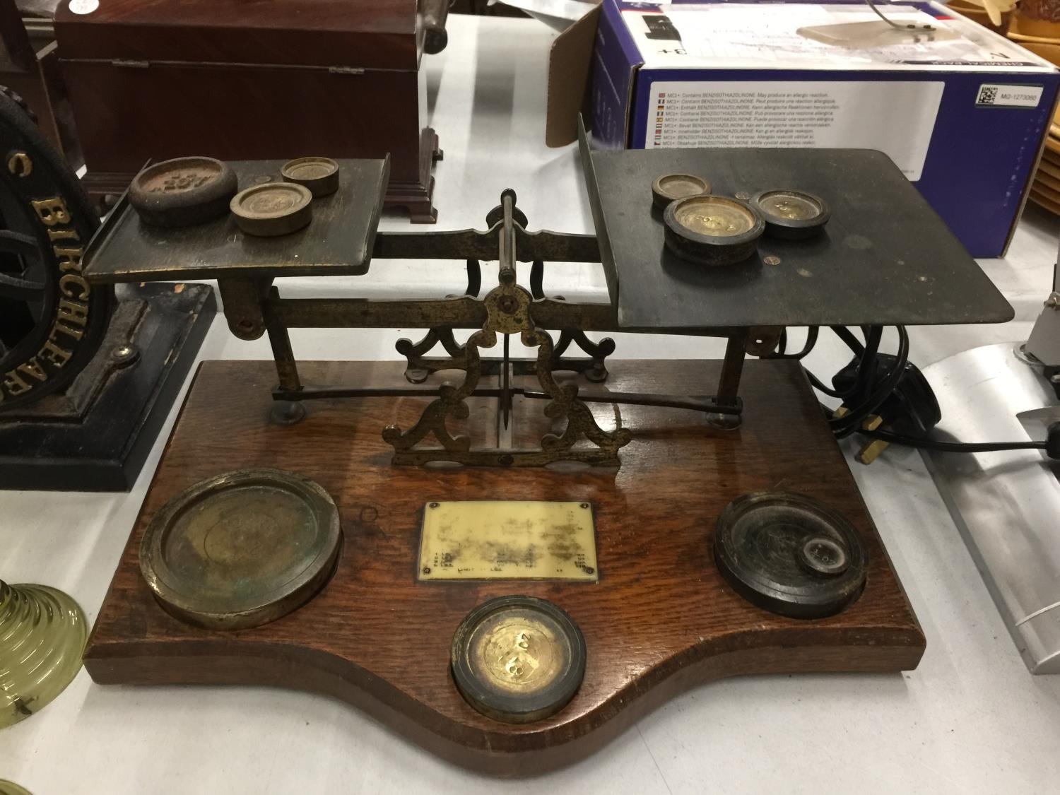 A SET OF MAHOGANY AND BRASS VINTAGE PARCEL SCALES WITH WEIGHTS