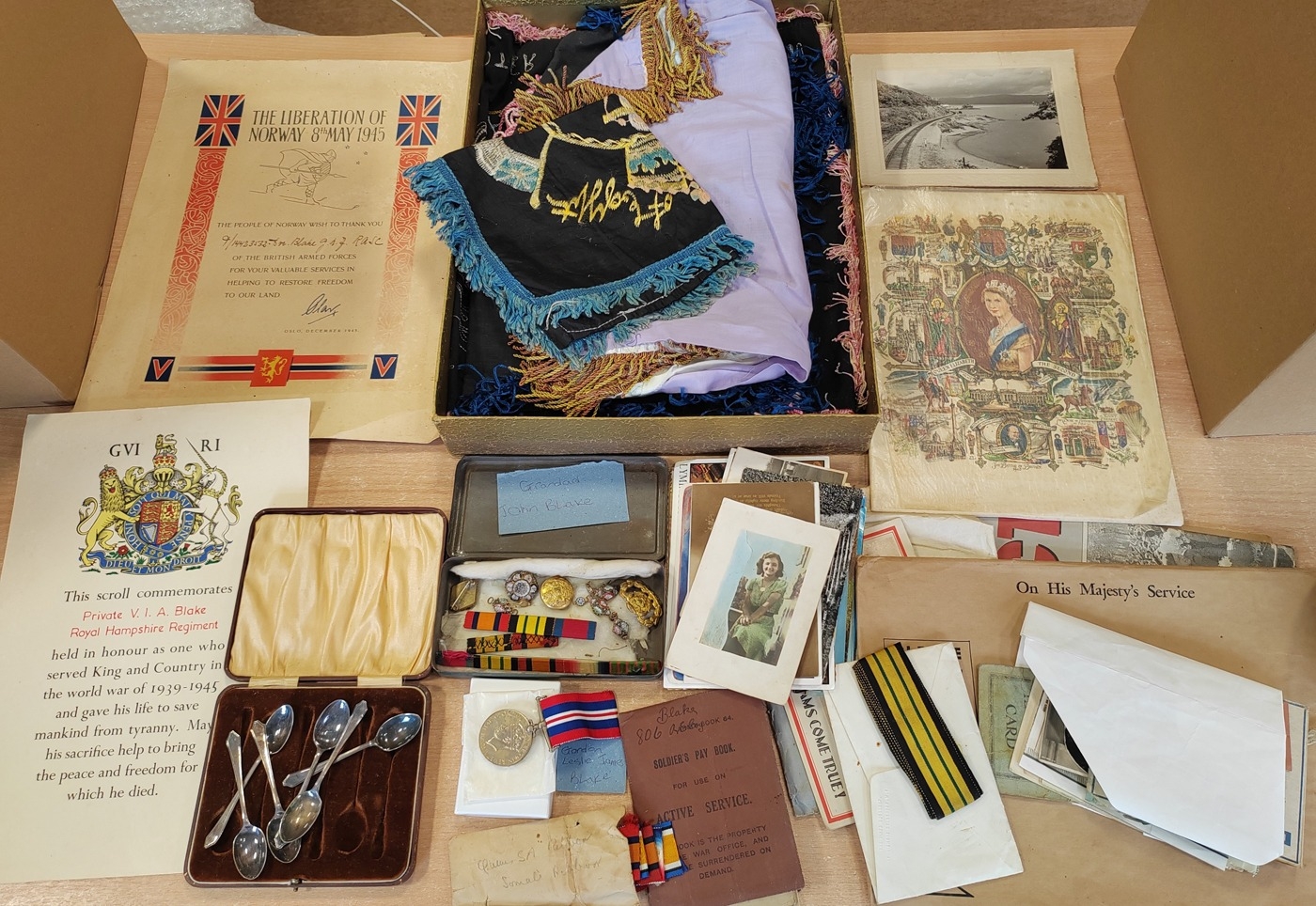 3. WW2 BWM, soldiers pay book, range of various buttons, pins, postcards, SAS patch, memorial scroll etc. (B)
