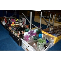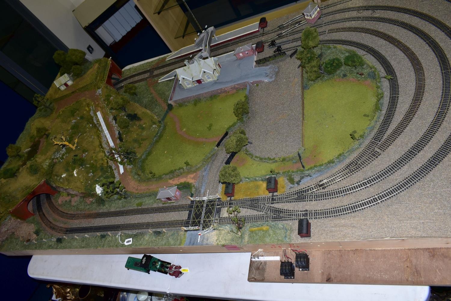 A 00 GAUGE MODEL RAILWAY LAYOUT, large double track oval with three sidings, laid on a chipboard base on a wooden frame, electrified points and building lighting (not tested), one end of the layout is modelled as a hill with double track tunnel running through it, access available to inside of tunnel through drop-down flap in hill base frame at end of layout, other features include a two platform station, signal box, footbridge and level crossing, buildings are loose on the layout and others are missing, layout has some minor damage wear and missing items, mainly trees and fencing, but overall has been built and finished to a good standard, approximate size of baseboard 240cm long x 122cm deep (please see a member of staff to view), together with a Thomas Kinkade's Christmas Express Locomotive and Tender, HO gauge, from the Hawthorn Village collection, locomotive by Bachmann is missing front wheels and has other minor damage