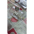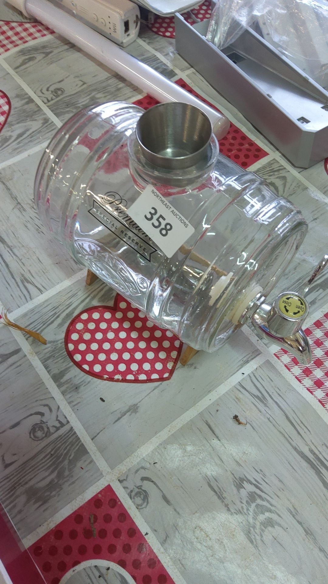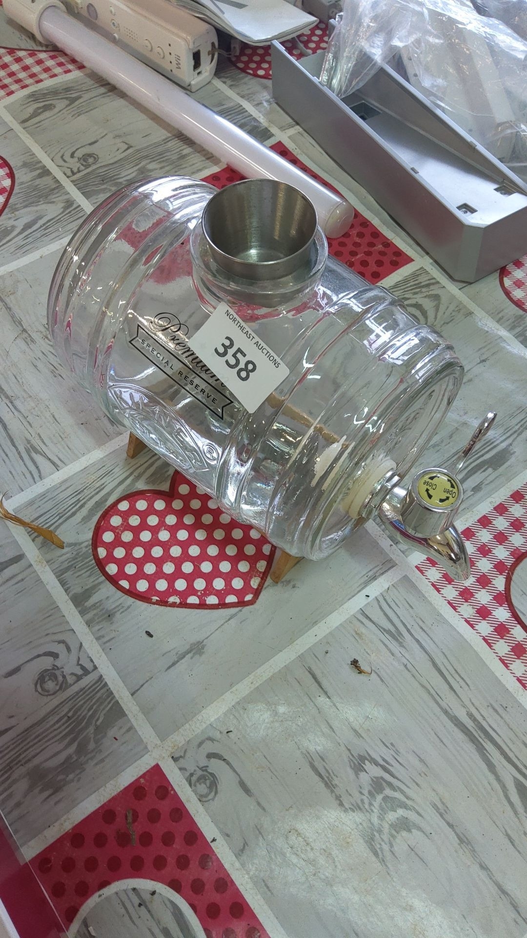 Glass barrel decanter with wooden stand and shot measure,featuring a metal spout and "Premium Special Reserve" label.