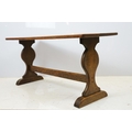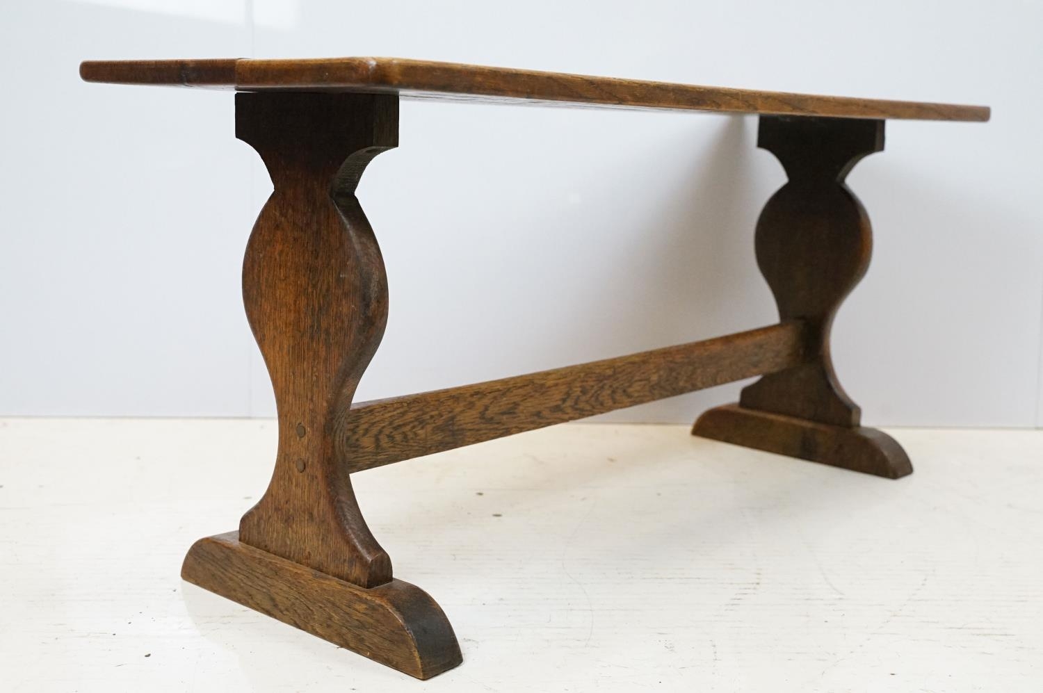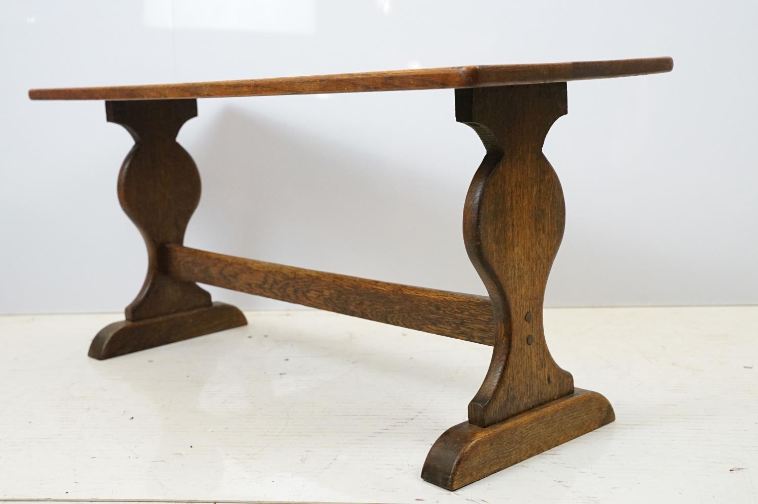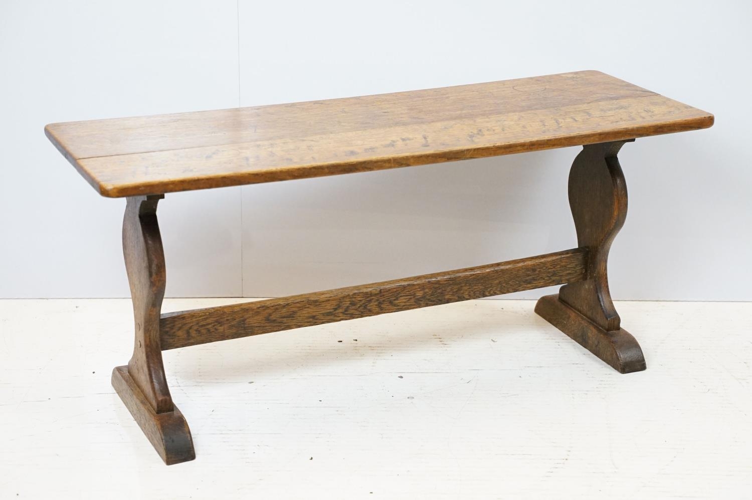 Oak coffee table of stretchered form, 41cm high x 91cm wide x 32cm deep