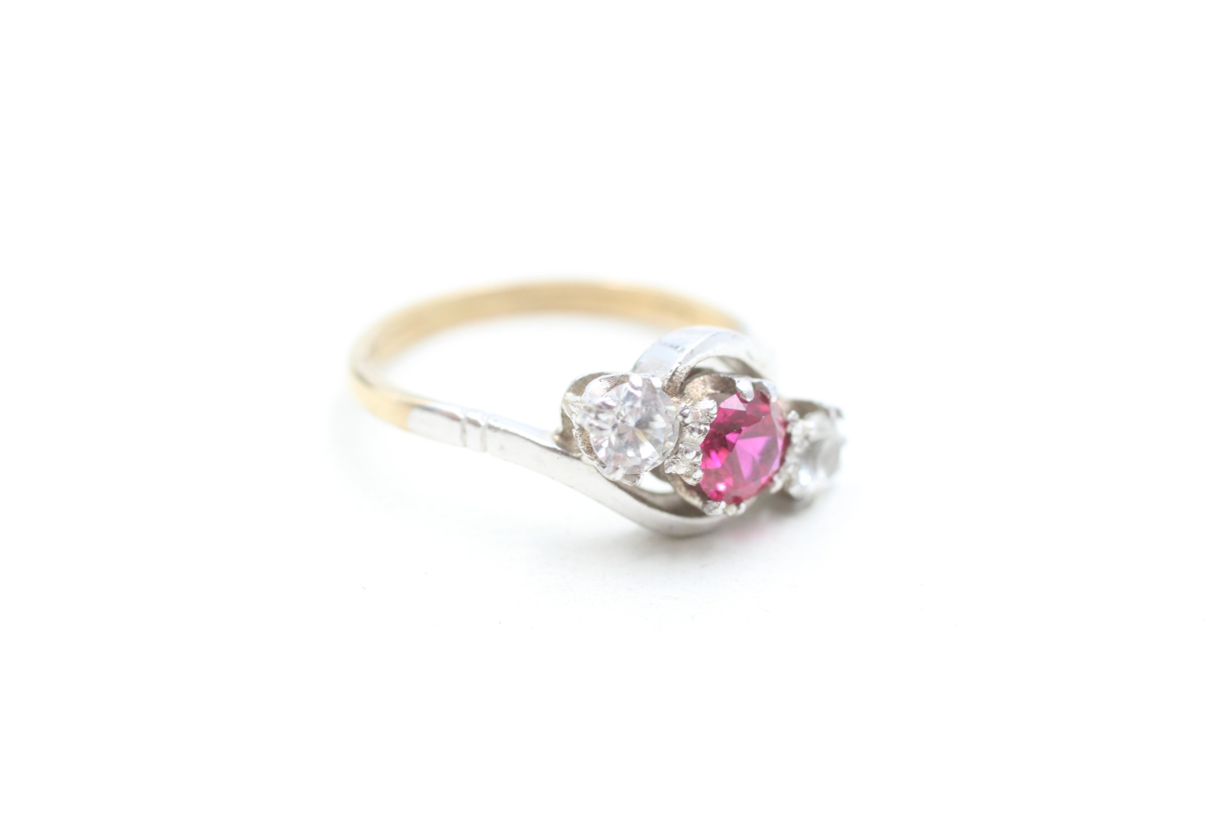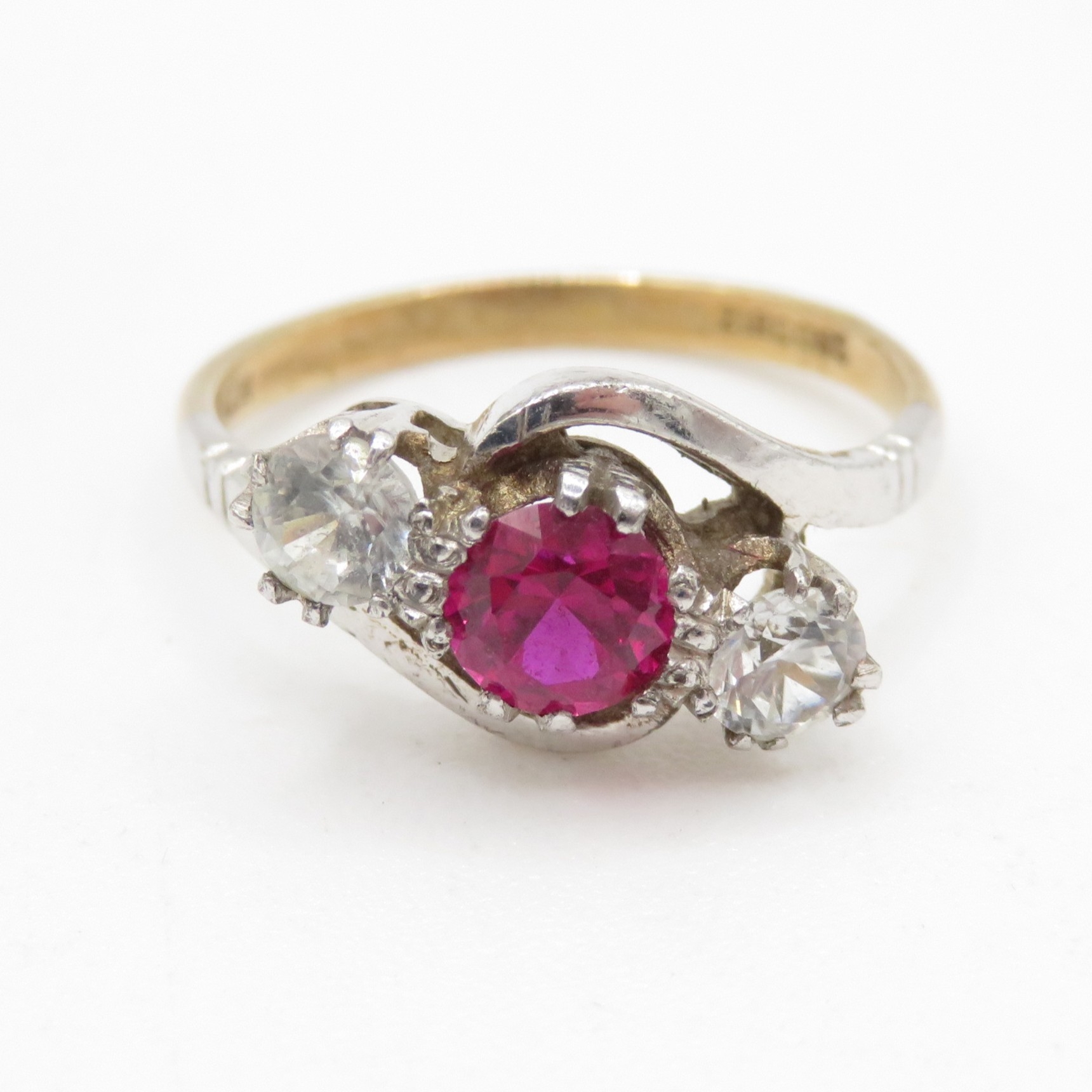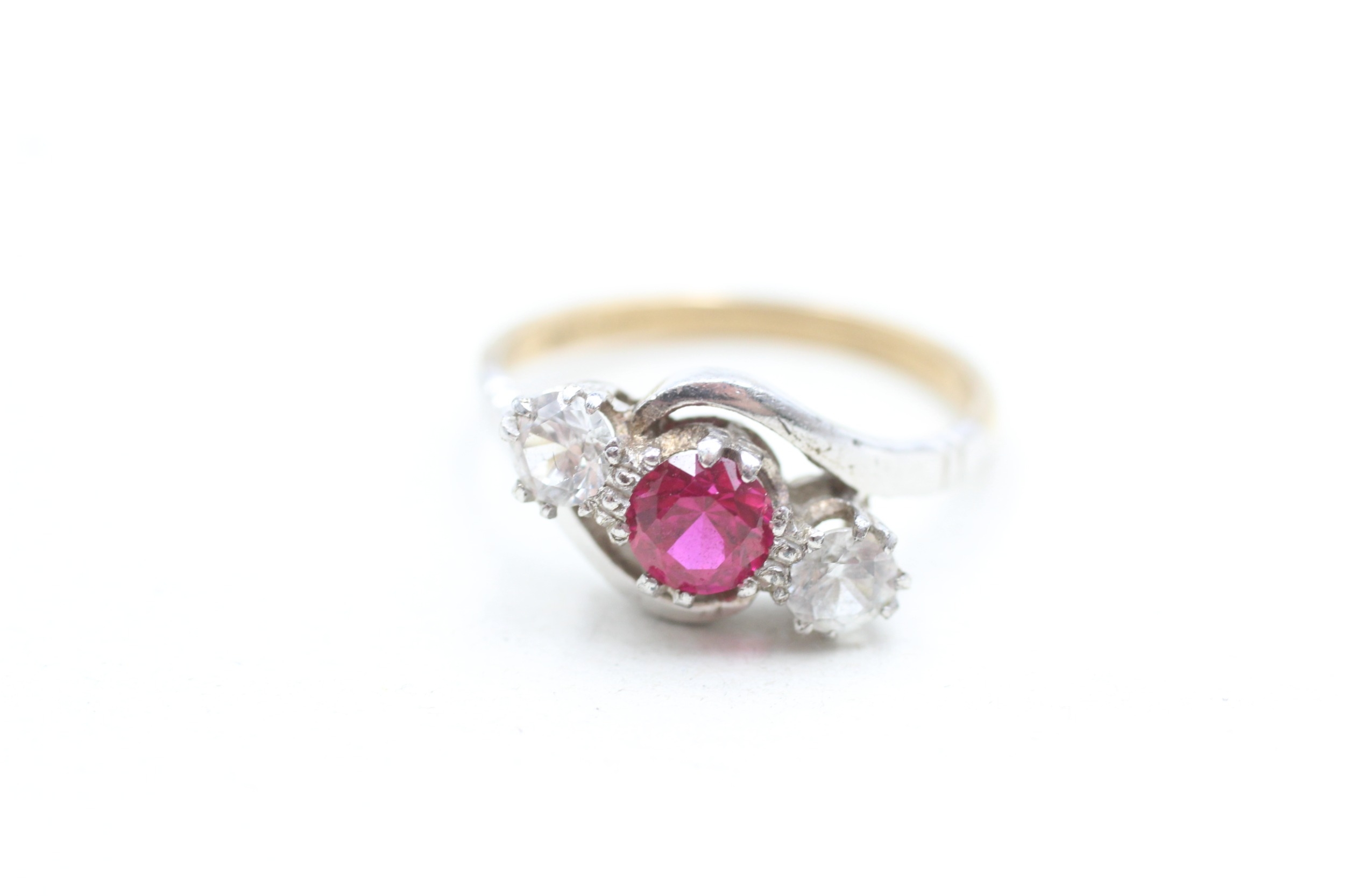 9ct gold synthetic ruby and zircon trilogy ring (2.2g) Size M