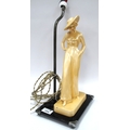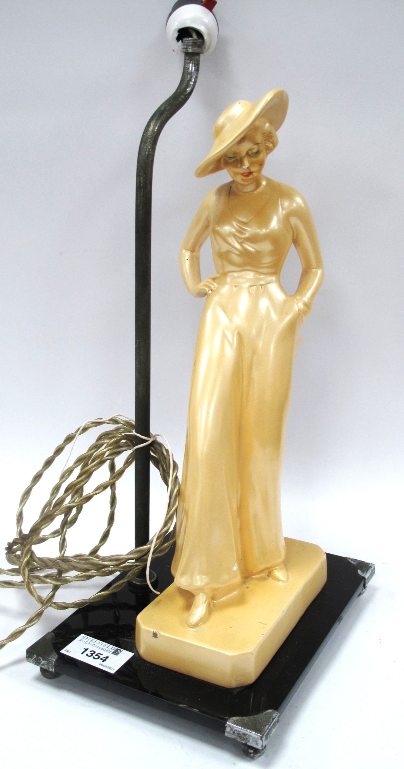Art Deco Table Lamp of a Lady Wearing a Hat, mounted on a black glass base, 37cm high.