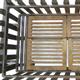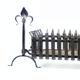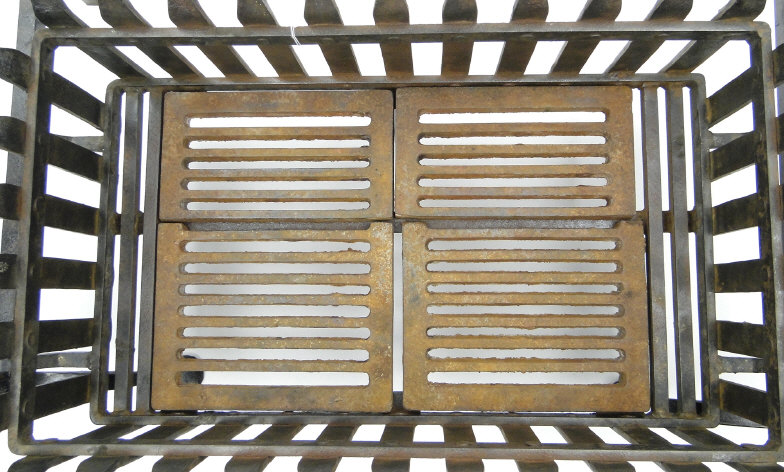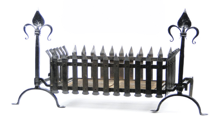 Large cast iron fire grate resting on wrought iron andirons with leaf terminals