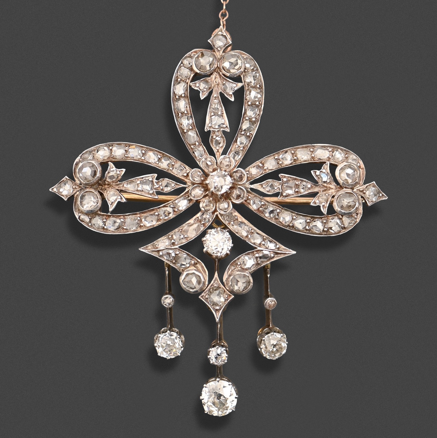 A diamond brooch-pendant, late 19th c, of old cut diamonds, with three drops, mounted in silver and gold, 57mm h, 16.7g