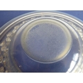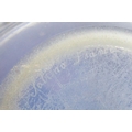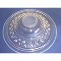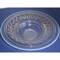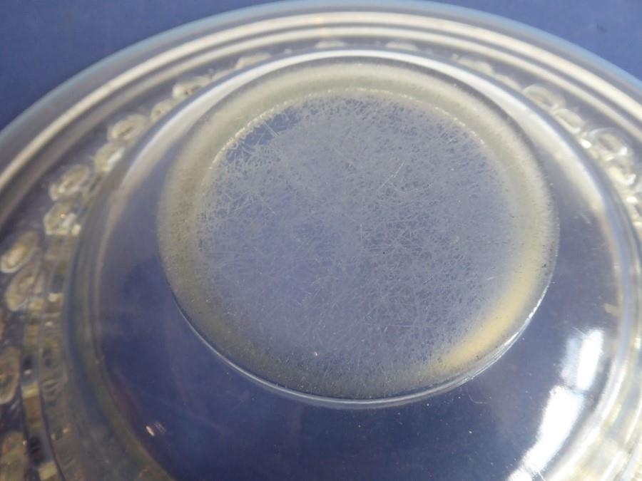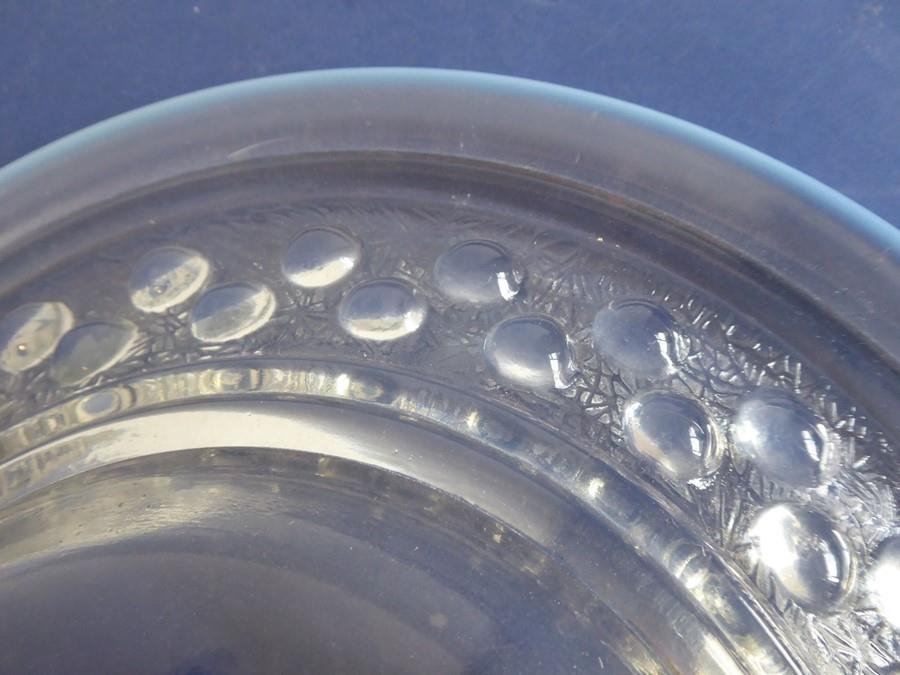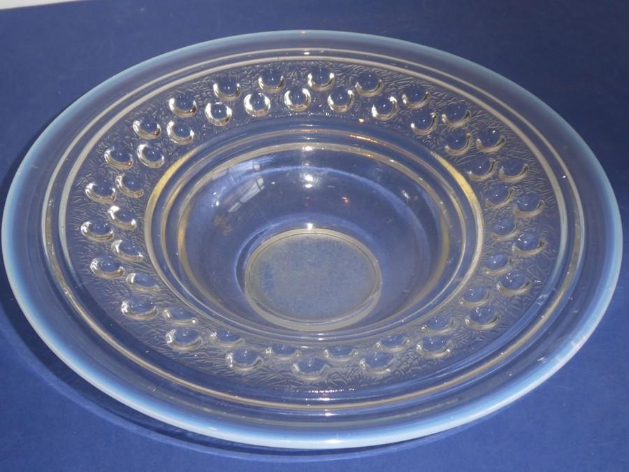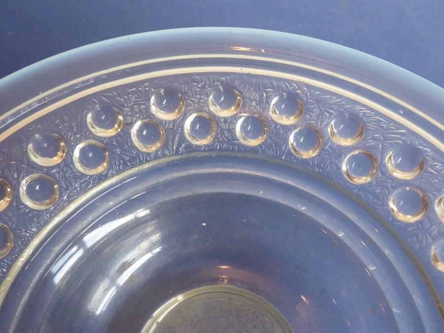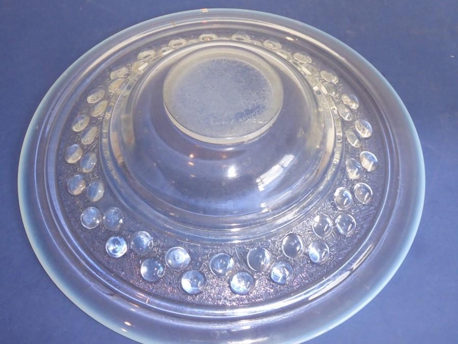 A large and heavy Art Deco period circular glass bowl with opalescent rim and inner border of half spheres in relief to the underside, significant scratches and wear to the underside of the foot and also engraved to underside Sabino, France (35cm diameter)