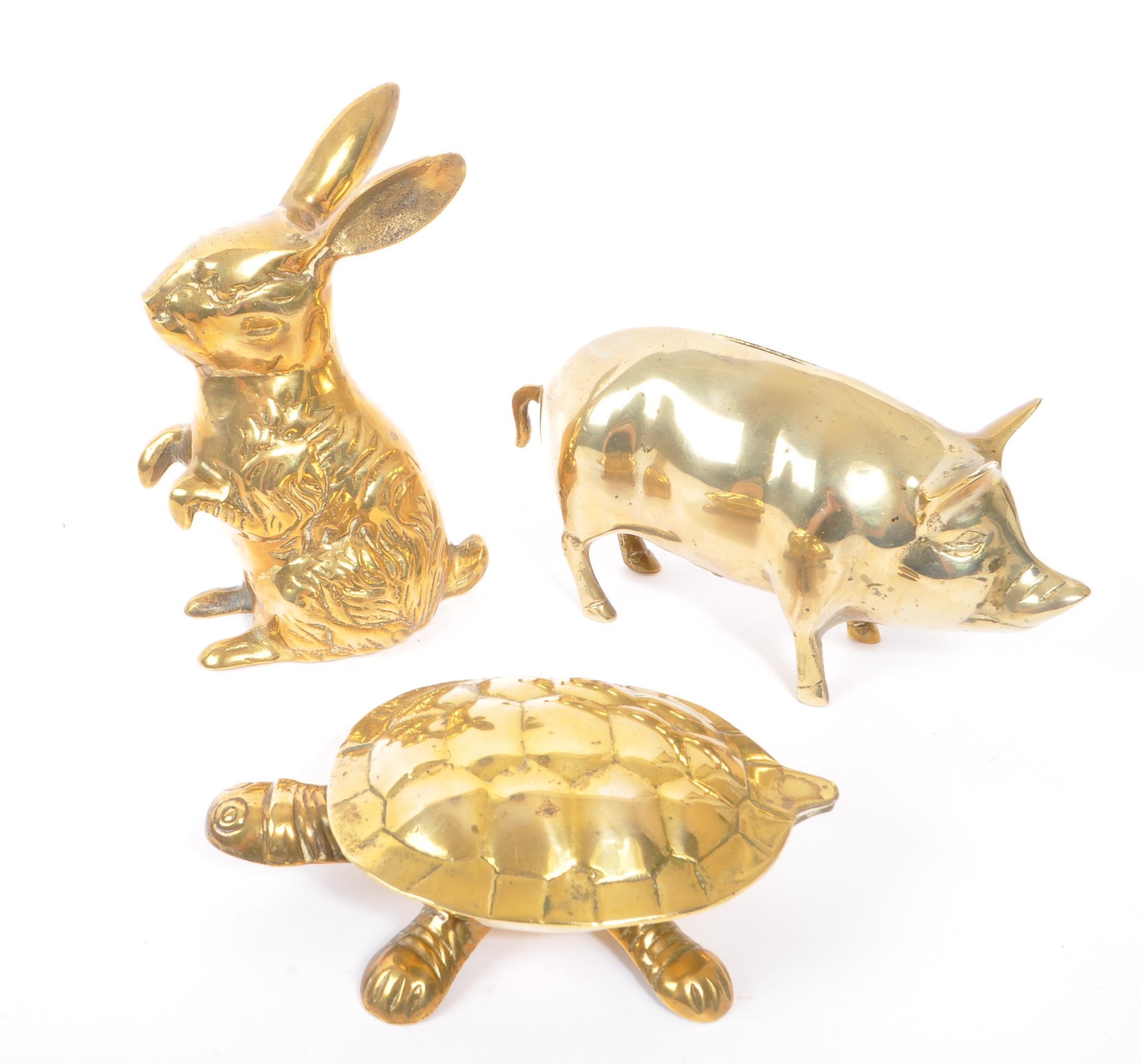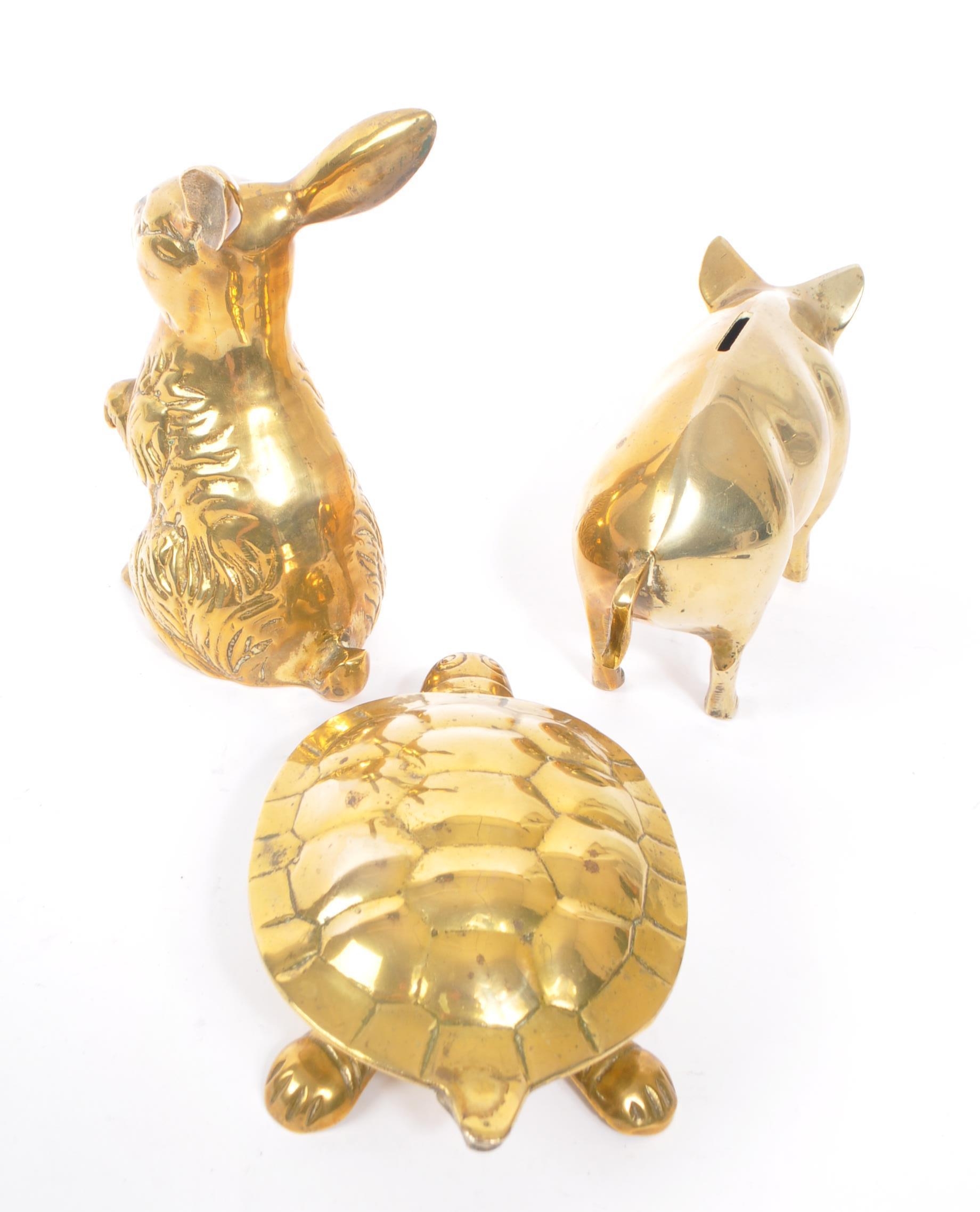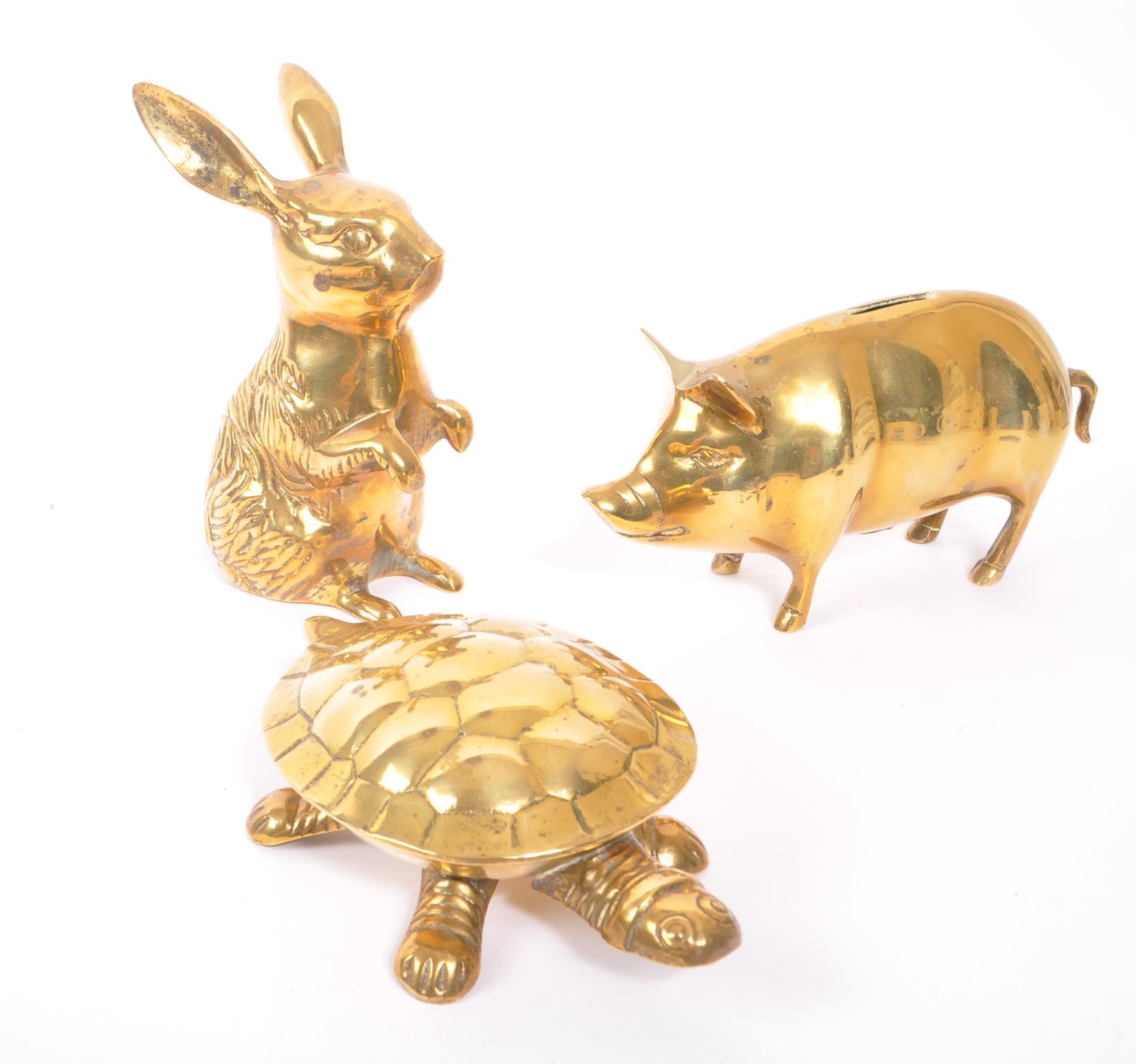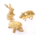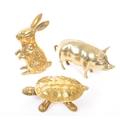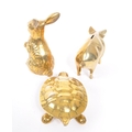 A collection of 20th century brass animal figures. The collection to include a brass pig money box, alongside a rabbit / hare figure, and tortoise ashtray / trinket dish with hinged shell lid.