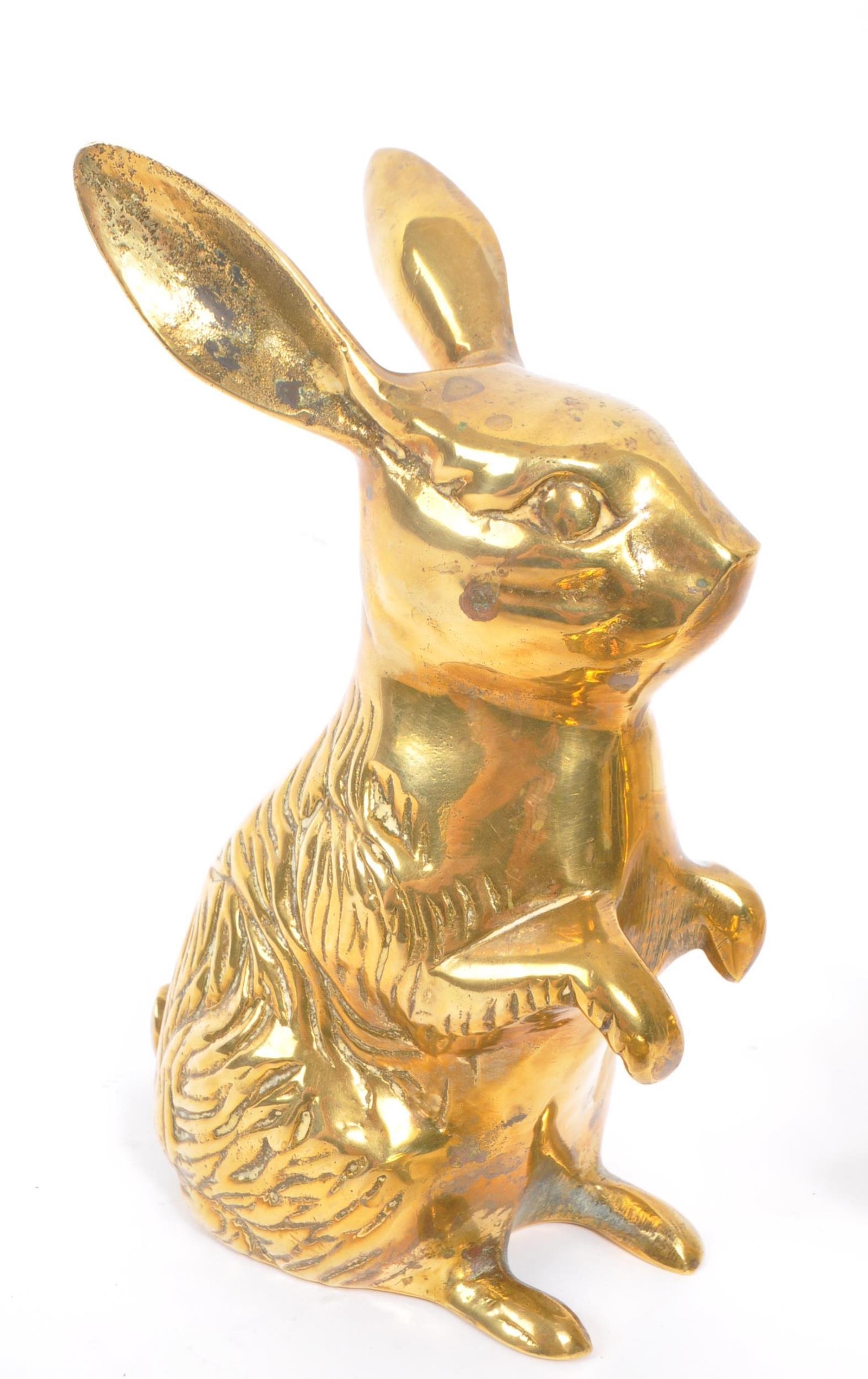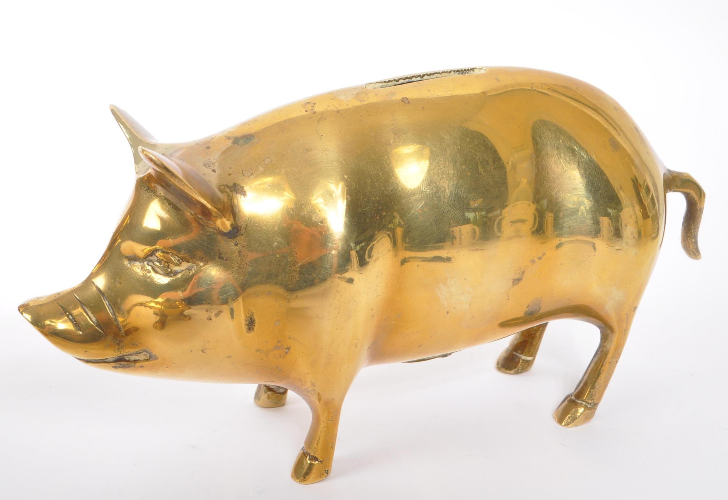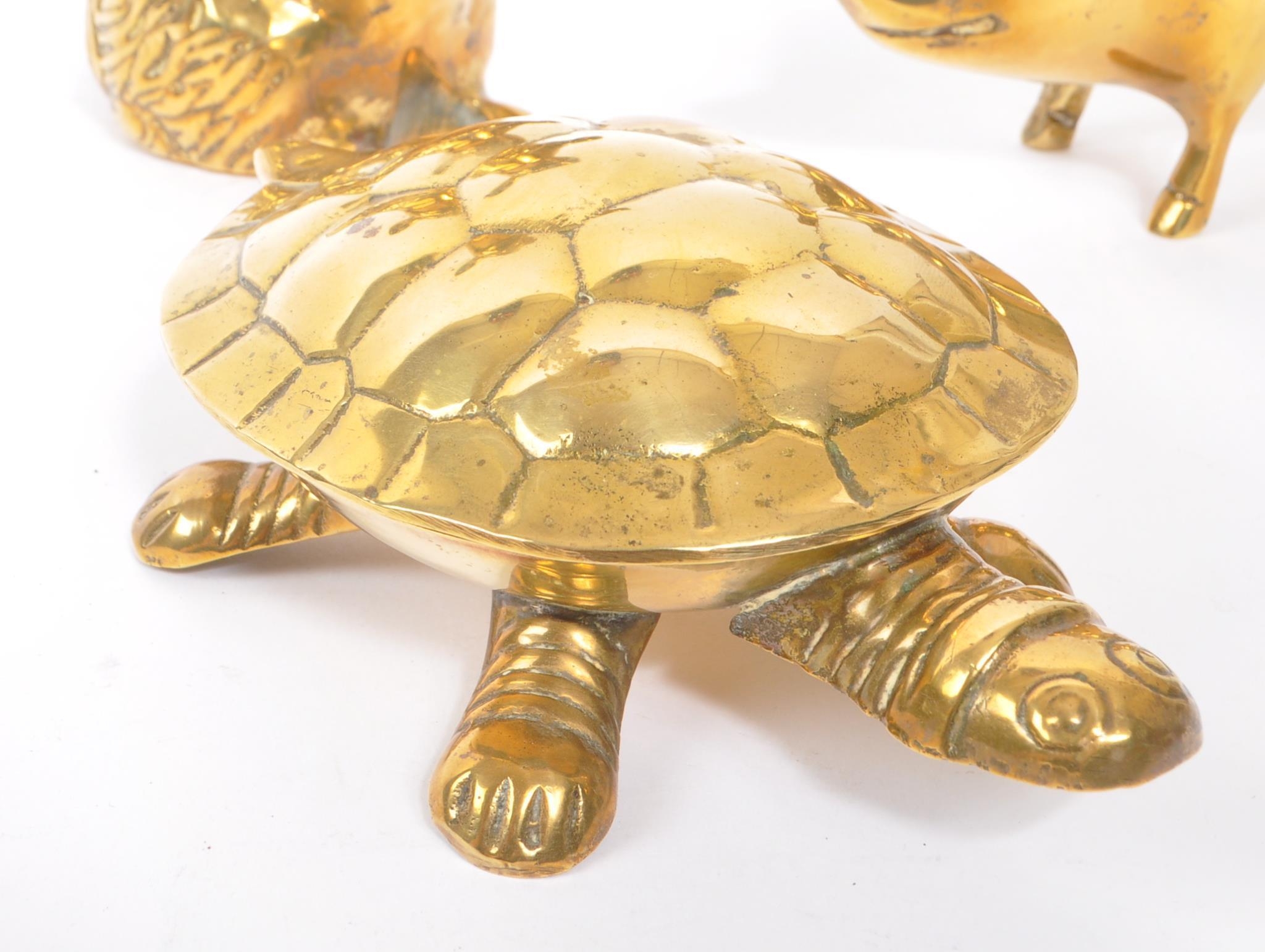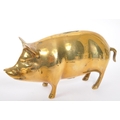 A collection of 20th century brass animal figures. The collection to include a brass pig money box, alongside a rabbit / hare figure, and tortoise ashtray / trinket dish with hinged shell lid.