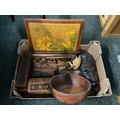 A box of assorted treen to include bowl, gavels, lidded boxes, plaque, figures etc