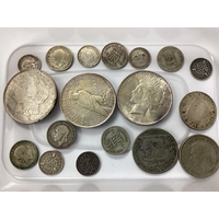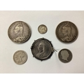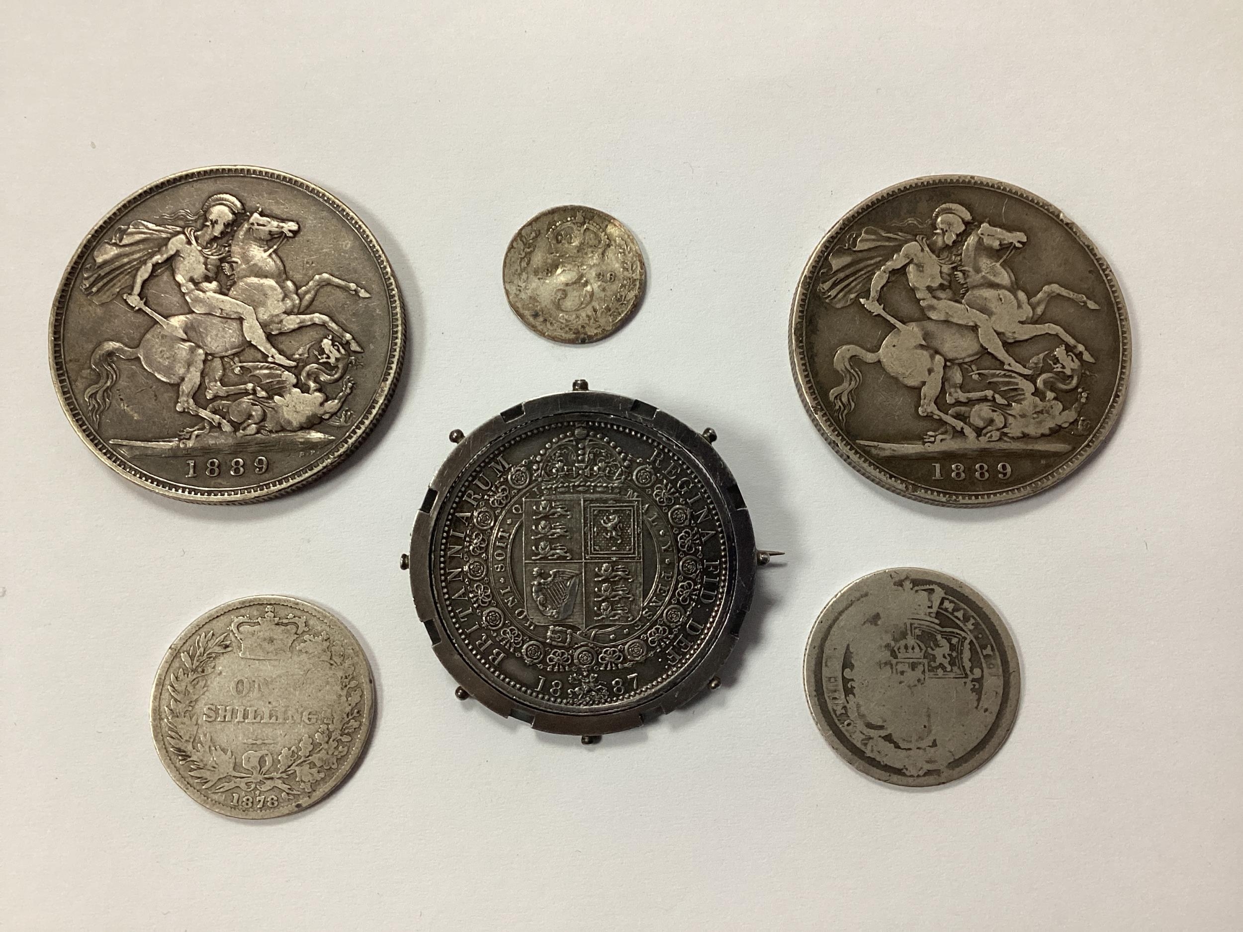 Six GB XIX Century Silver Coins, including two 1889 Crowns, 1887 Half Crown in a mount, 1819 George III Shilling, 1878 Shilling and an 1896 Threepence.