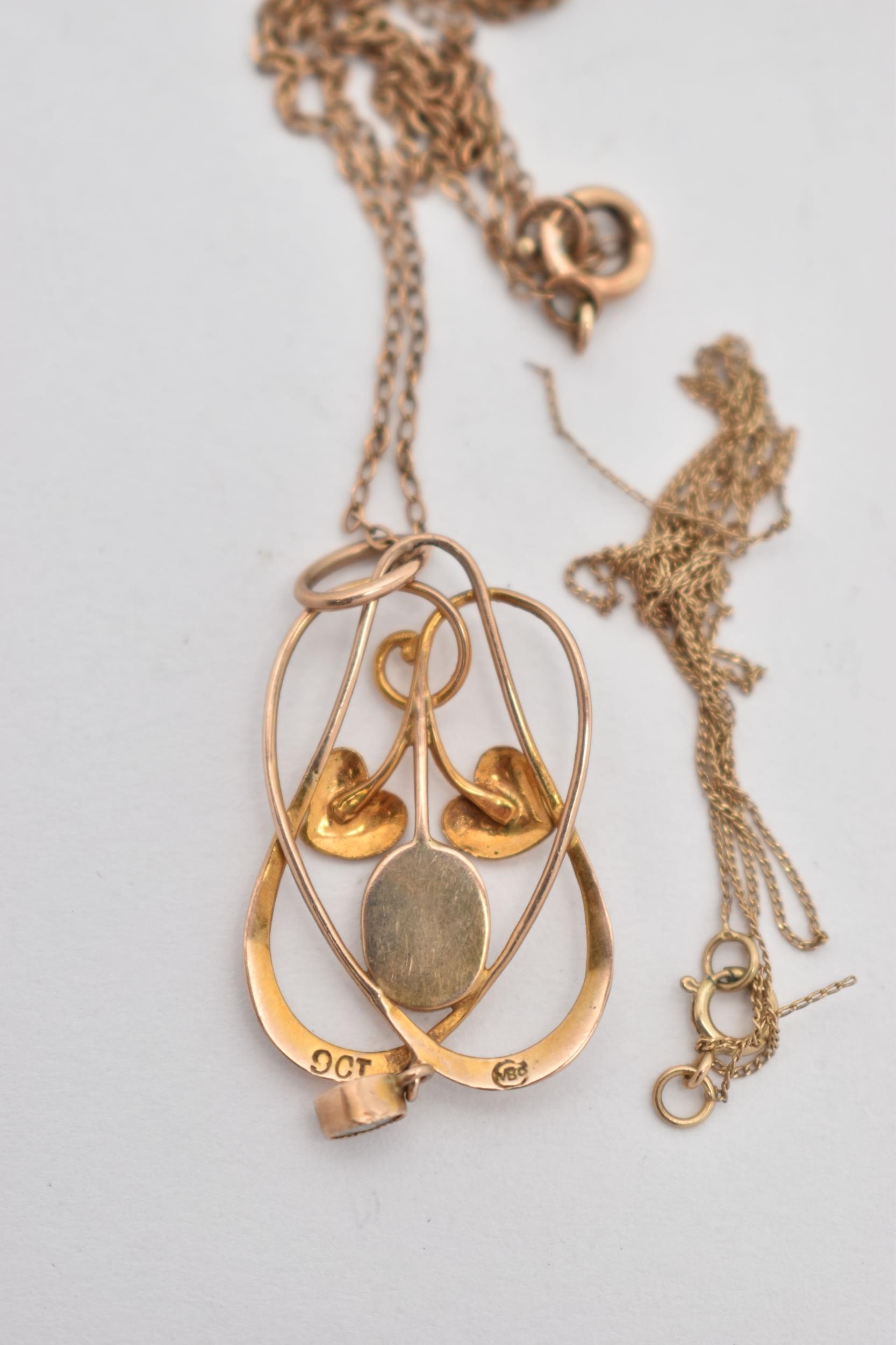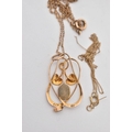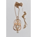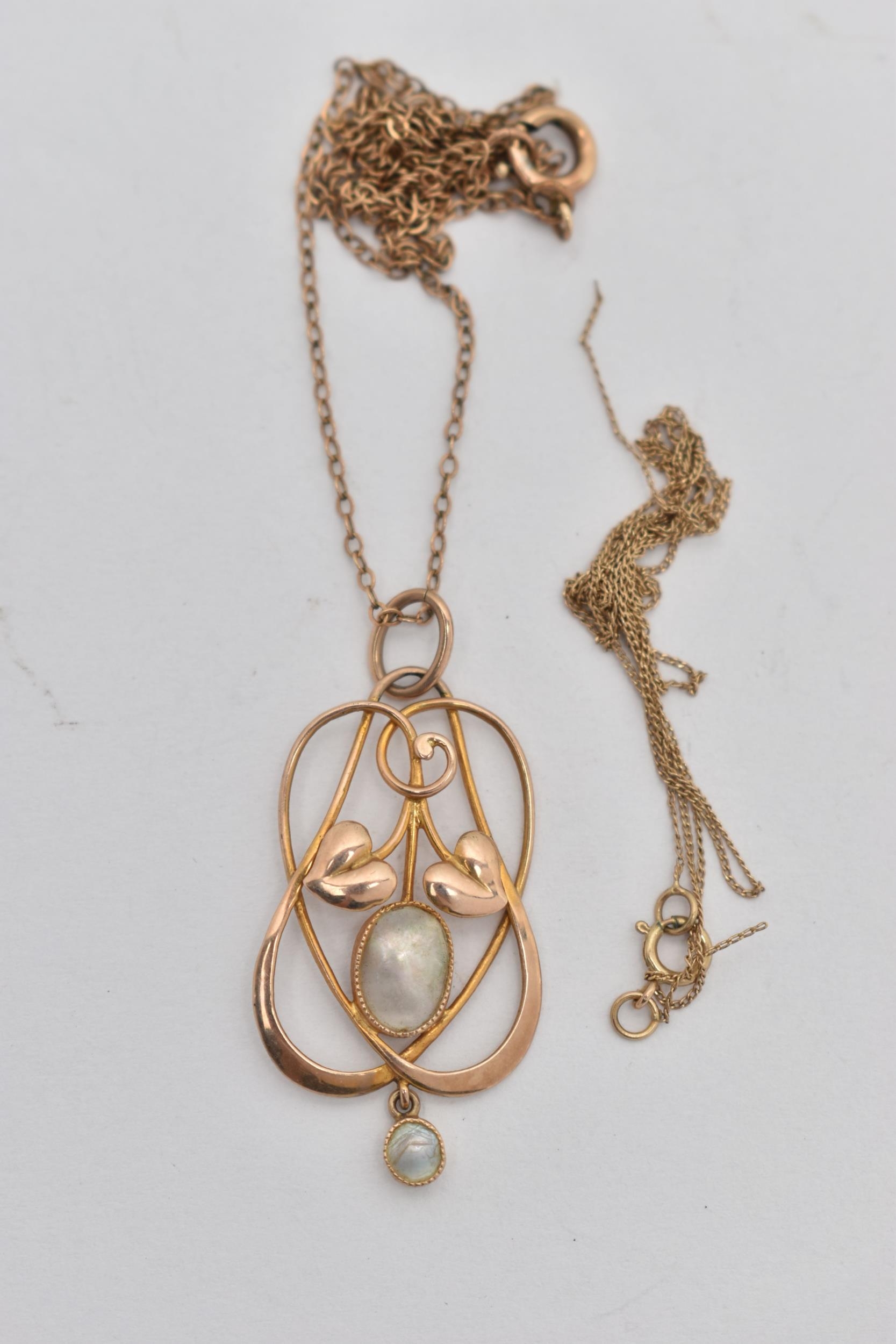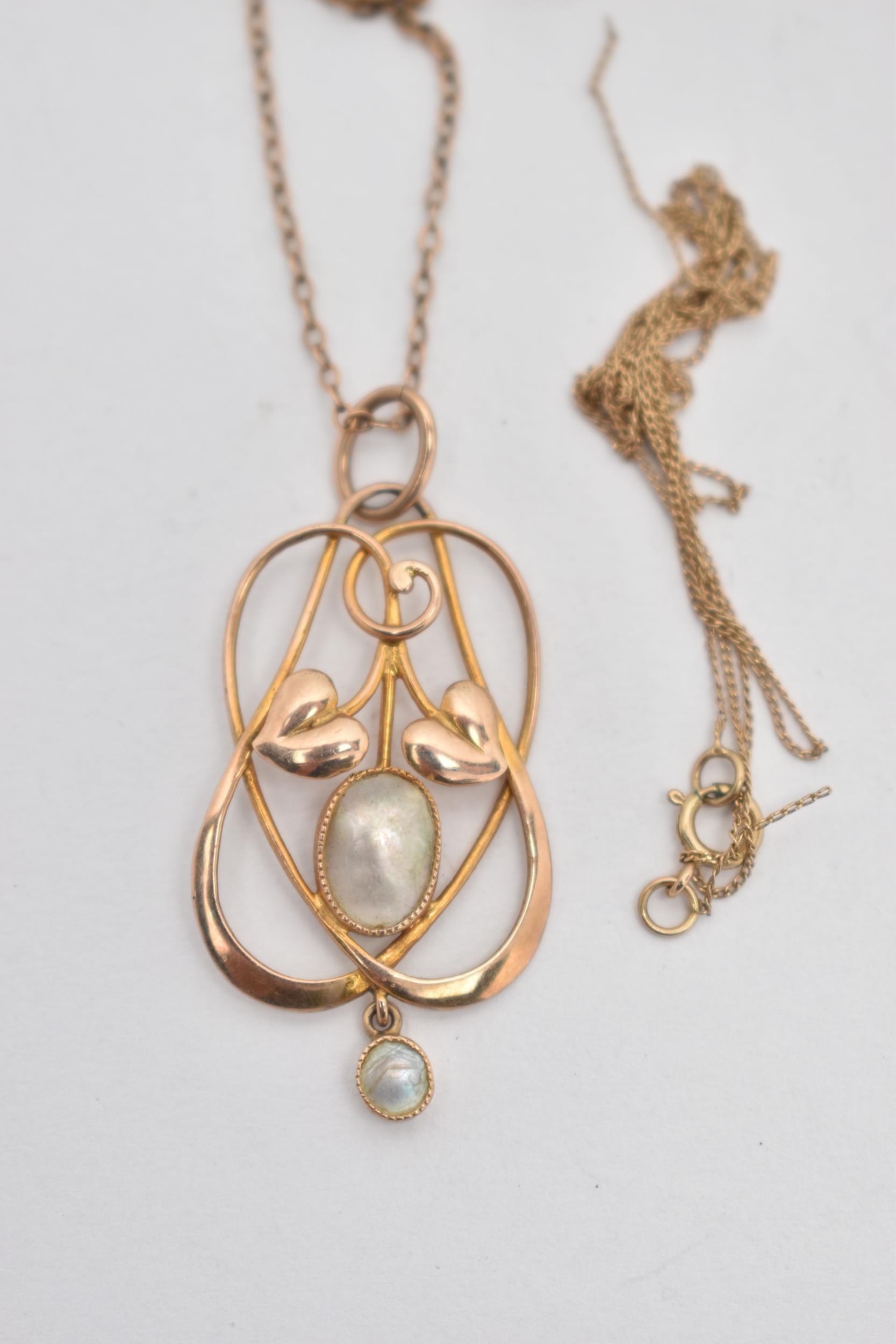 A MURRLE BENNETT 9CT GOLD PENDANT, of organic design with vine leaves and a central oval blister pearl and suspending a circular blister pearl, suspended from a fine belcher link chain, pendant stamped 9ct MB Co, length of pendant 37mm, approximate total weight 3 grams (condition report: overall good condition, light to moderate surface scratches)