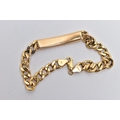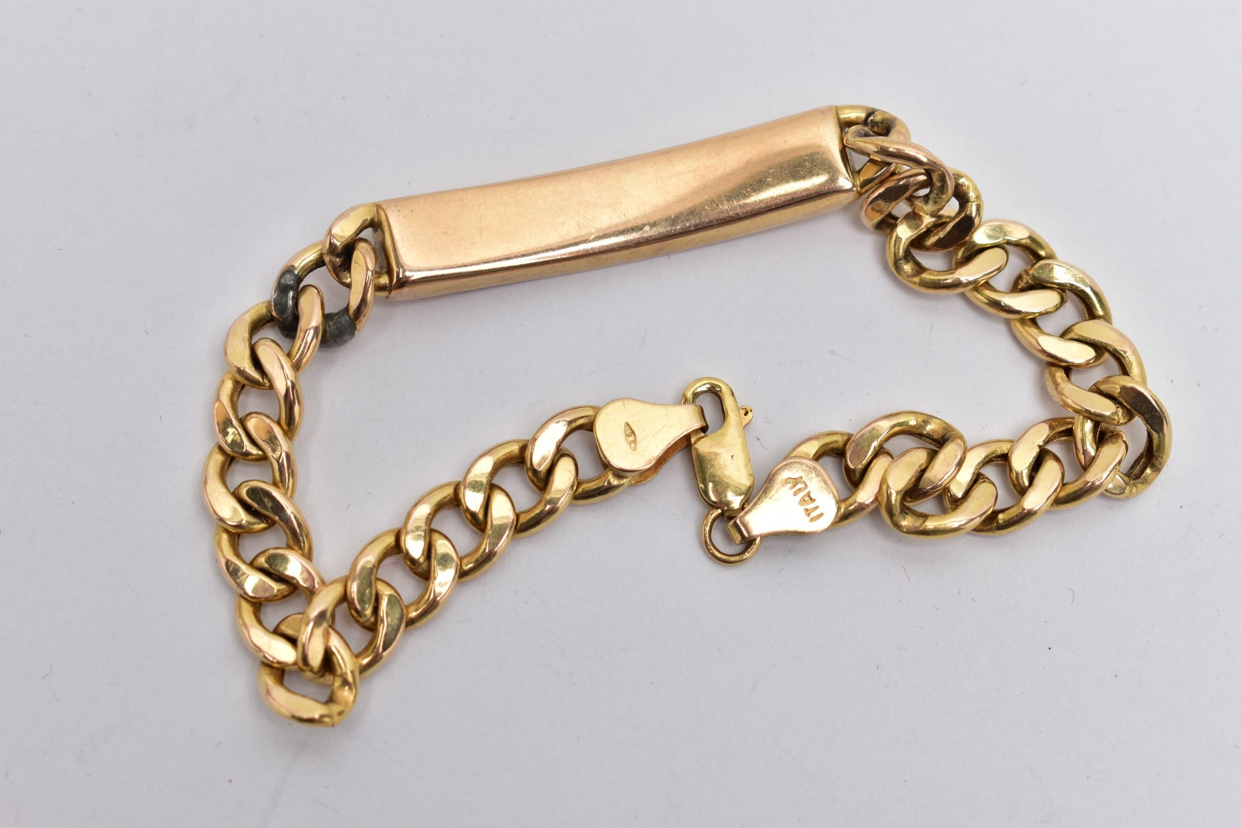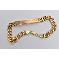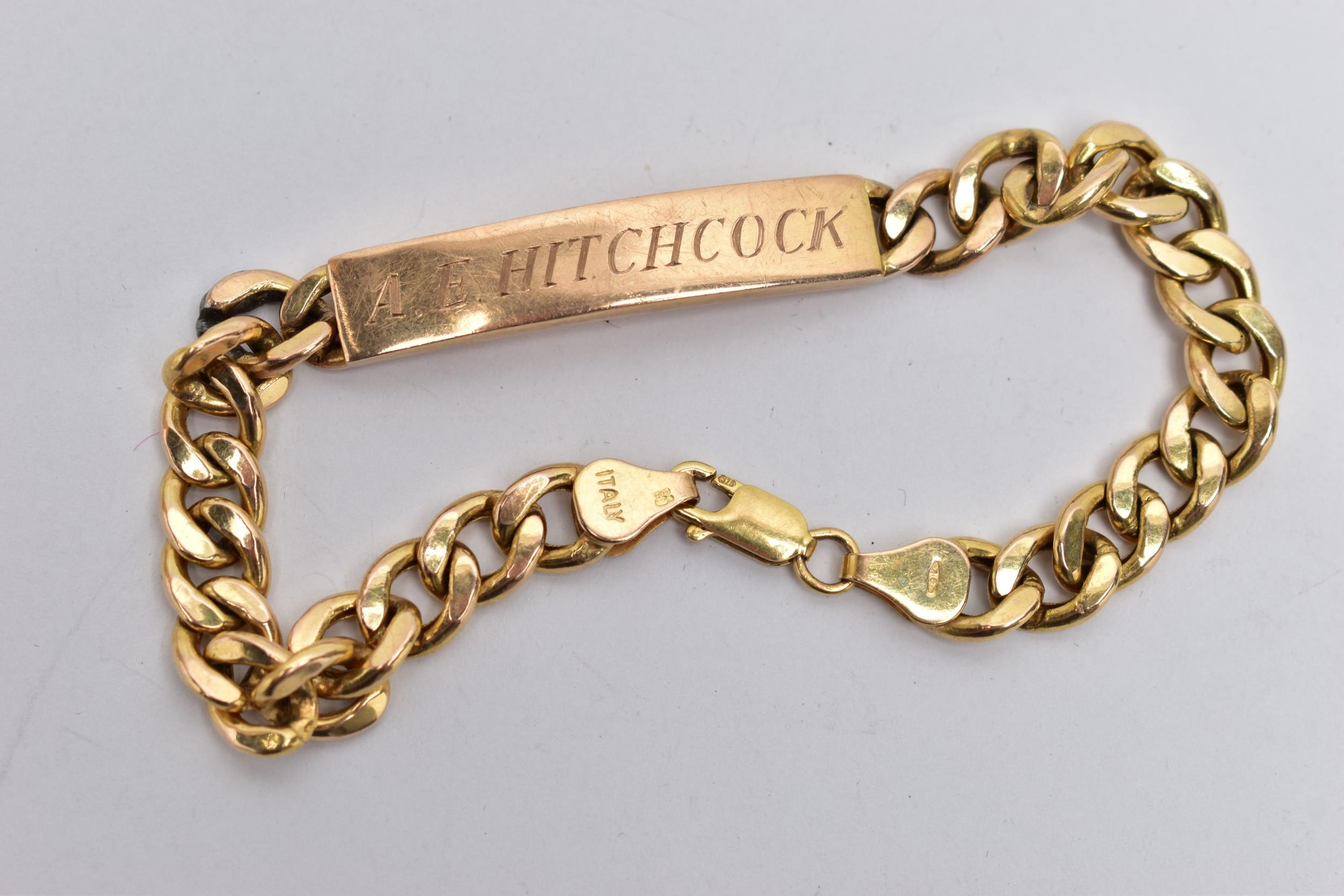 A 9CT YELLOW GOLD, IDENTIFICATION BRACELET, panel engraved 'A.E.Hitchcock', fitted to a hollow curb link chain with lobster clasp, hallmarked 9ct Birmingham, approximate gross weight 11.3 grams, length 210mm (condition report: visible white metal solder marks to some links, clasp in working condition, surface scratches)