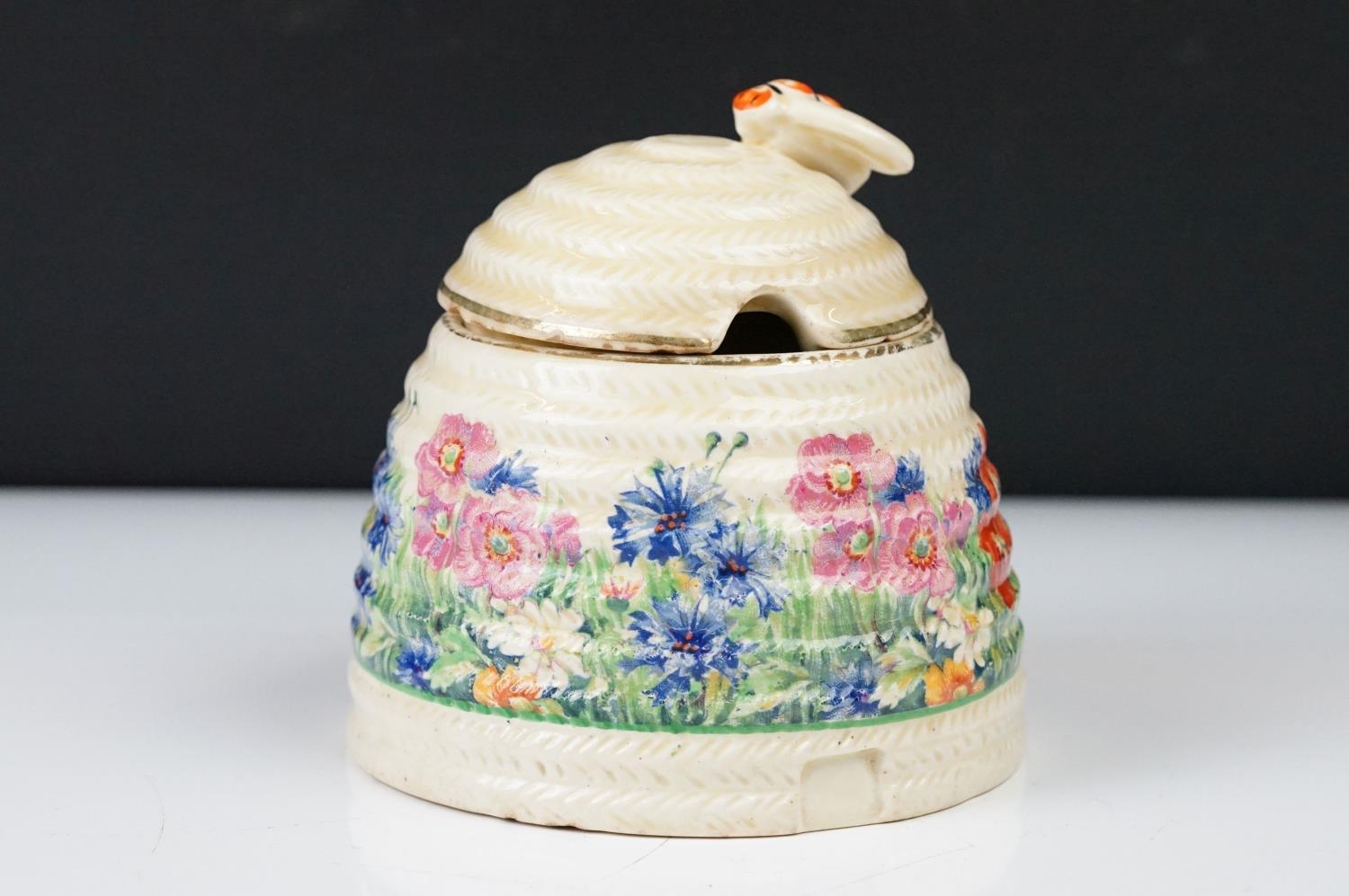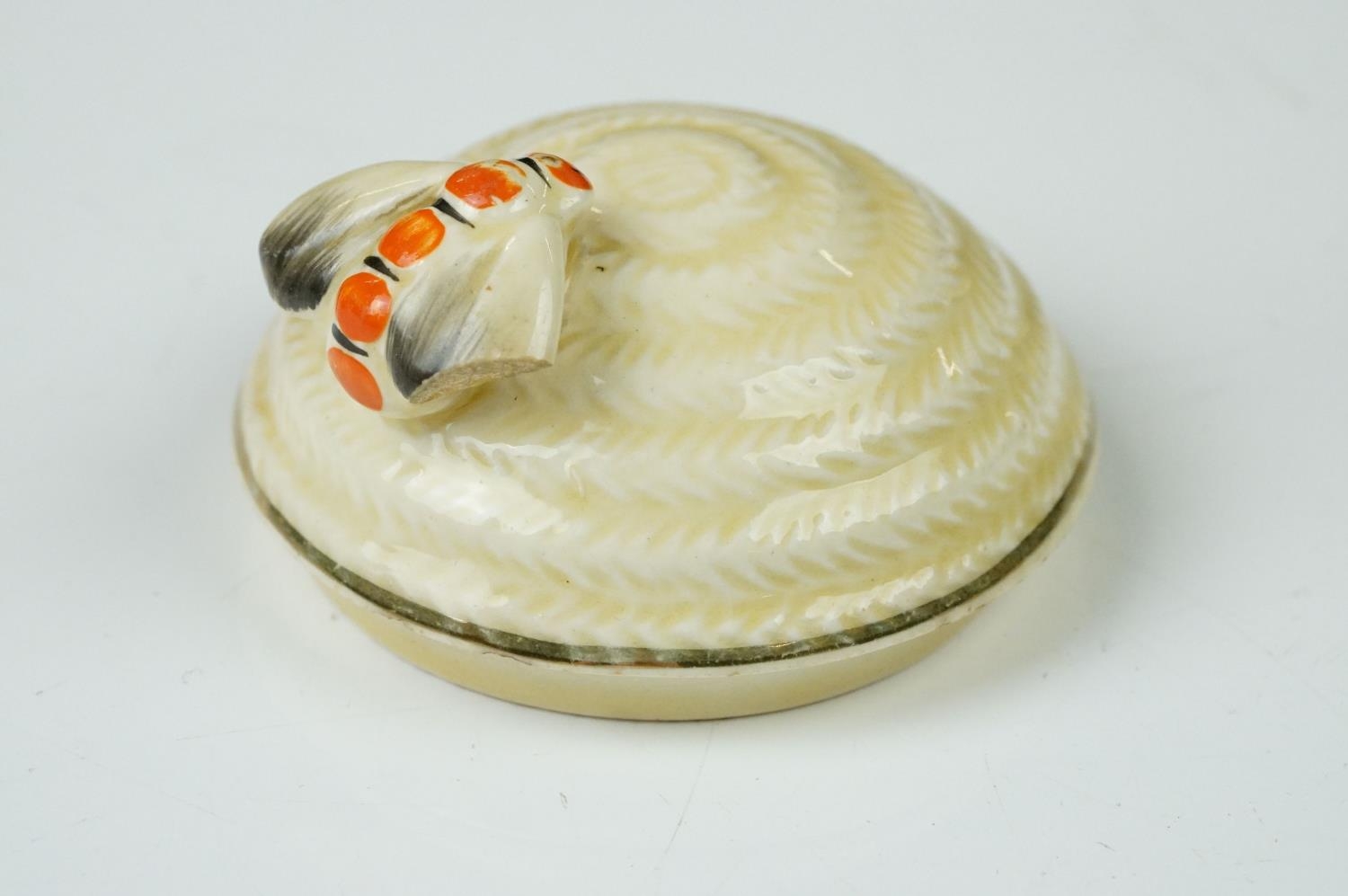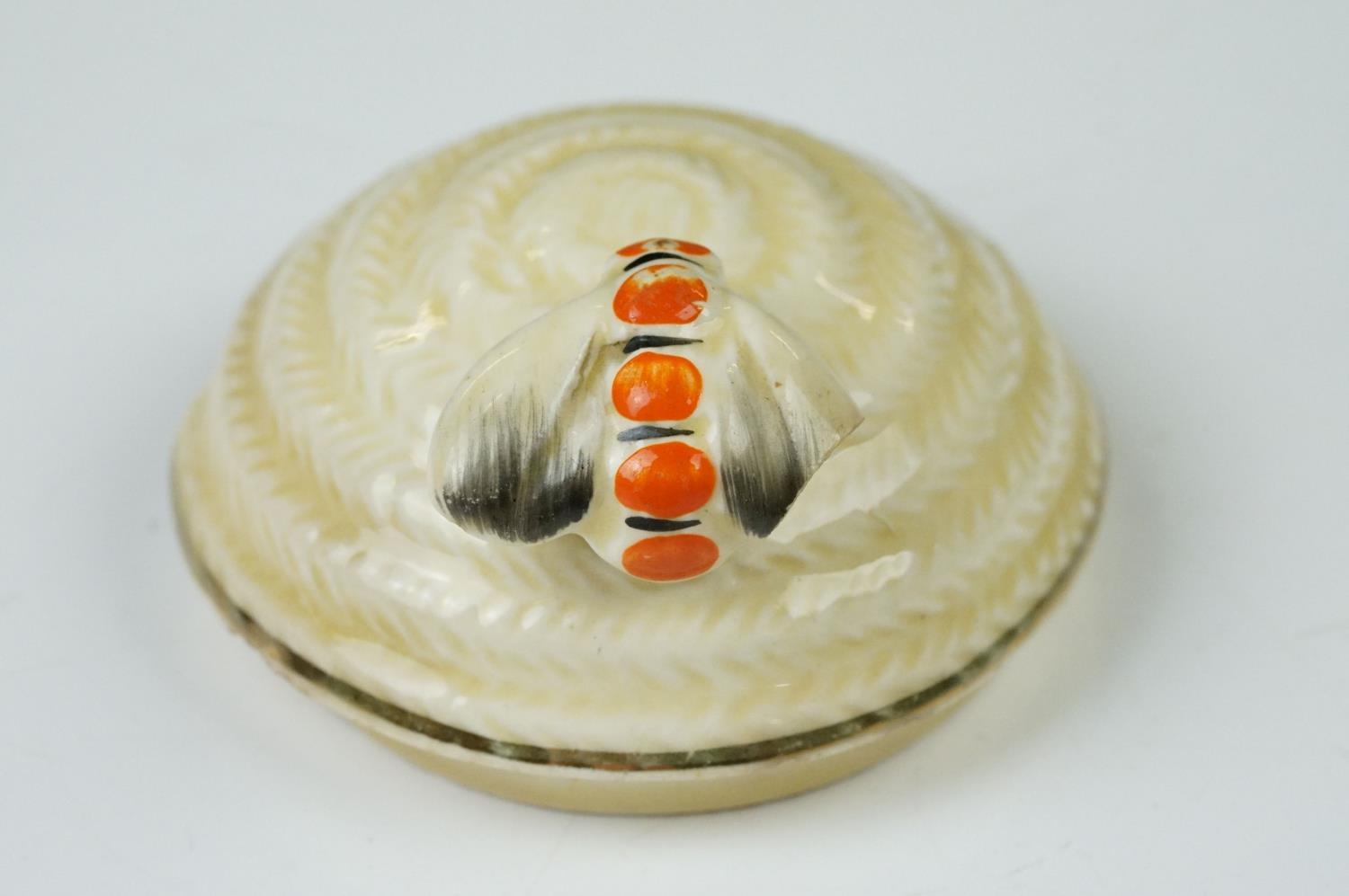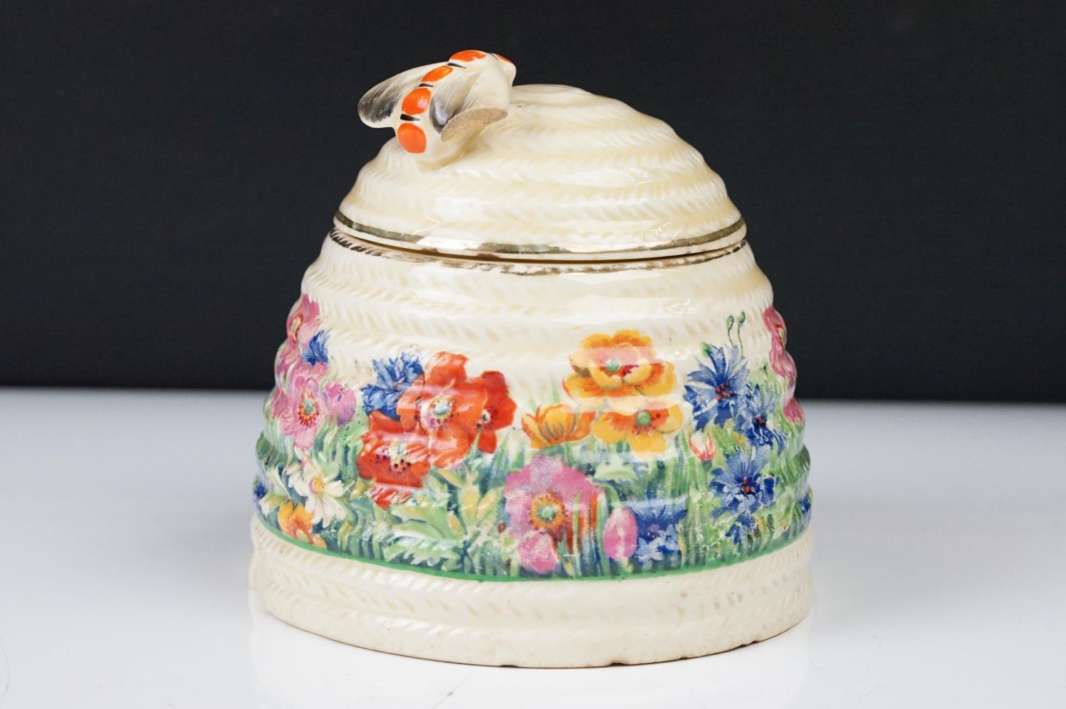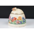 Clarice Cliff Pottery Beehive Honey Pot in the Radiance pattern (damage to wing of bee), 11cm high