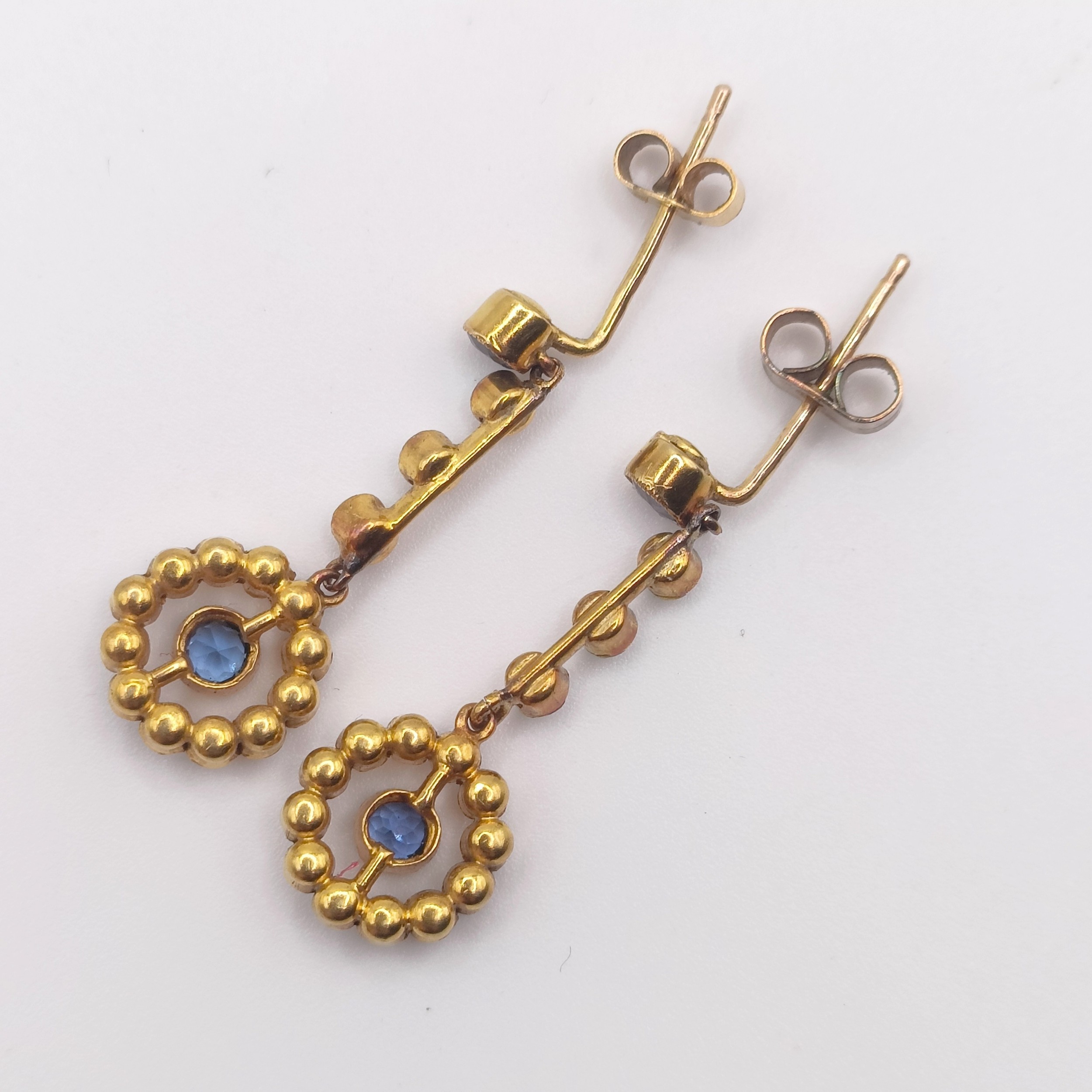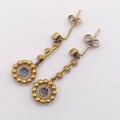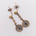A pair of yellow coloured metal, seed pearl and aquamarine drop earrings