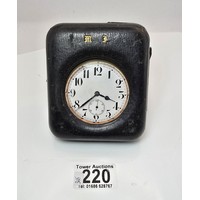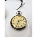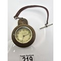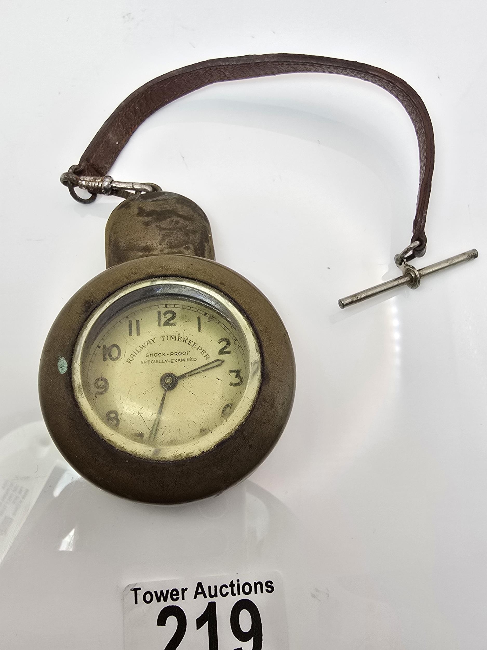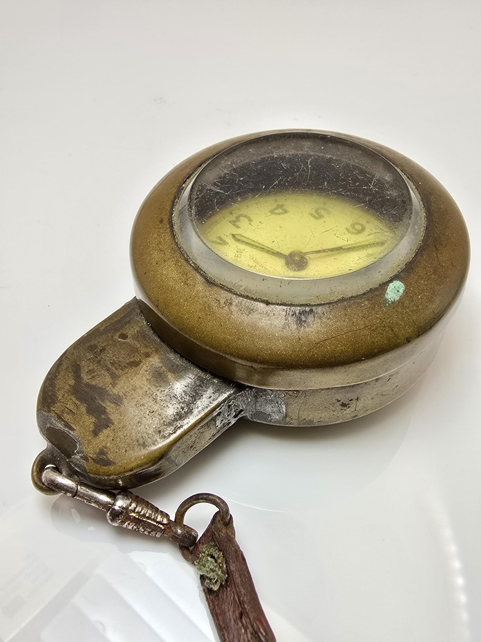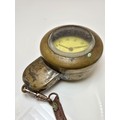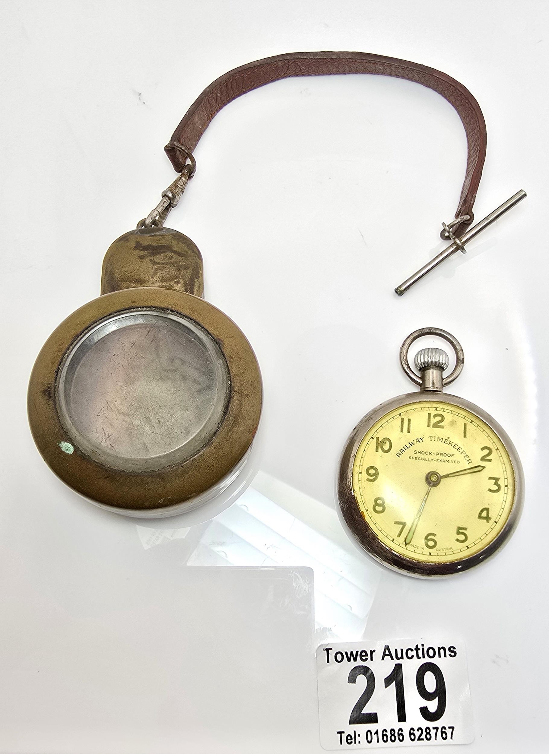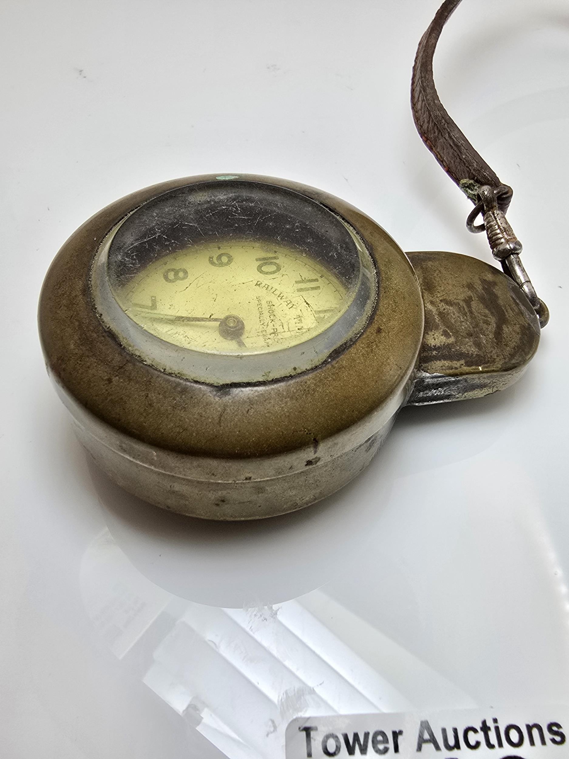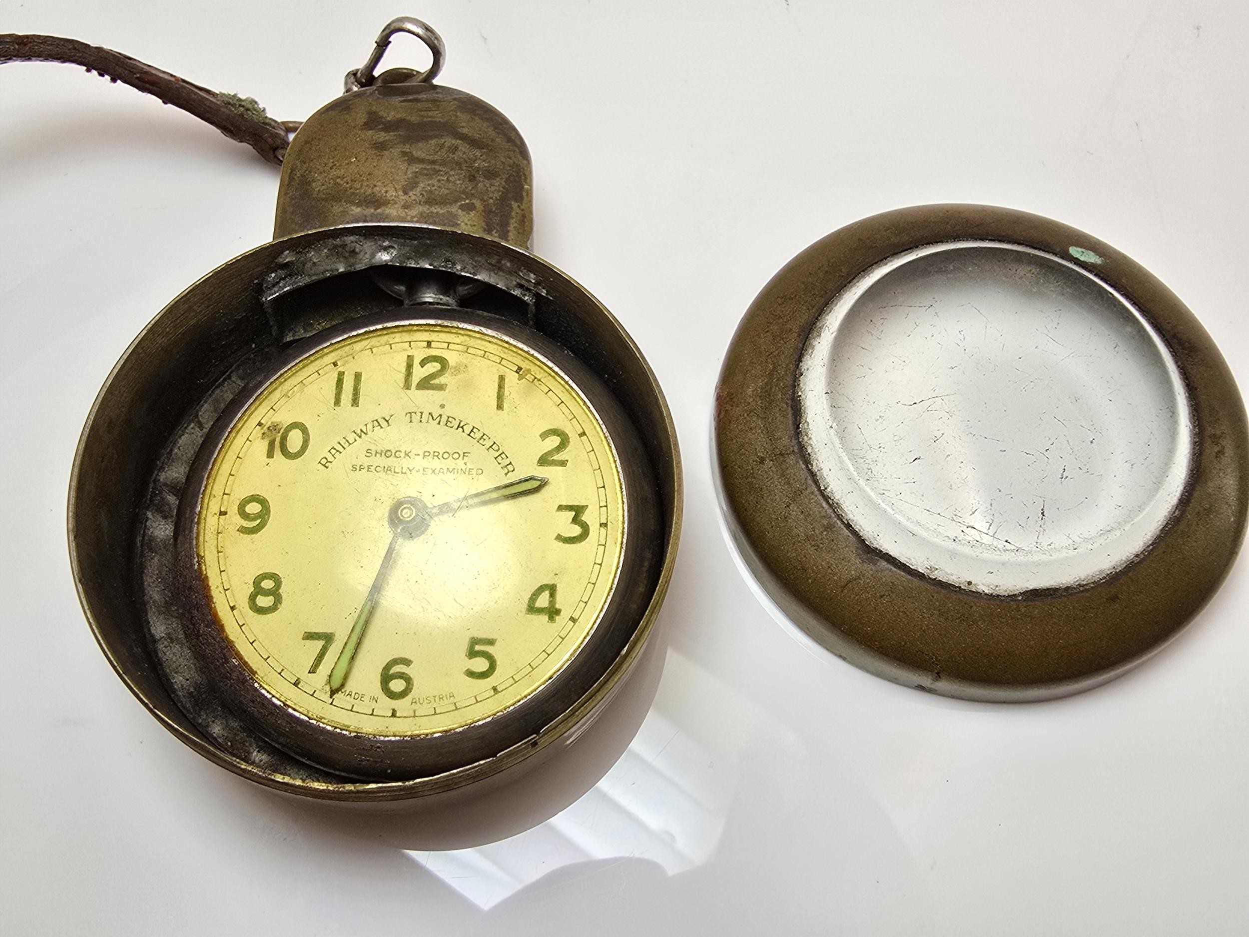 A good vintage heavy duty brass miners pocket watch case complete with a railway timekeeper vintage pocket watch, the brass pocket watch holder was used by miners in the early 20th century and is designed to protect the watch in harsh working conditions, it features a thick bevelled glass viewing window, has a screw top mechanism to open and has its original lather strap. The pocket watch is not in working order.