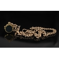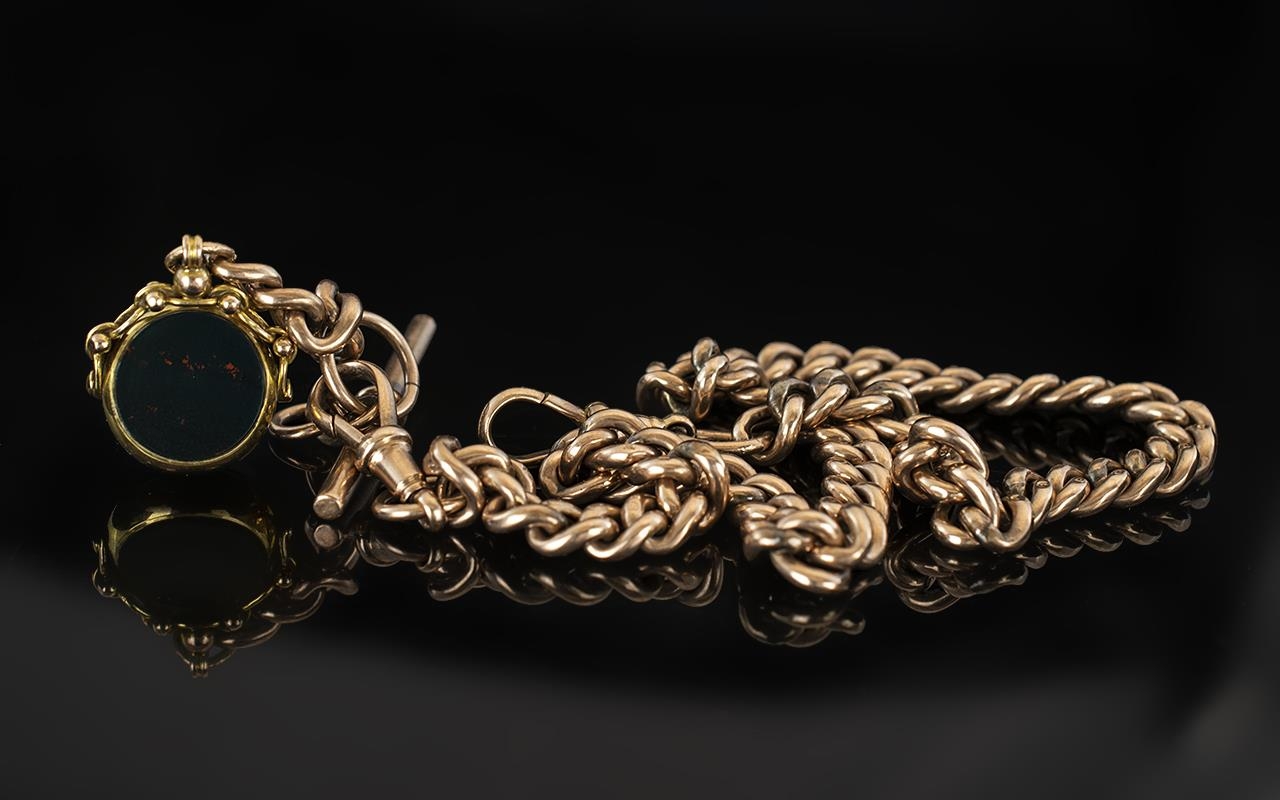 Antique Period 9ct Rose Gold Albert Chain with Attached 9ct Stone Set Swivel Fob and T-Bar. All Links Marked 9ct, Good Condition In All Aspects - Please Confirm with Photo. 16 Inches - 40 cms In length. Gold Weight 30.2 grams.