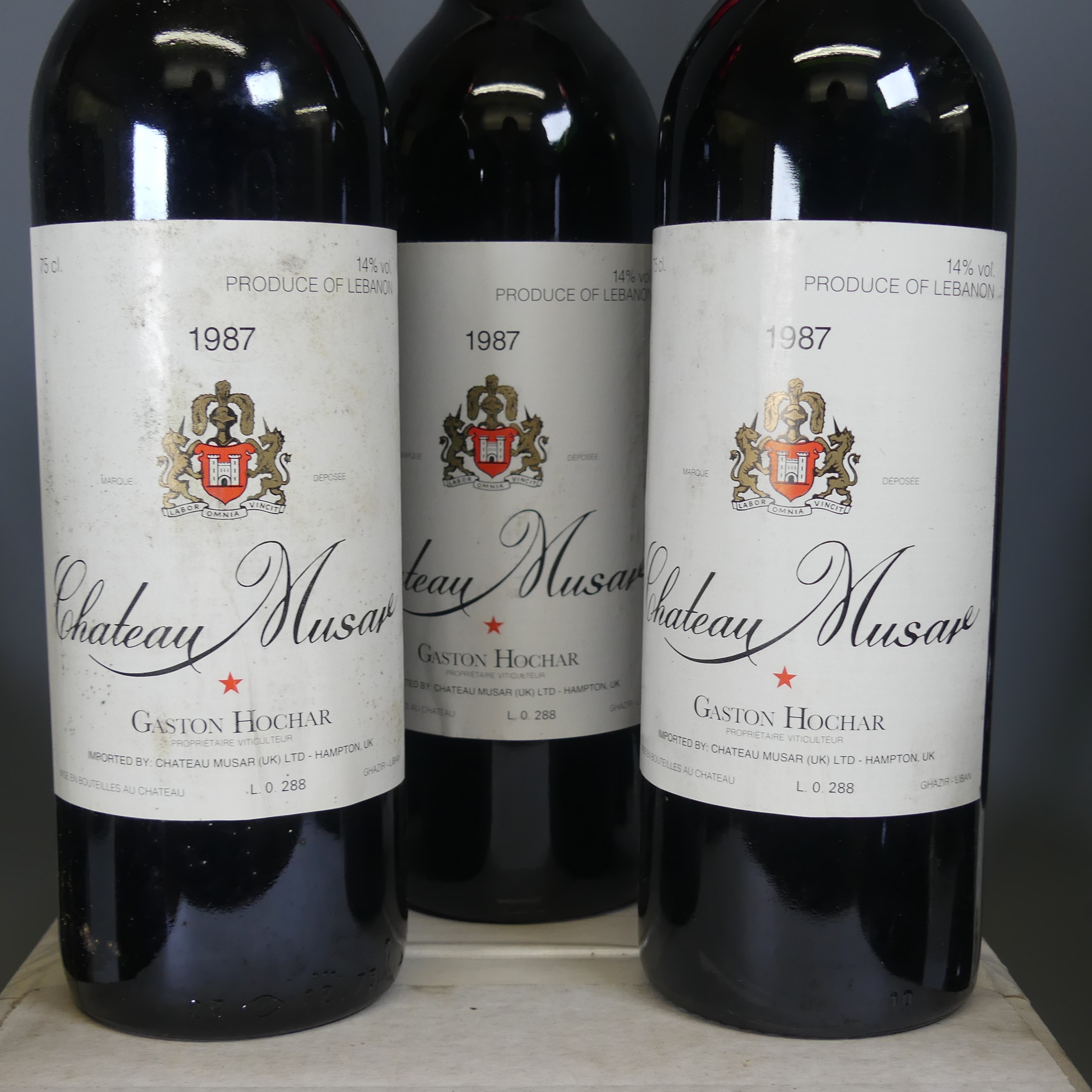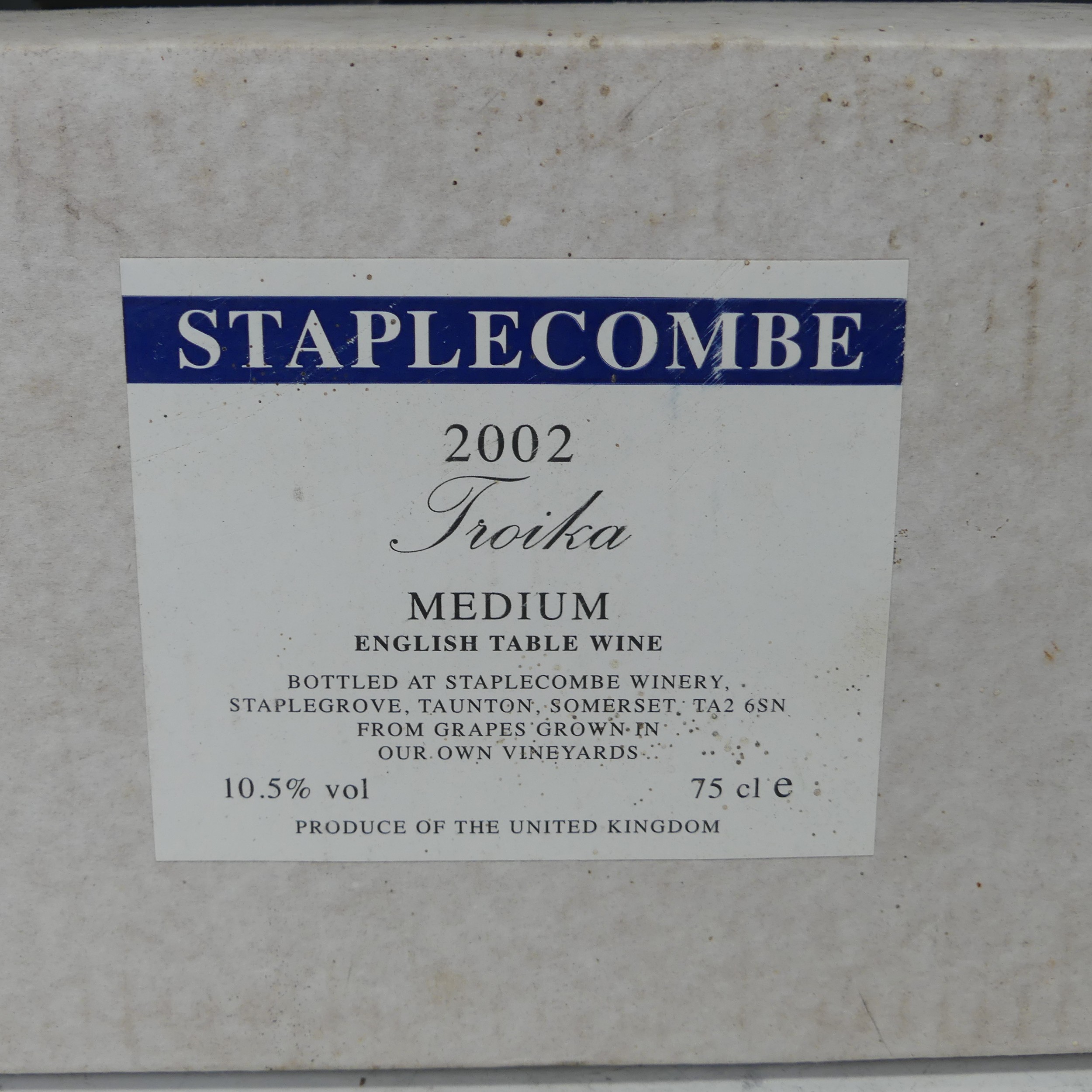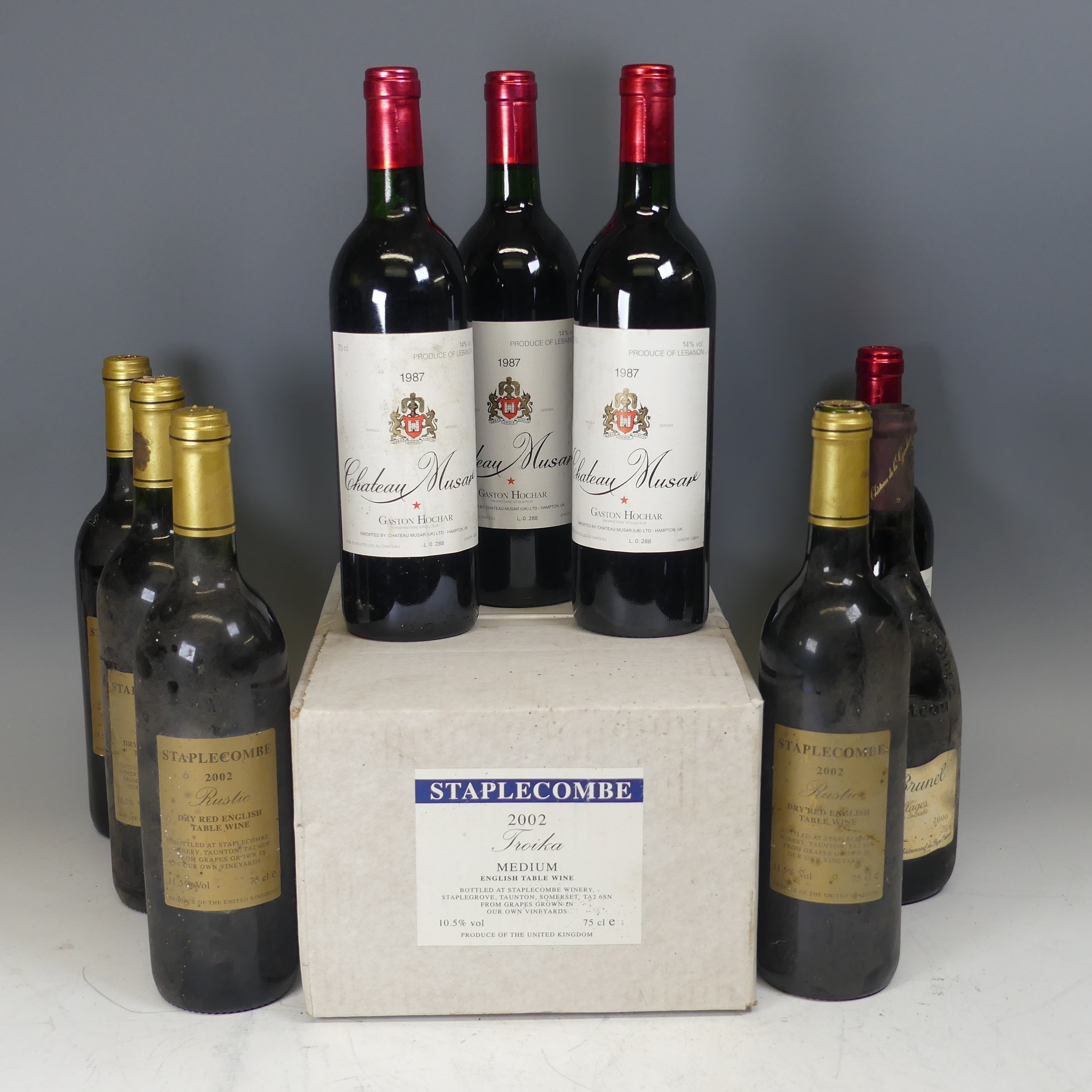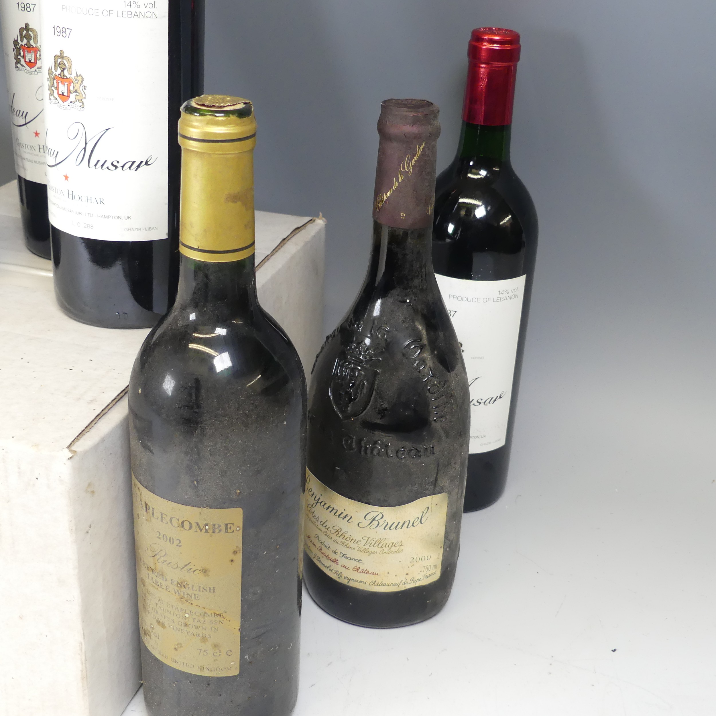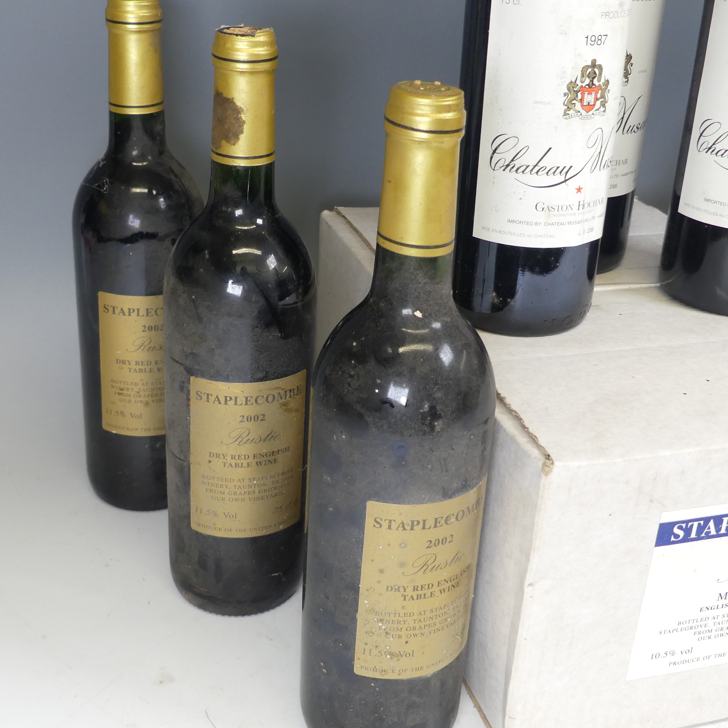 Wine: Gaston Hochar, Chateau Muscar, 1987, x four bottles, together with Benjamin Brunel, Côtes du Rhône Villages 2000, a box of six bottles of Staplecombe Troika 2002 Medium English Table Wine, and four Staplecombe Rustic Dry Red English Wine, the latter with dirty bottles with damaged foil covers. (15)