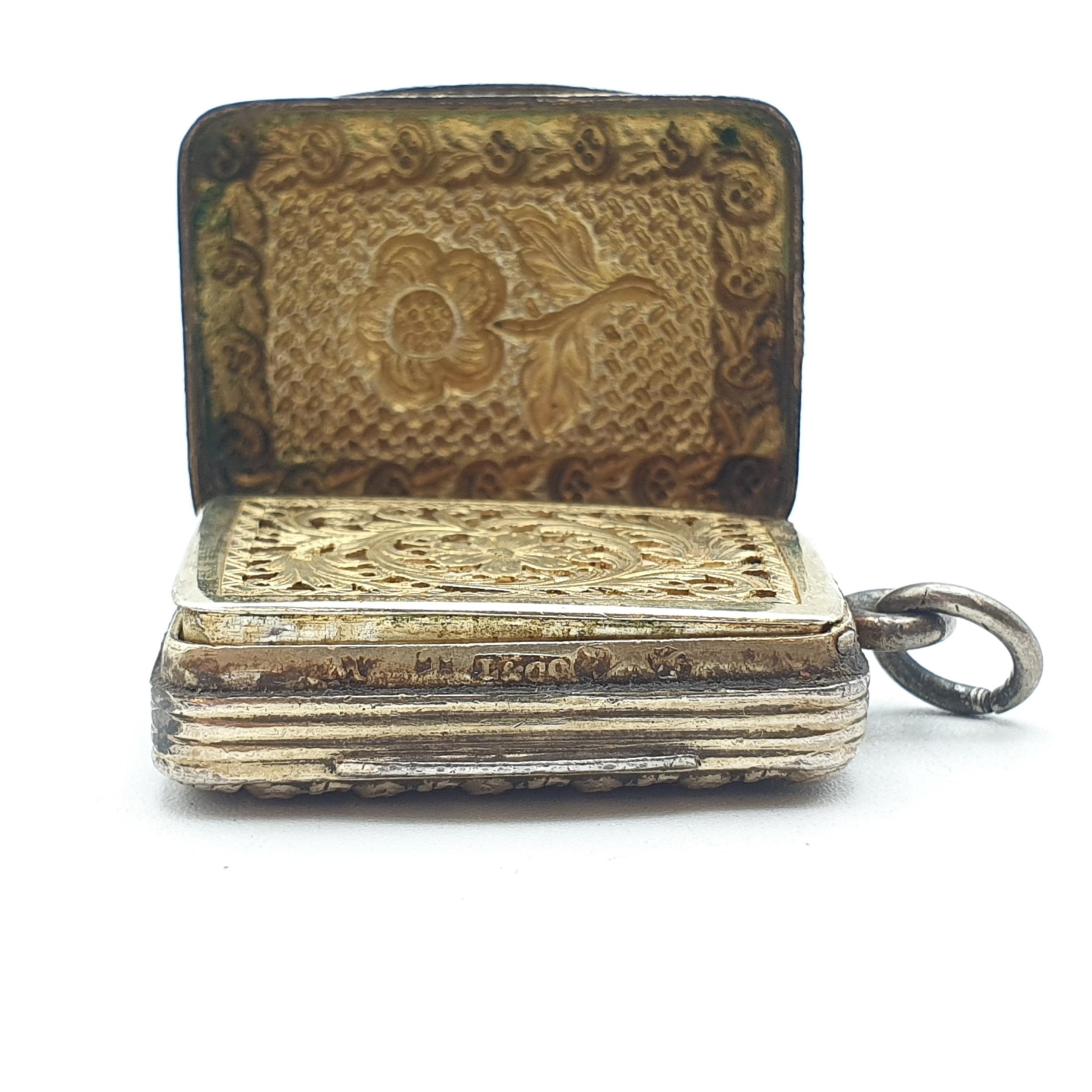 A silver and silver-gilt Vinaigrette with repoussé decoration to front and back and engraved cut-out detail to the cover inside, 40mm x 23mm approx (including bail), and a Toothpick Holder containing a silver toothpick stamped SILVER