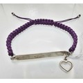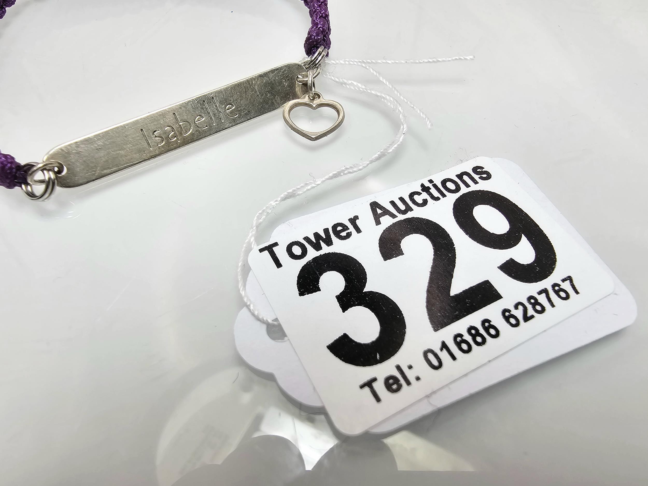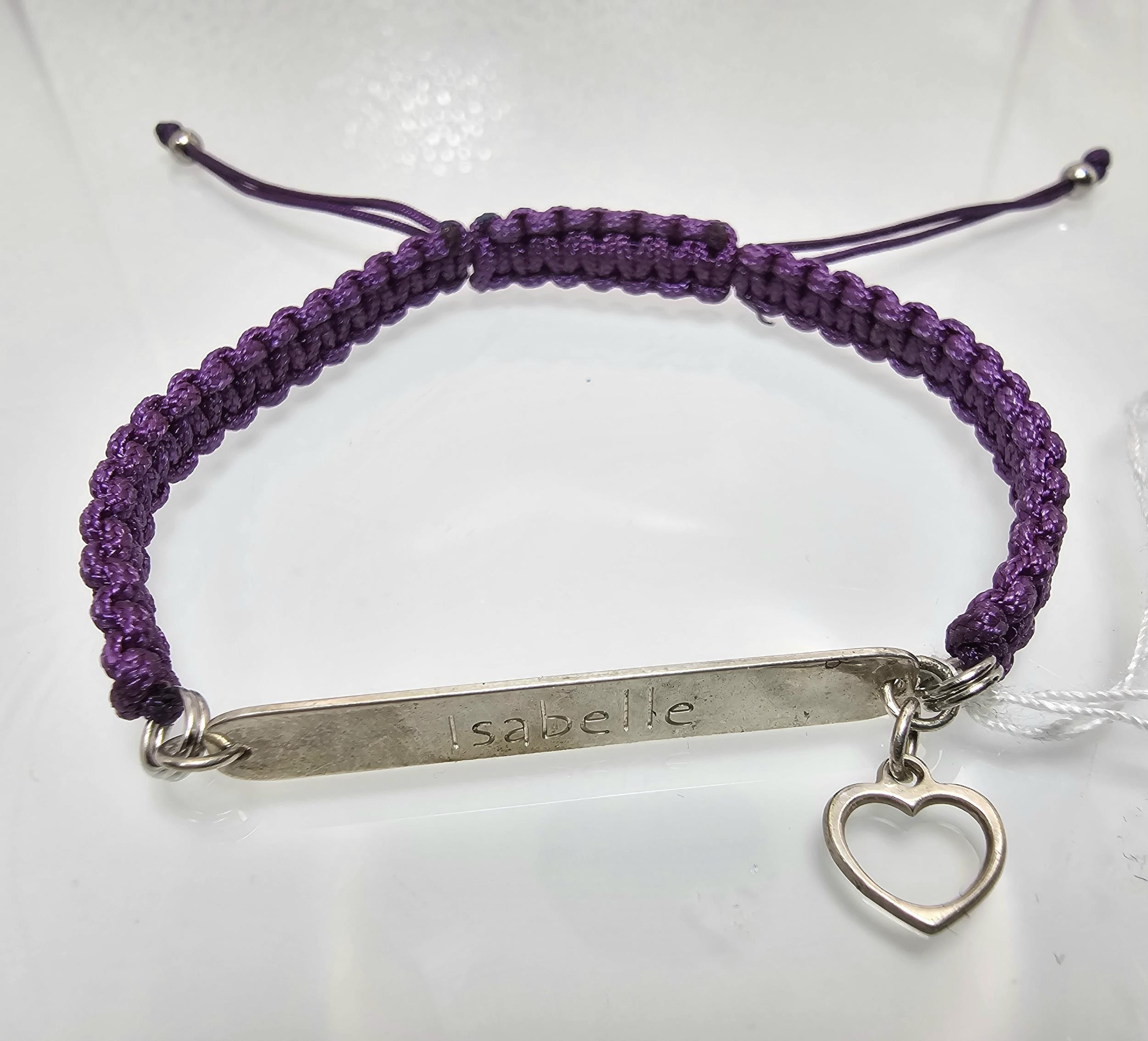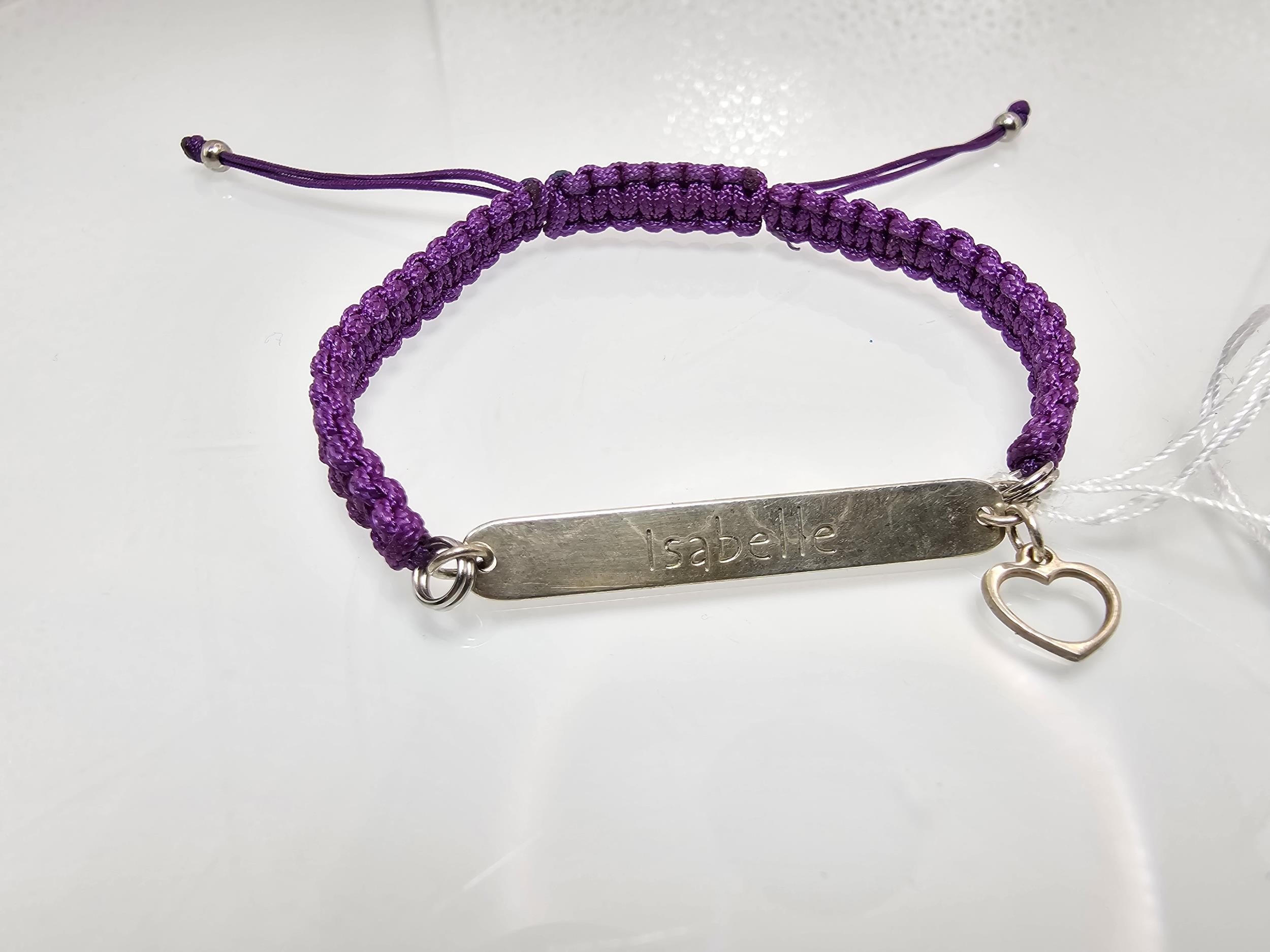 A braided cord 925 Silver length adjustable bracelet having a 925 Silver plaque marked Isabelle with a silver heart charm.