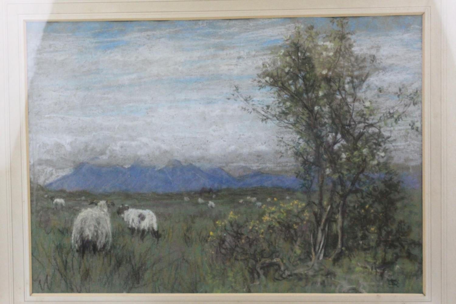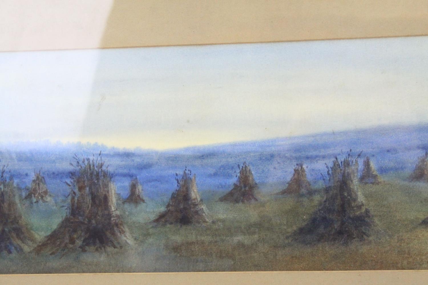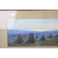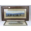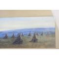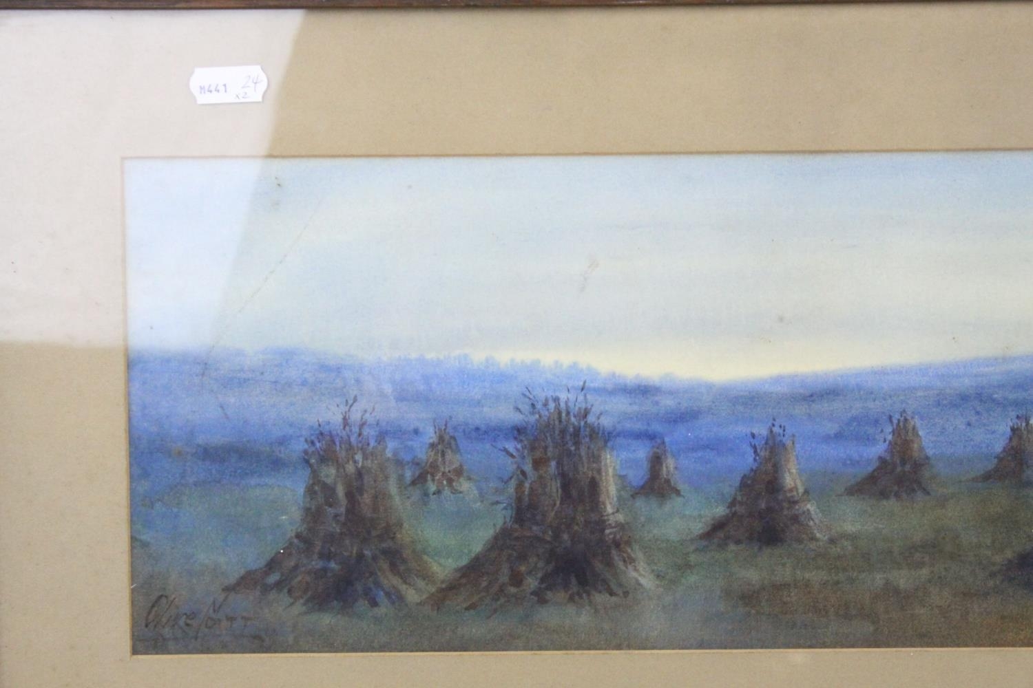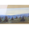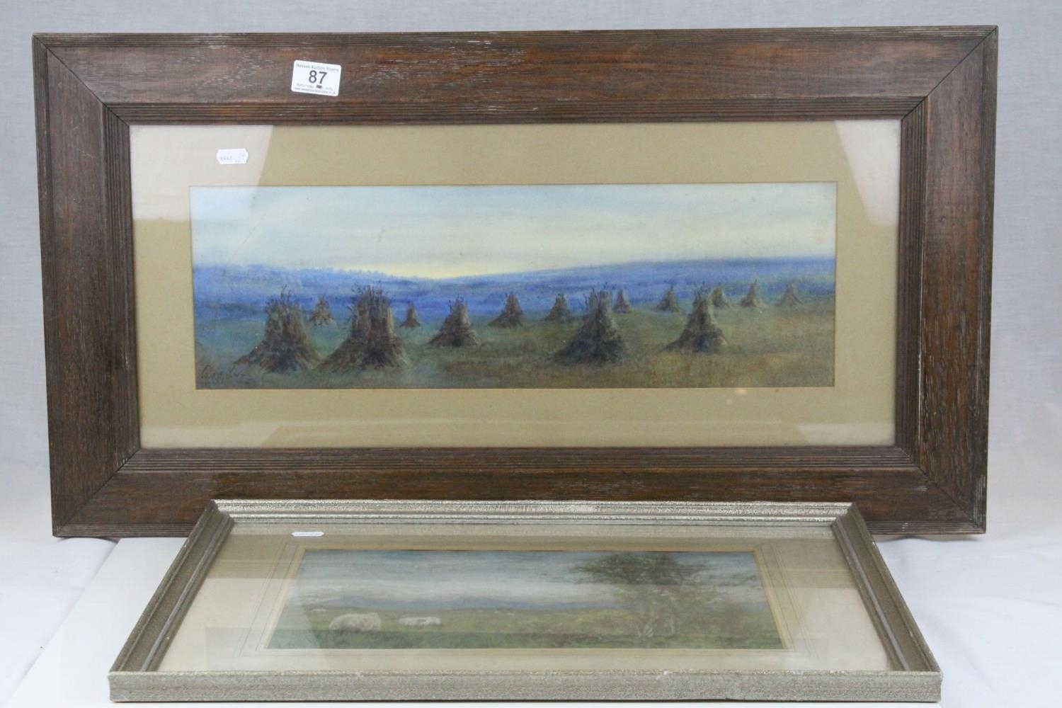 Watercolour of Hay Ricks signed lower left Olive Neatt?, 53cms x 17cms, oak framed and glazed together with a Pastel of Sheep with Mountains behind, monogram signature, 35cms x 24cms, framed and glazed