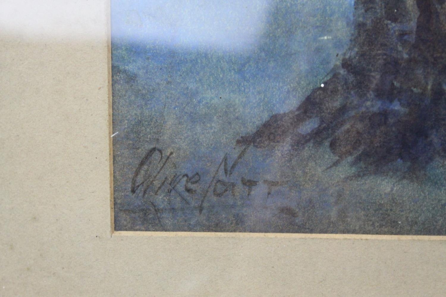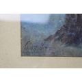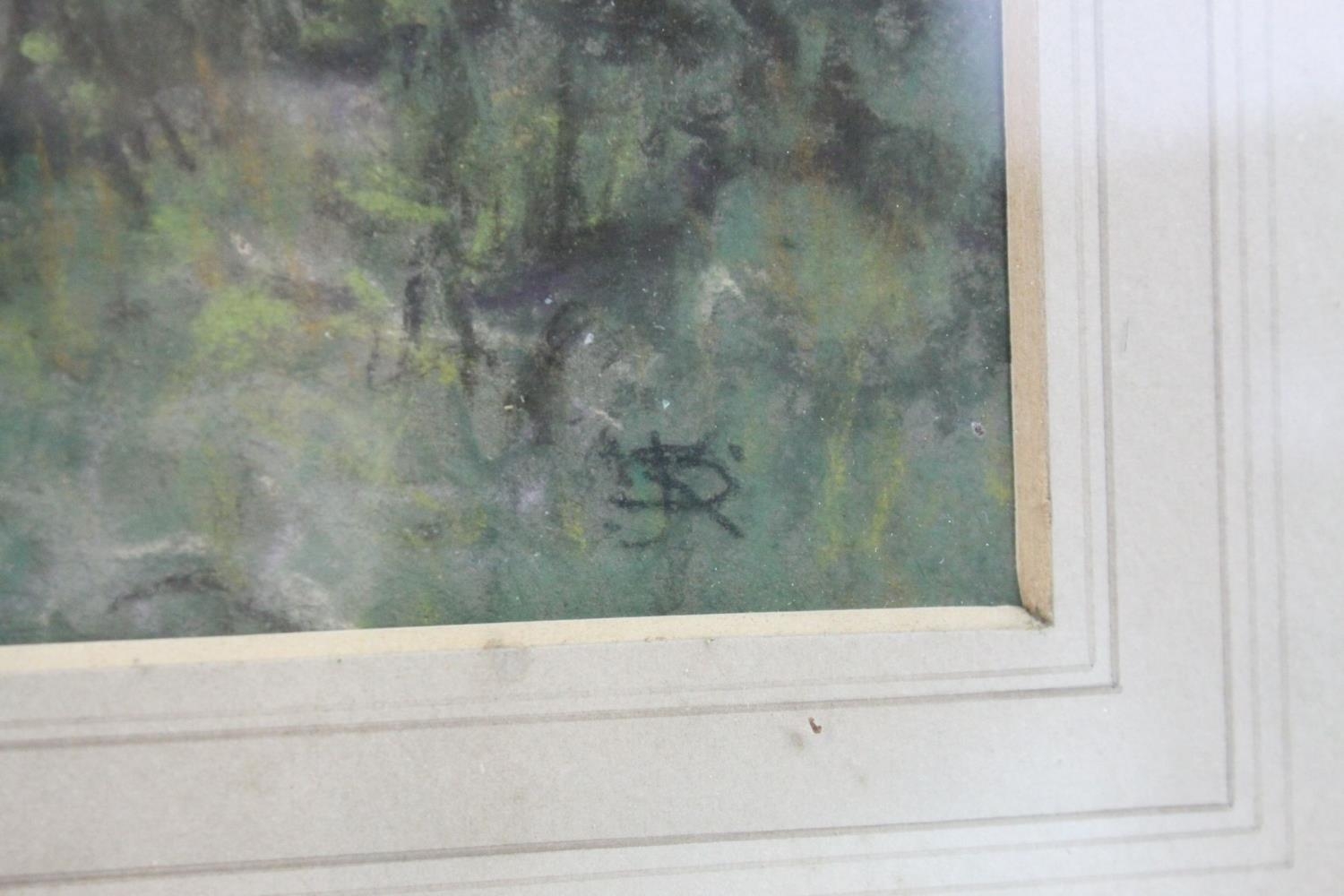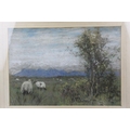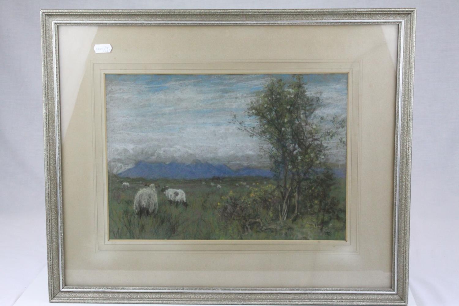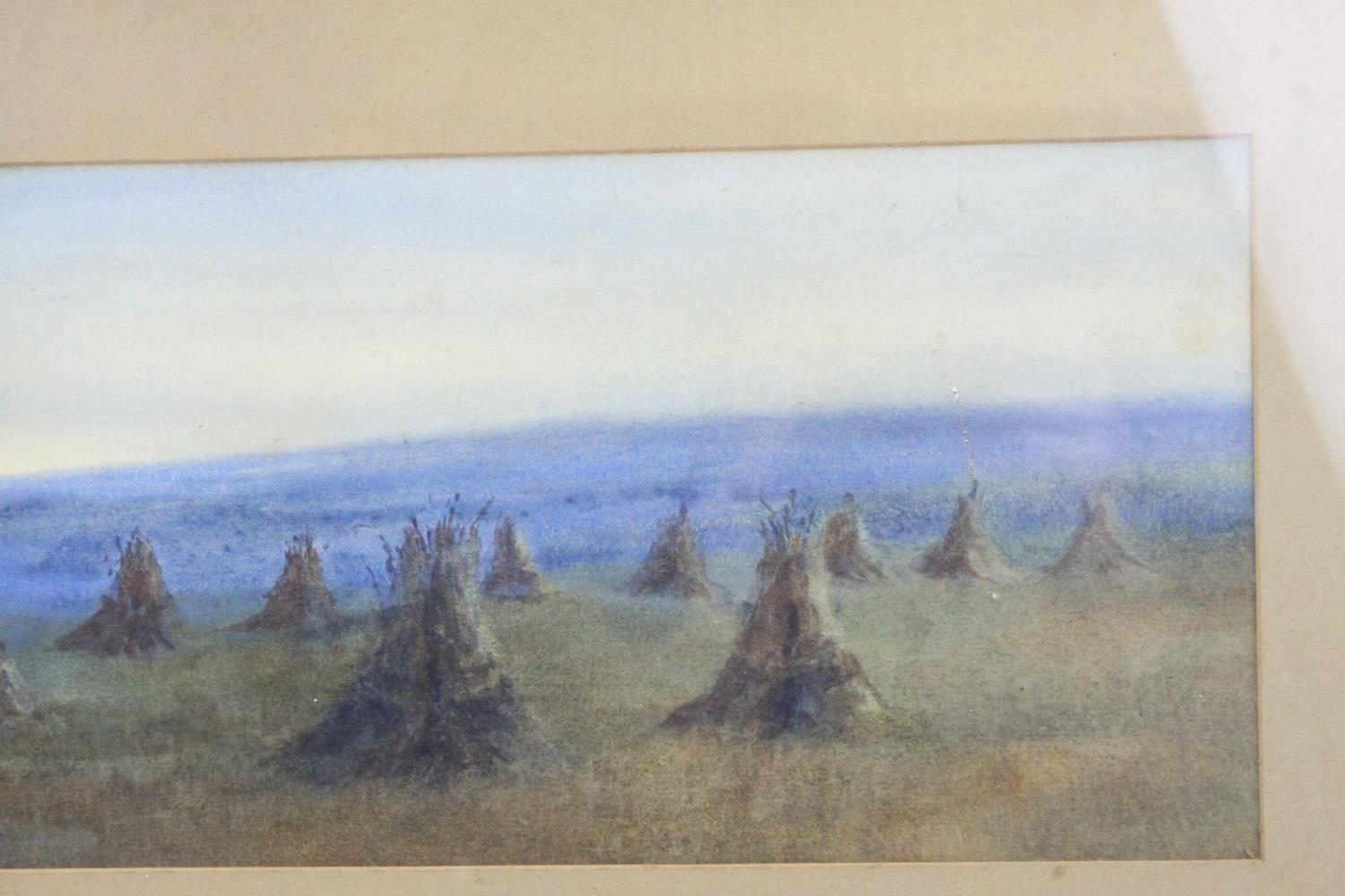 Watercolour of Hay Ricks signed lower left Olive Neatt?, 53cms x 17cms, oak framed and glazed together with a Pastel of Sheep with Mountains behind, monogram signature, 35cms x 24cms, framed and glazed