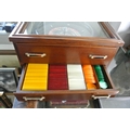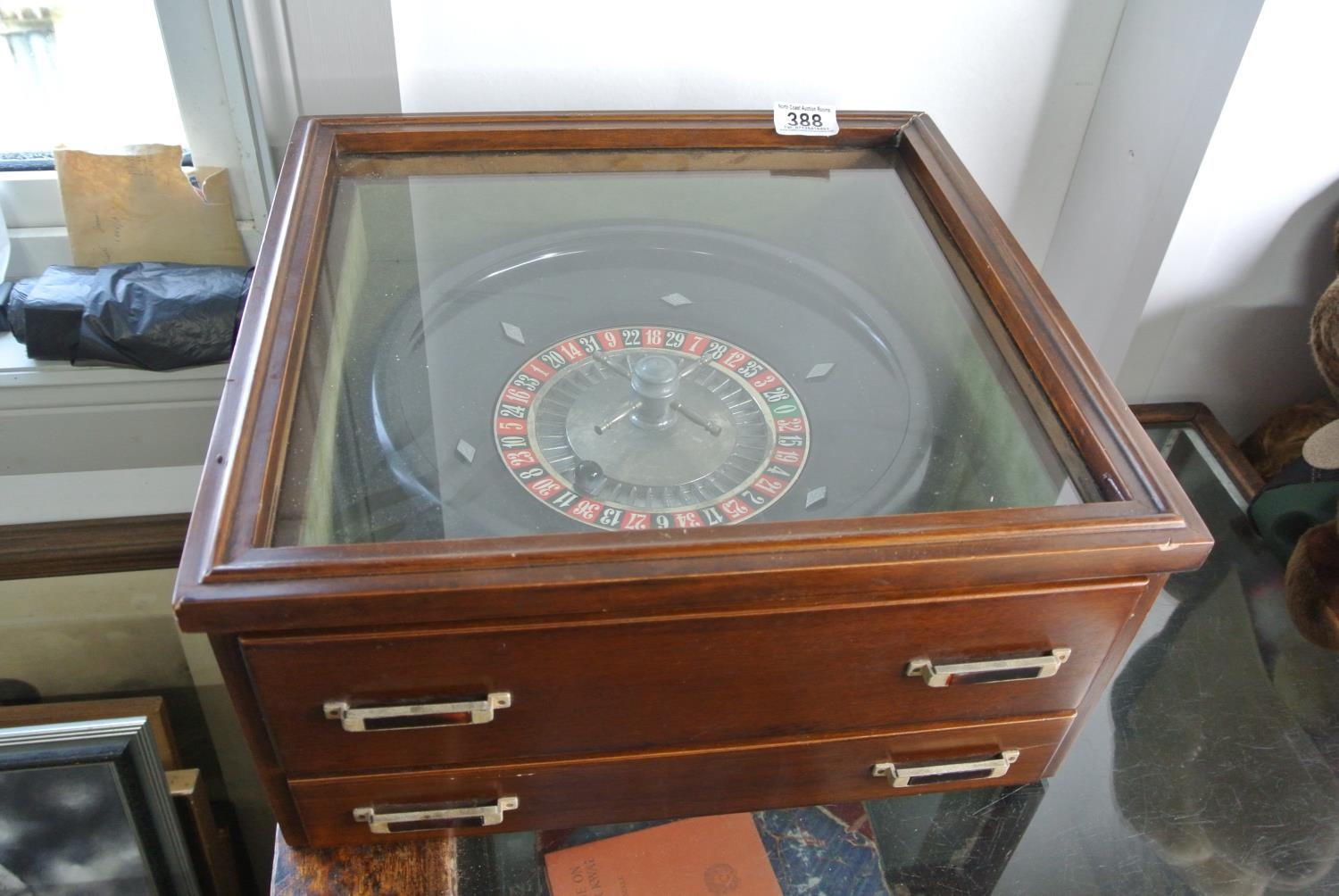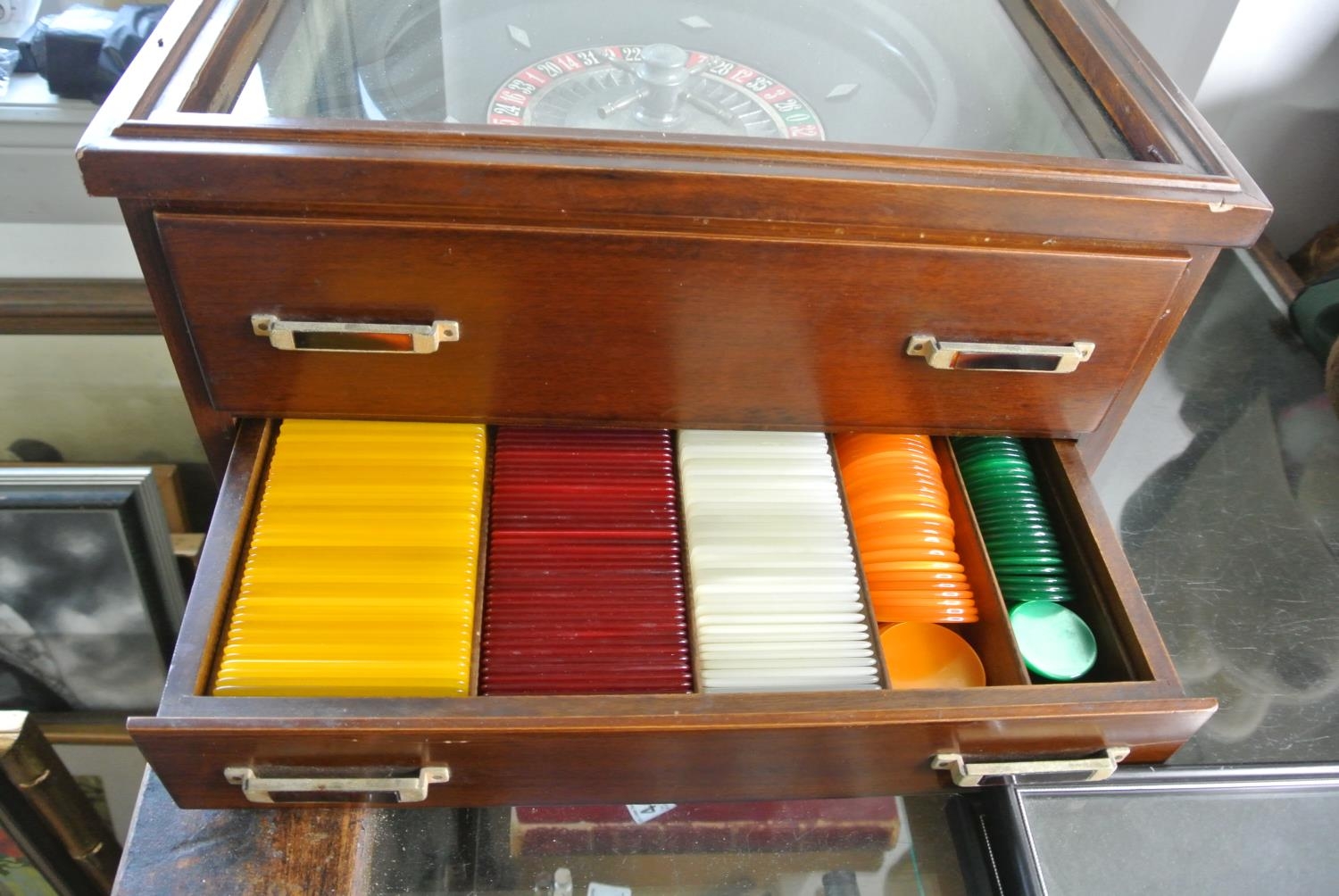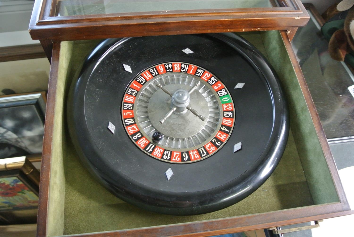 An oak cased tabletop Roulette Wheel along with mat and chips