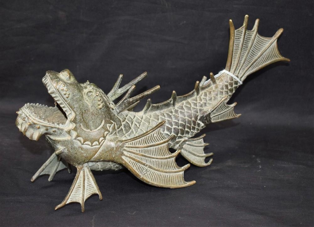 A 20th century bronze coloured metal Dragon Fish, modelled open mouthed, cast character marks, 32.5cm long