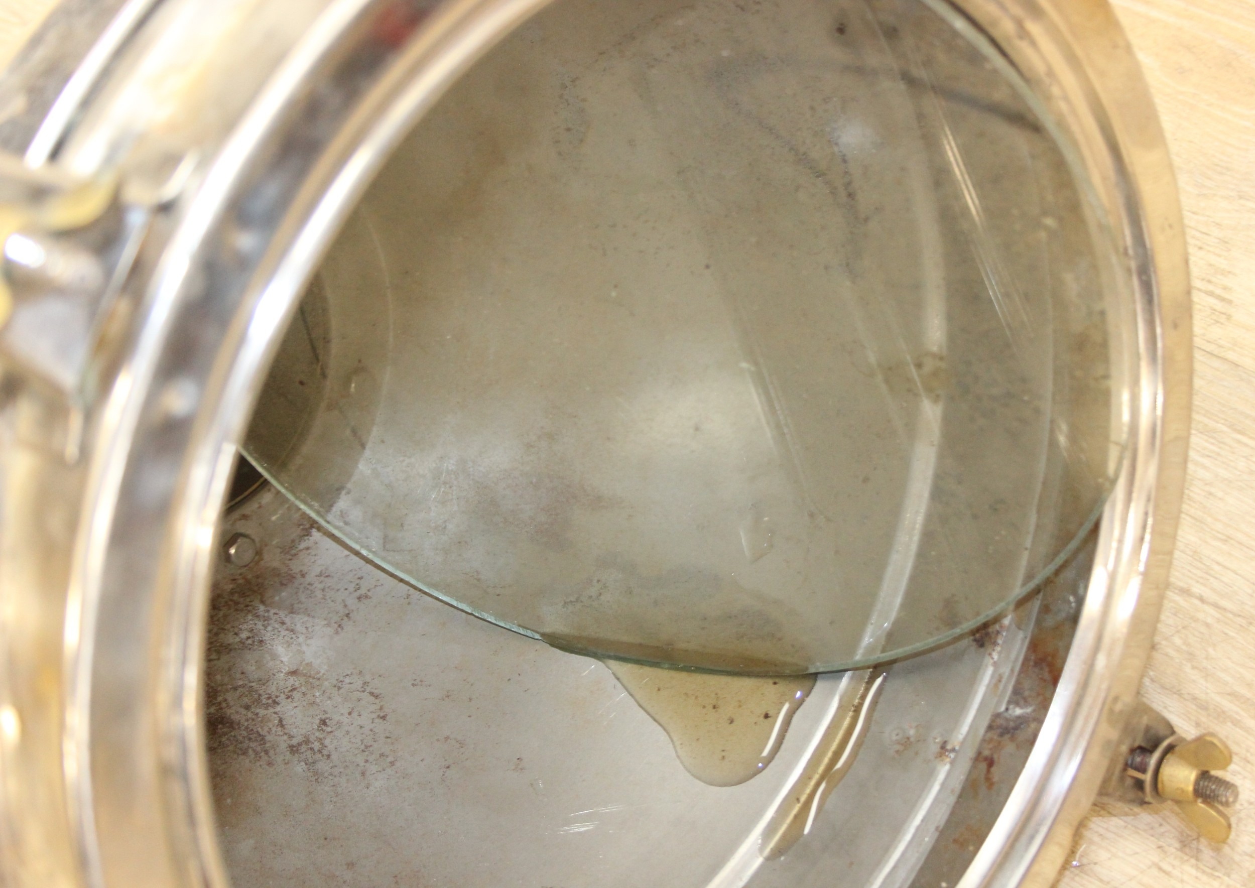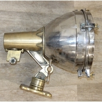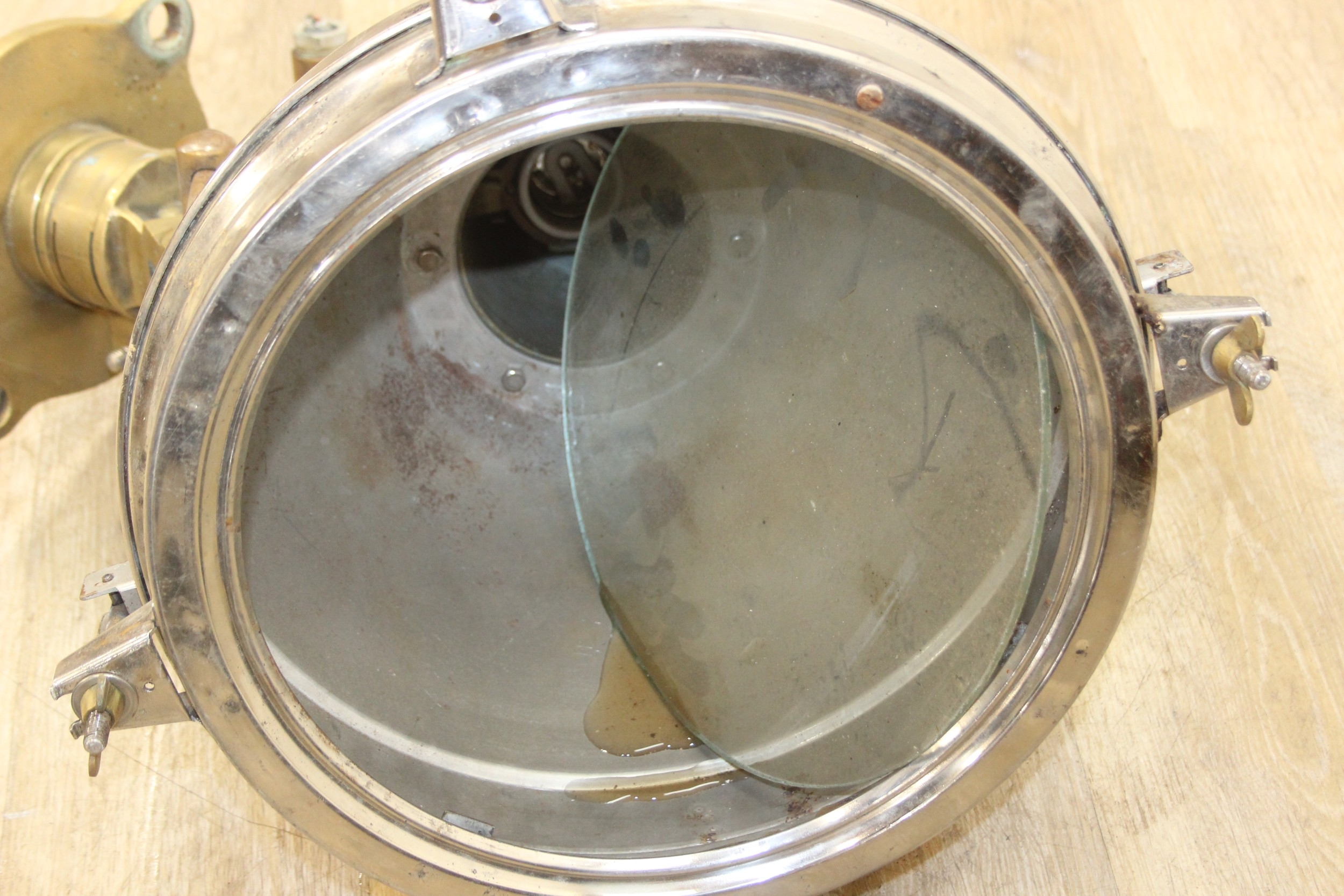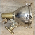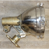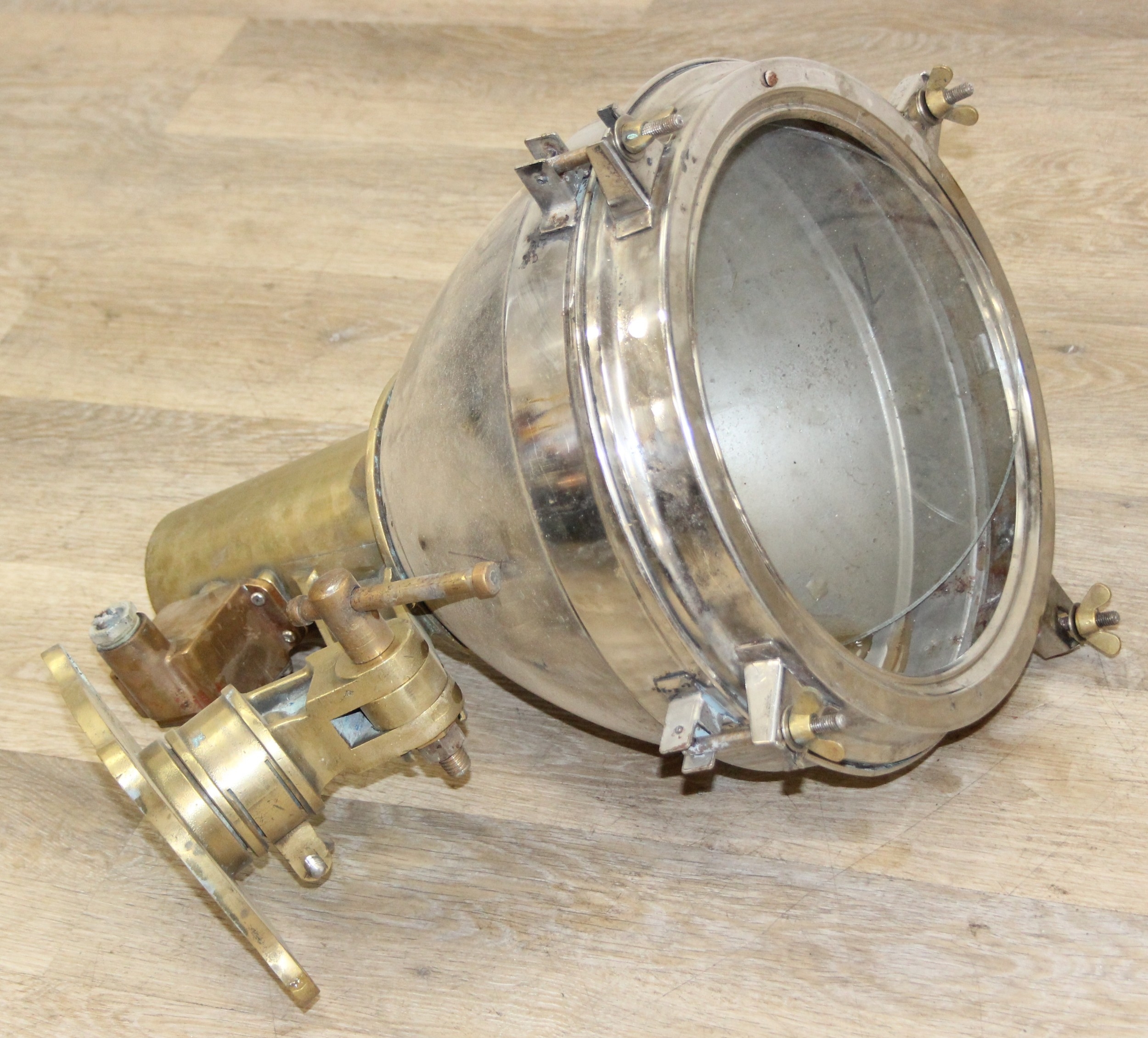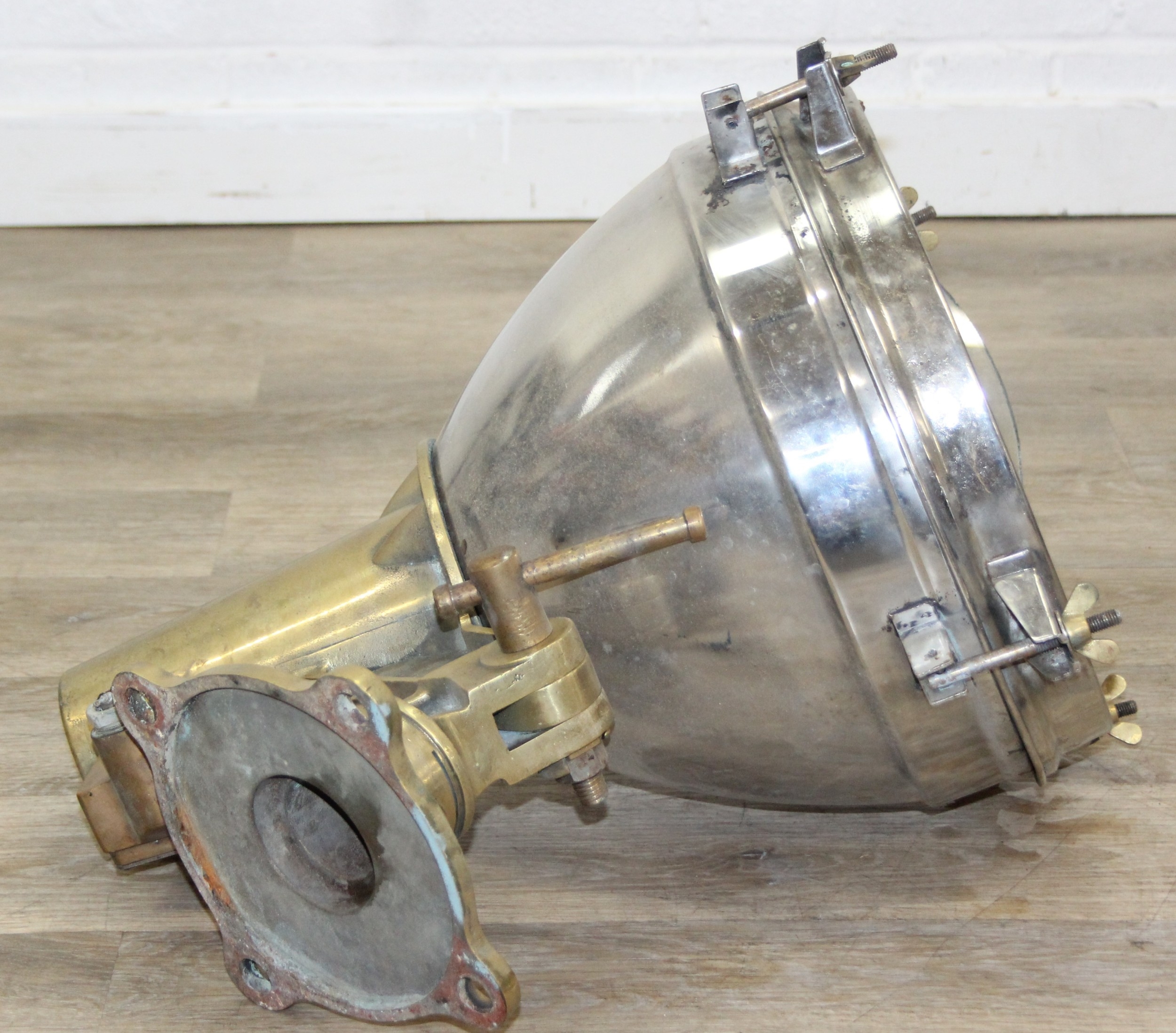 Marine lamps - chrome and brass lamp with heavy duty brass bracket and four wingnut fastenings to lens, loose glass, diameter 34cm x depth 50cm excluding bracket