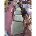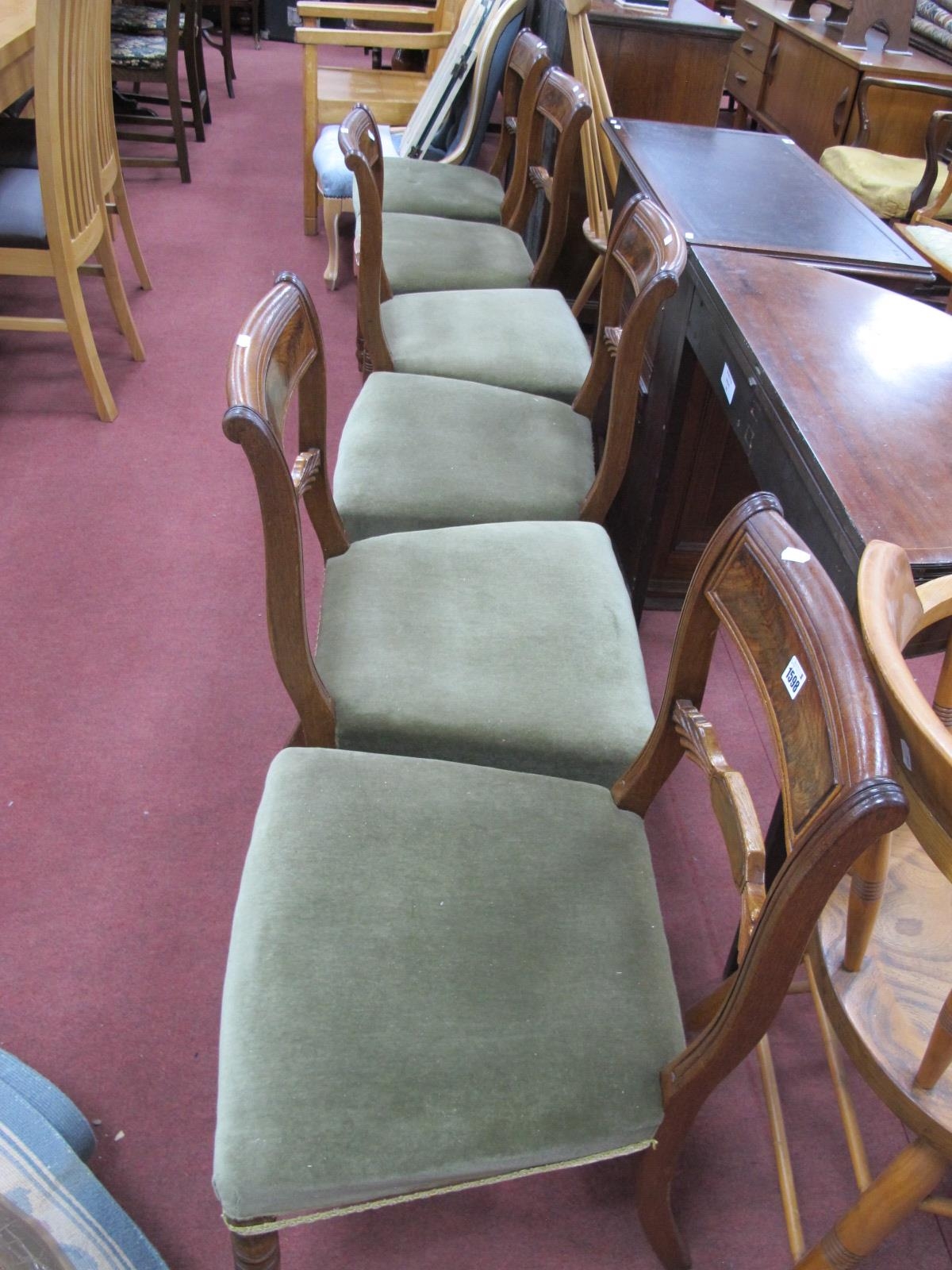 A Set of Six Regency Chairs, with a rectangular top rail, central rail, upholstered seats, on turned forefront legs.