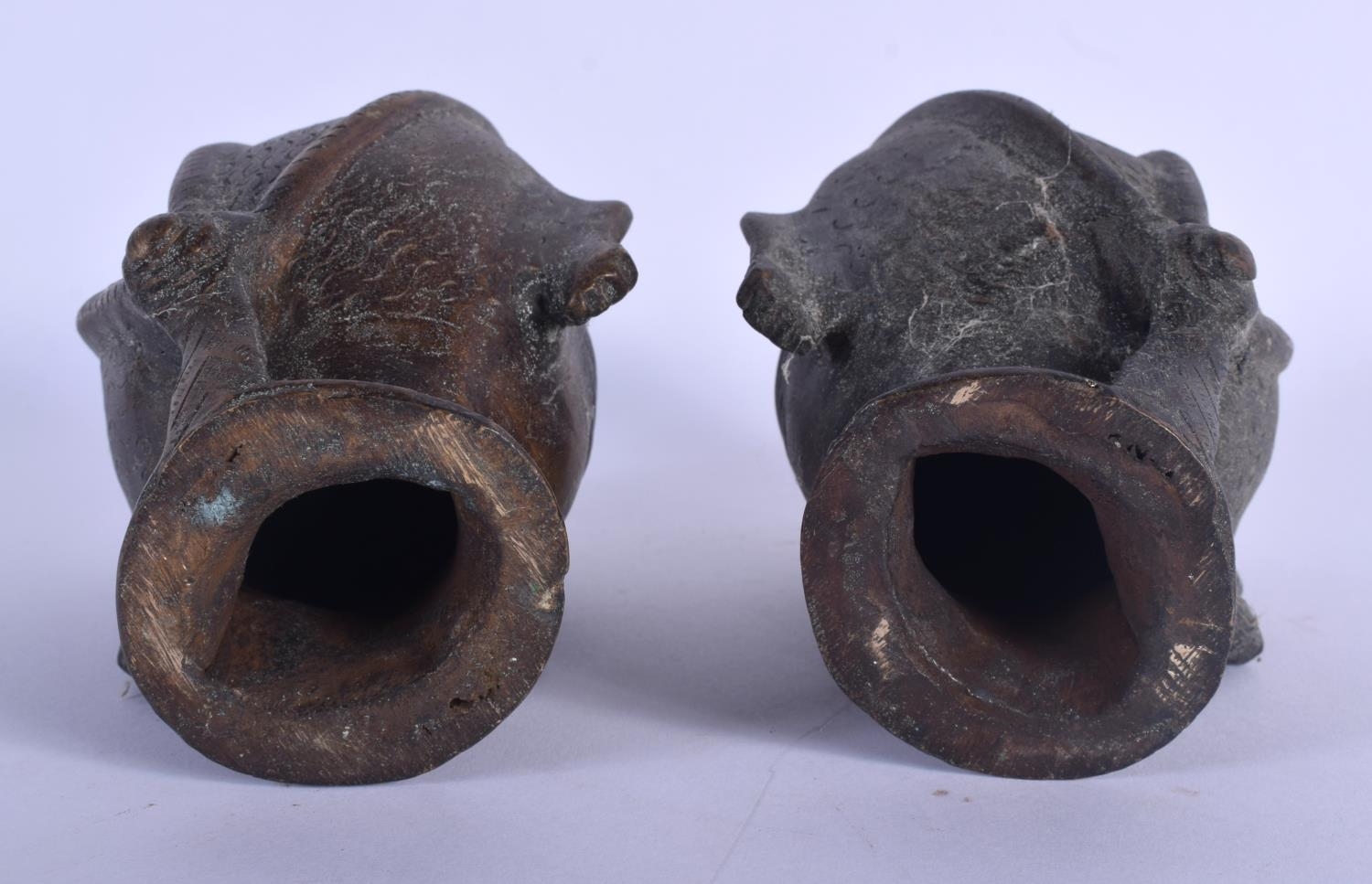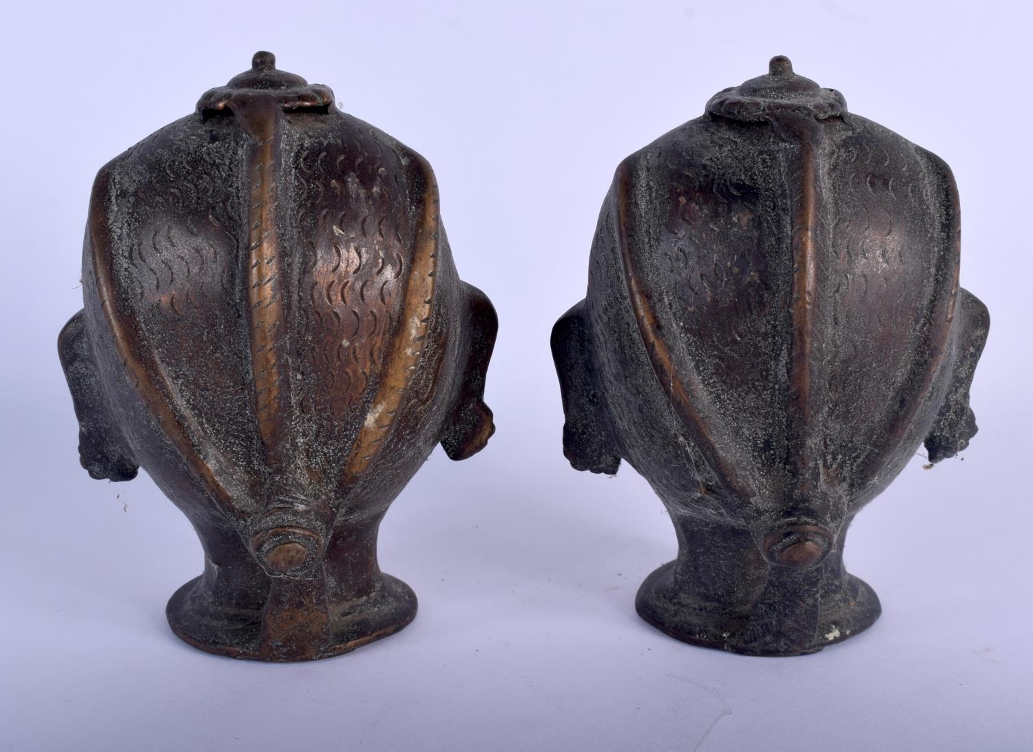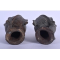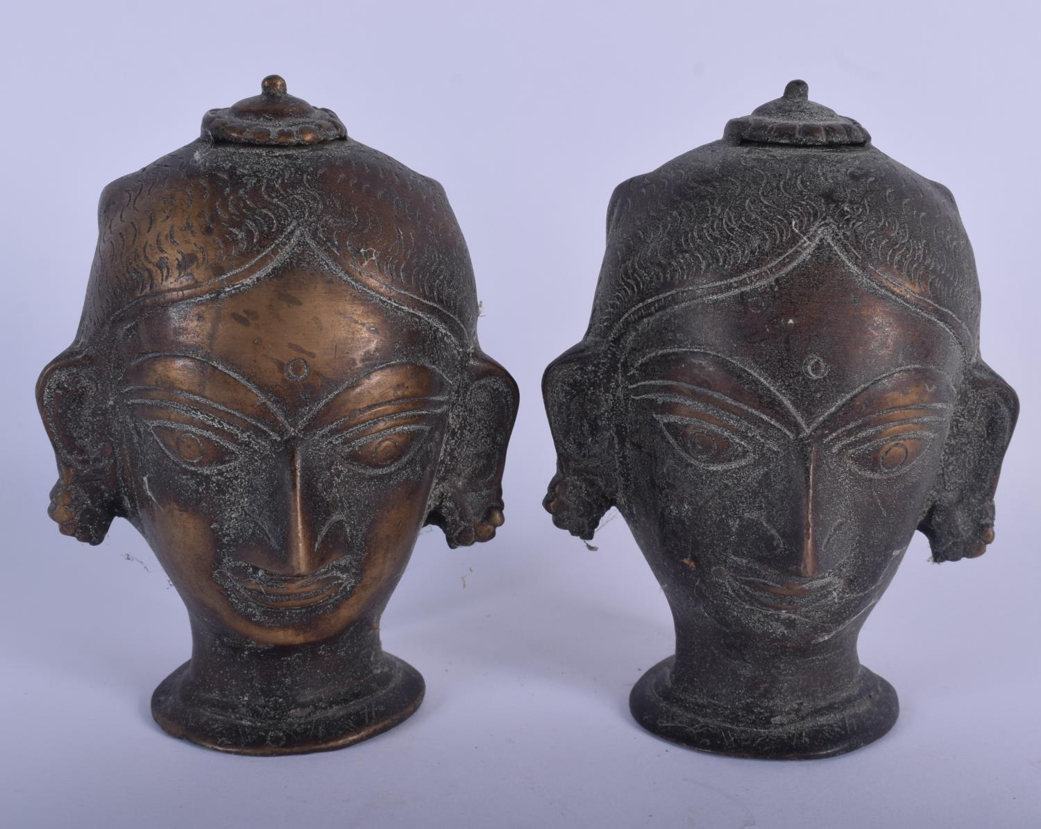 A PAIR OF ANTIQUE INDIAN BRONZE HINDU BUDDHISTIC HEADS. 14 c...